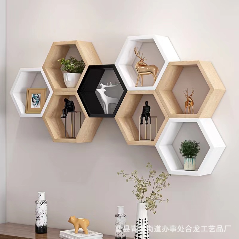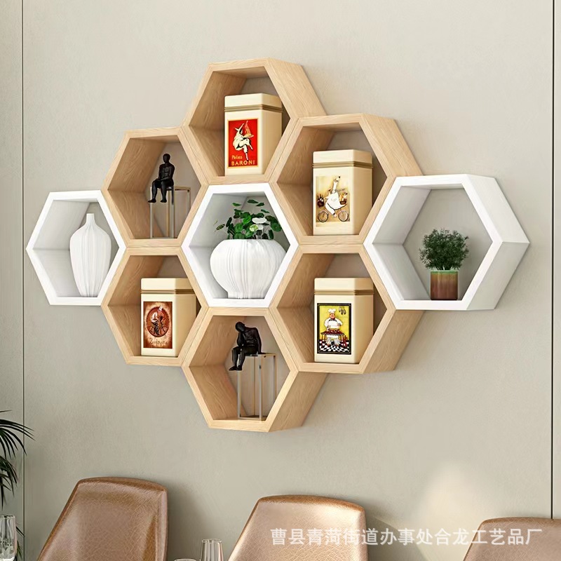 木质六边形蜂窝置物架创意墙上置物架背景墙装饰隔板书房壁挂书架