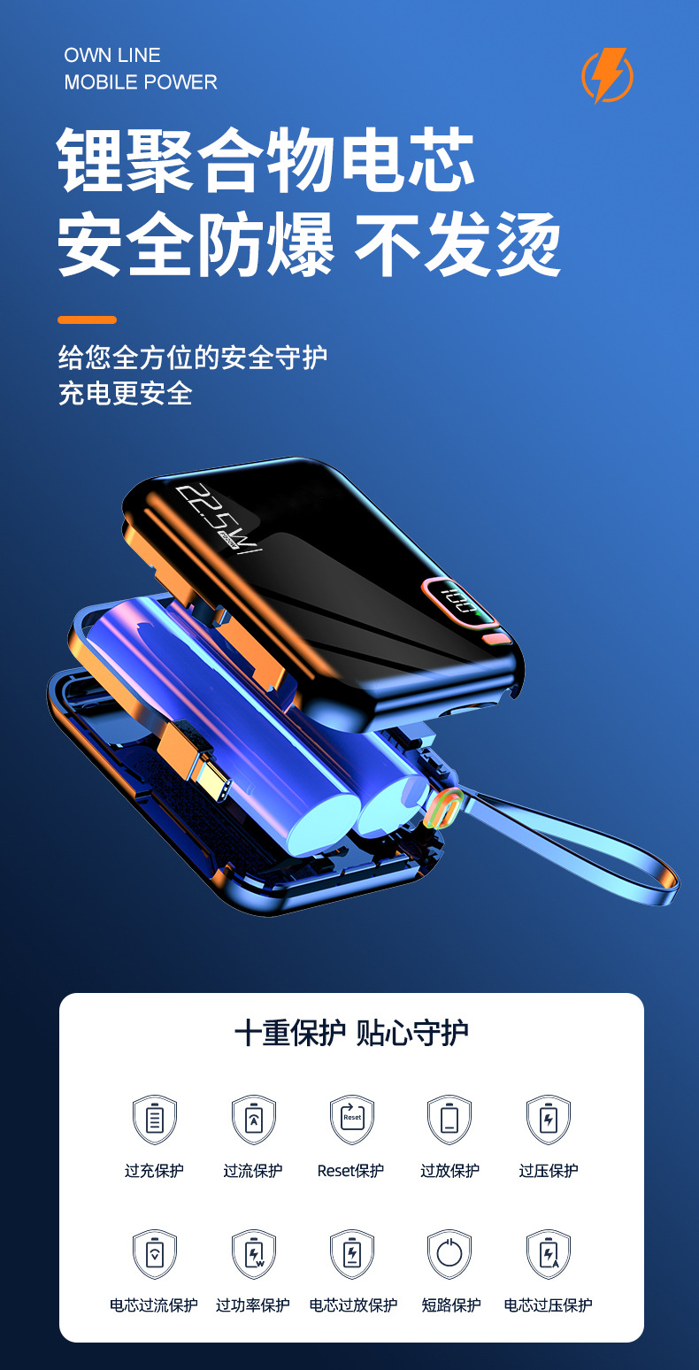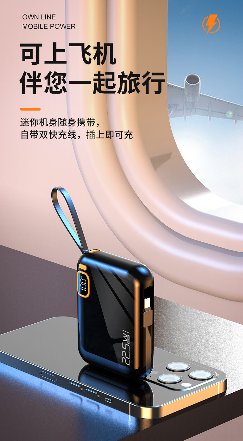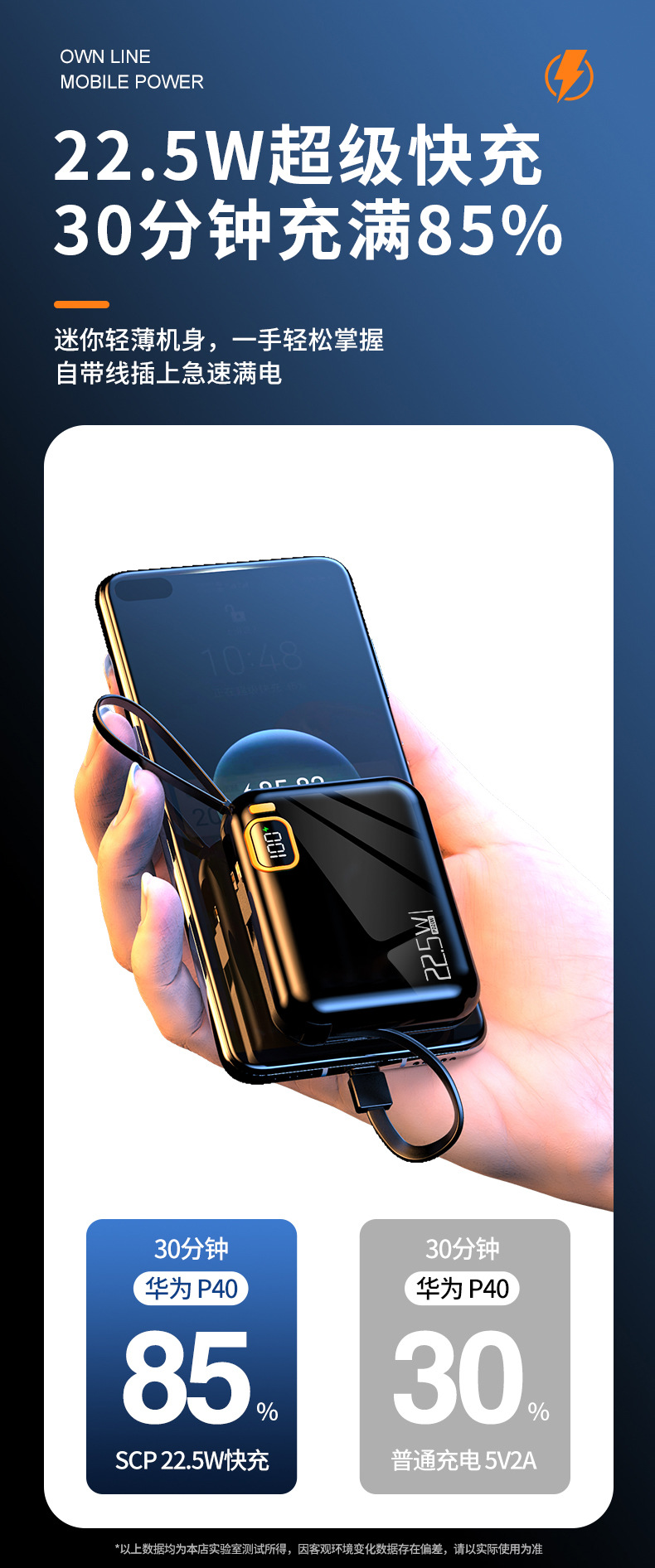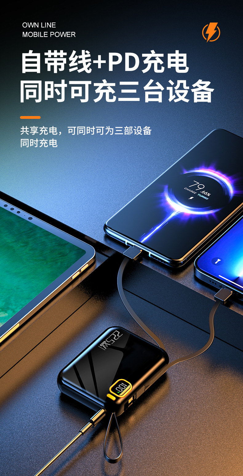 22.5W超级快充充电宝10000毫安PD双向快充迷你自带线移动电源批发
