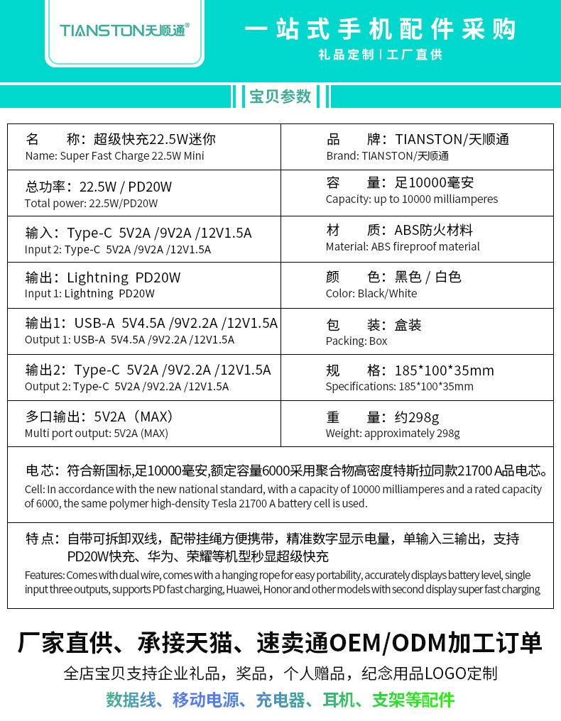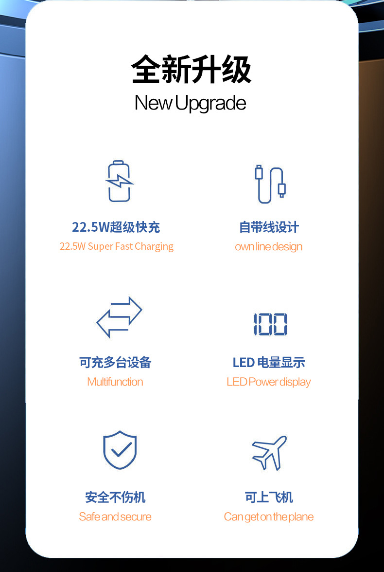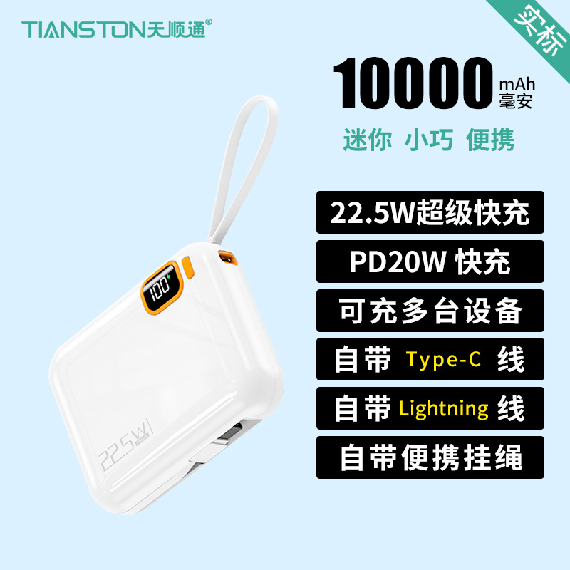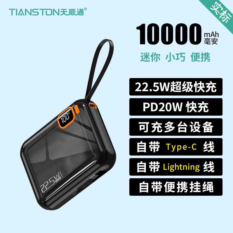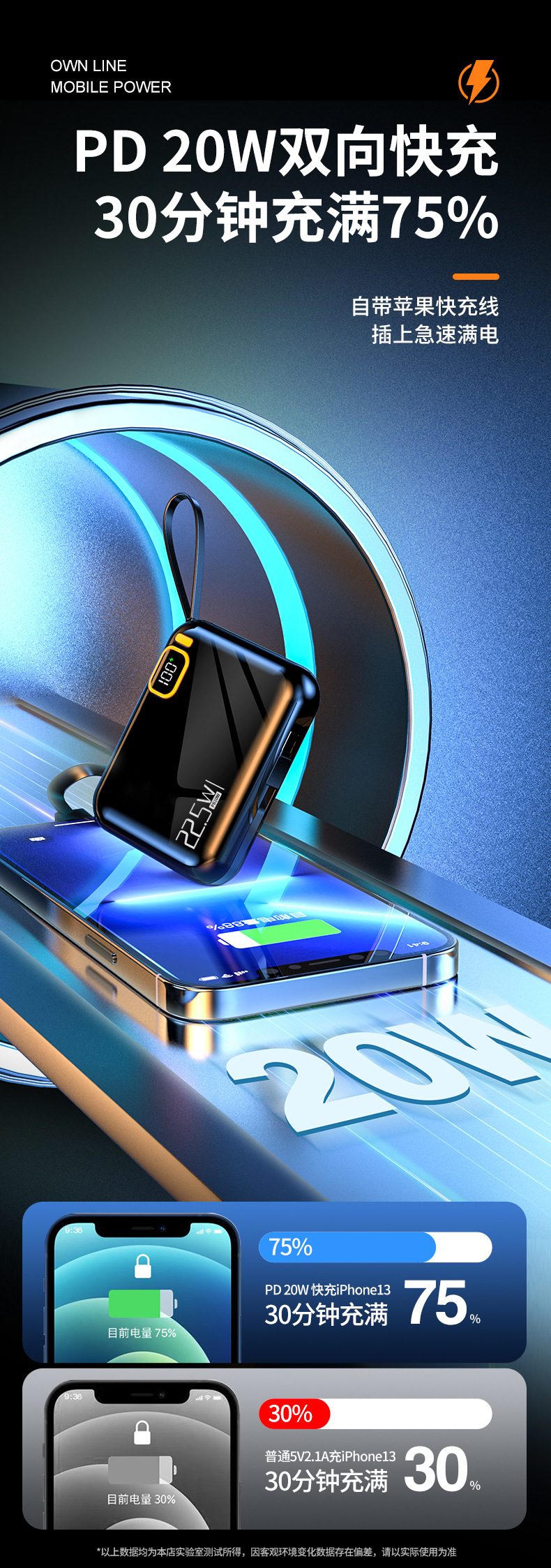 22.5W超级快充充电宝10000毫安PD双向快充迷你自带线移动电源批发