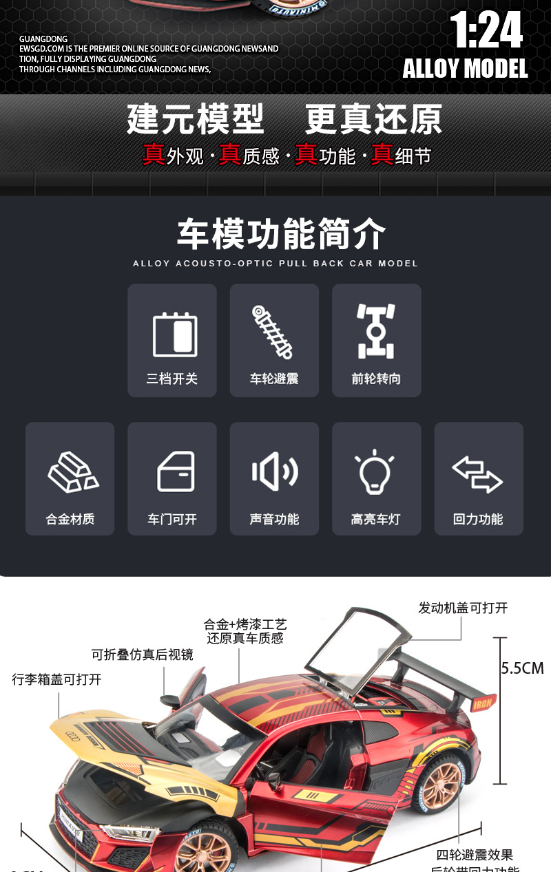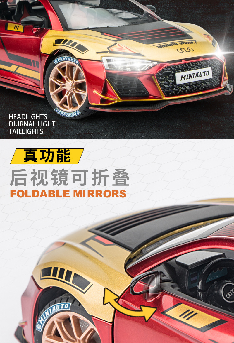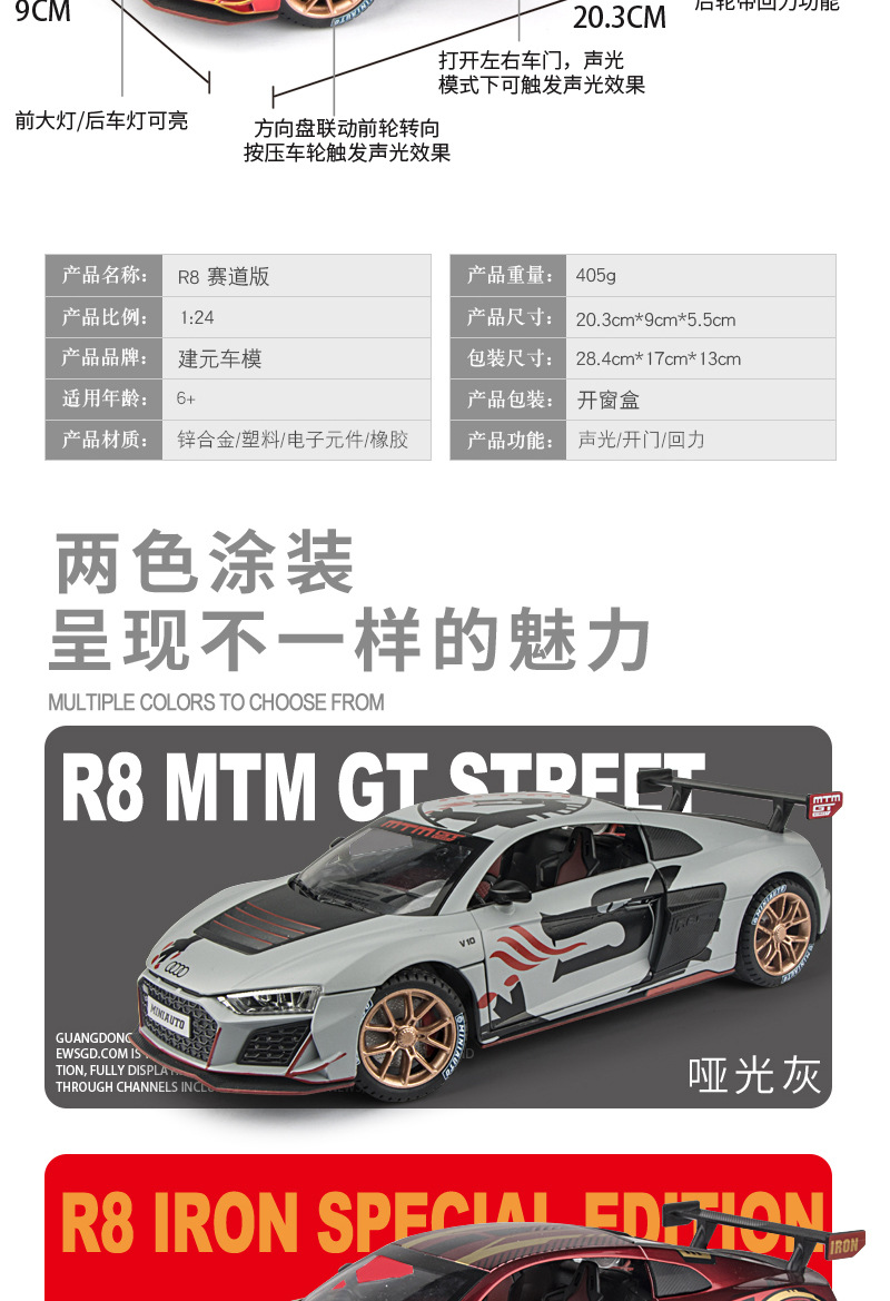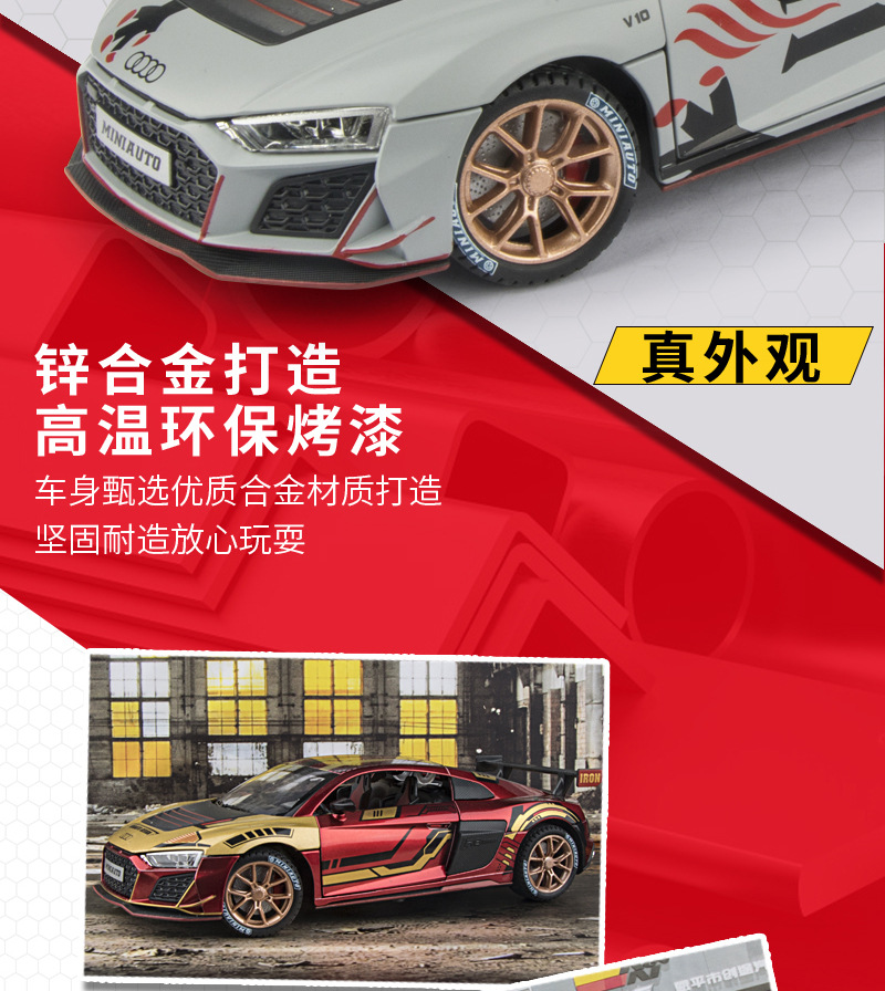 合金玩具1:24奥迪R8赛道版合金车模跑车金属玩具摆件仿真汽车模型