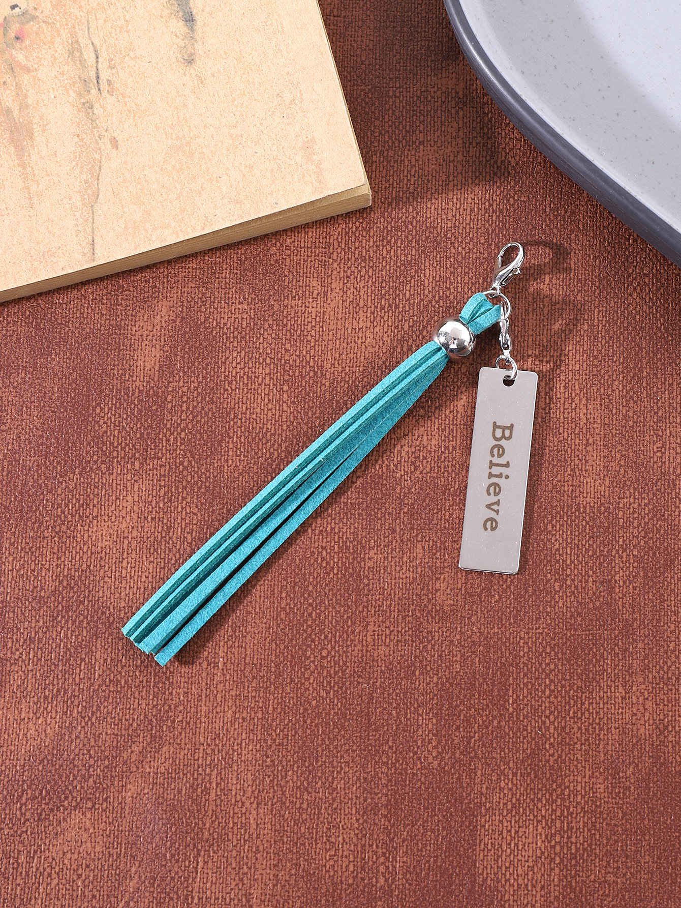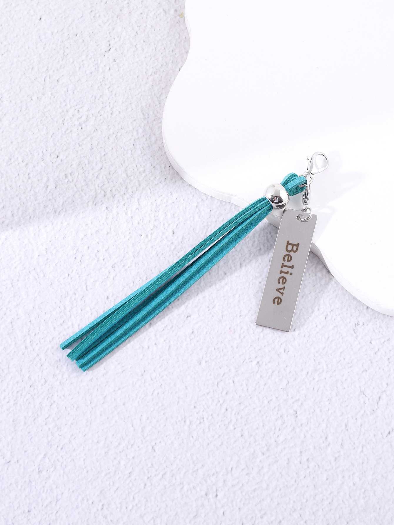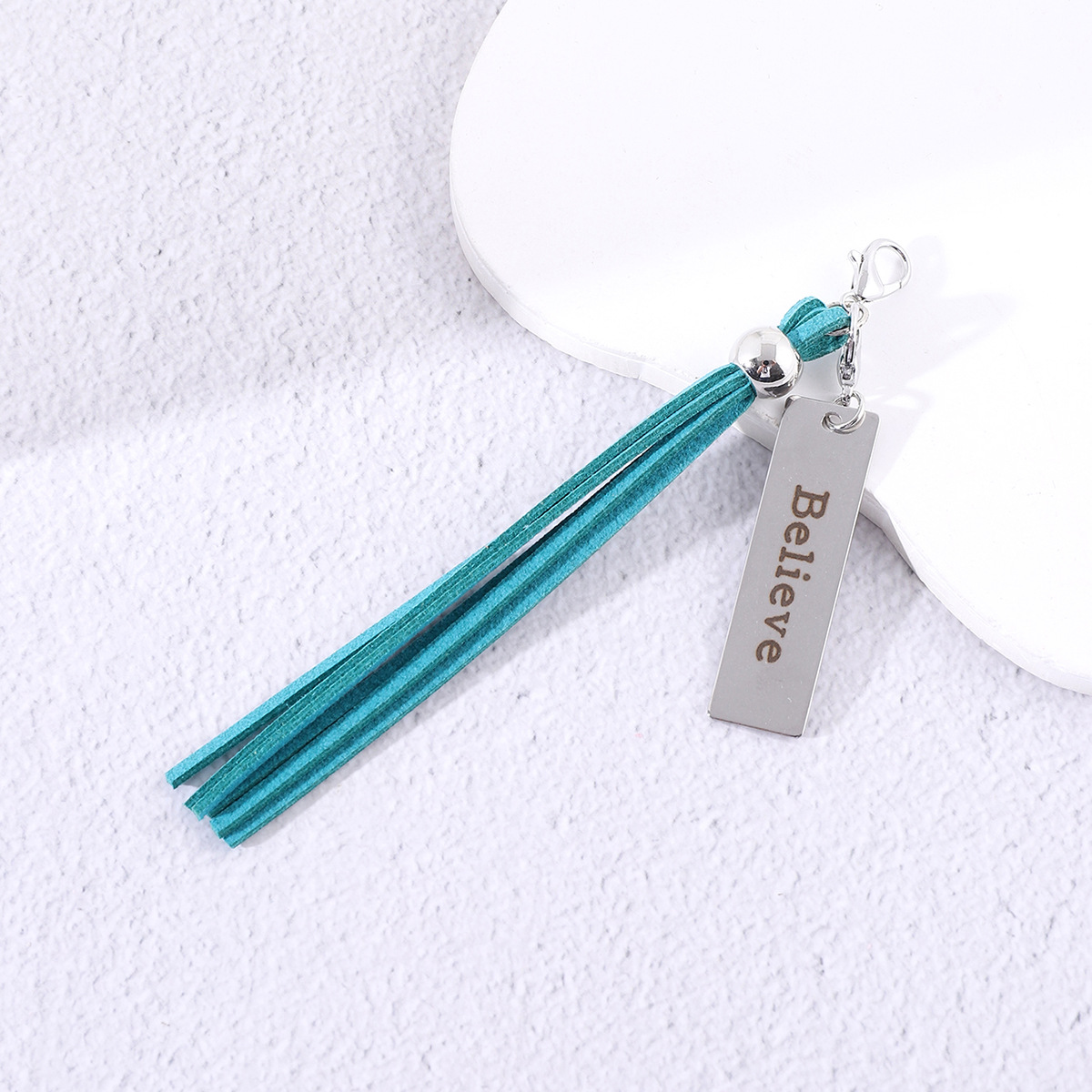 新款蓝色韩国绒流苏钥匙扣挂件长款英文字母皮革配件跨境欧美亚马