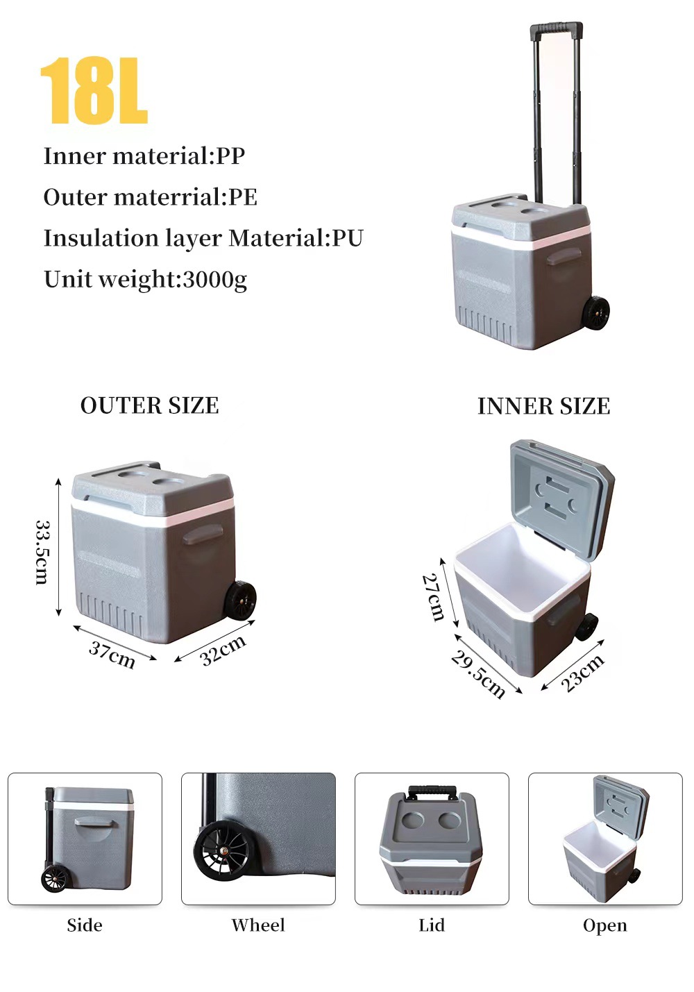 新款18L拉杆保温箱,采用PU发泡,产品尺寸为37*32*33.5cm,2个一箱。箱规64*38*36cm。