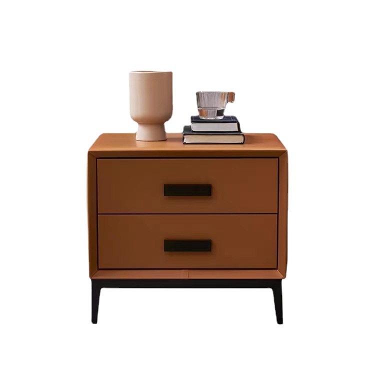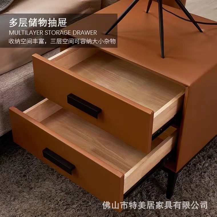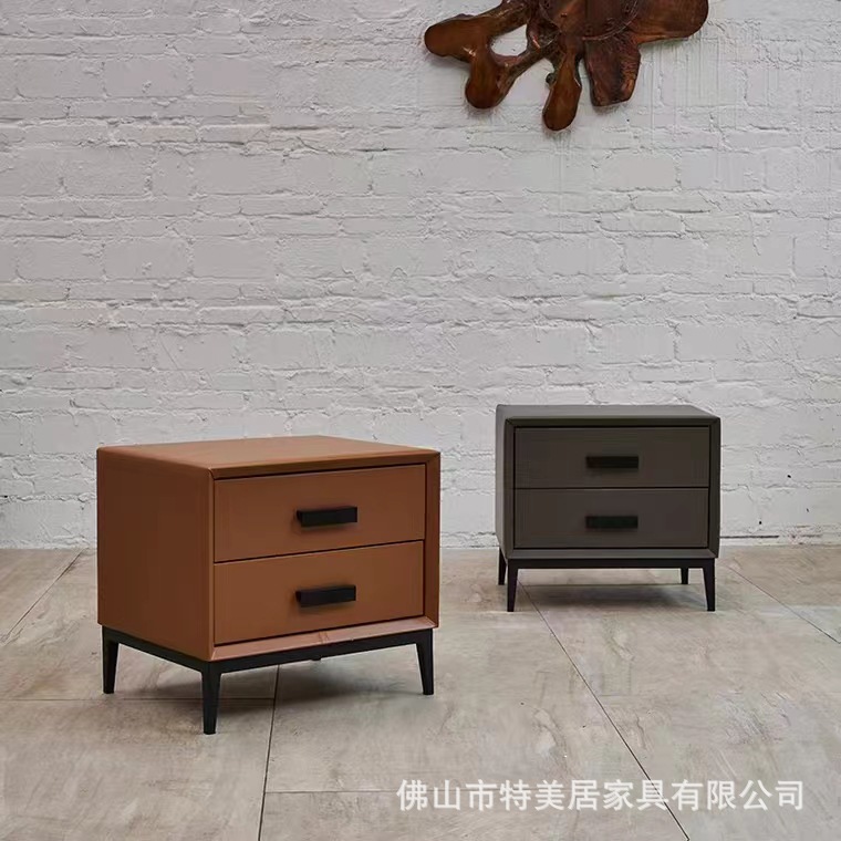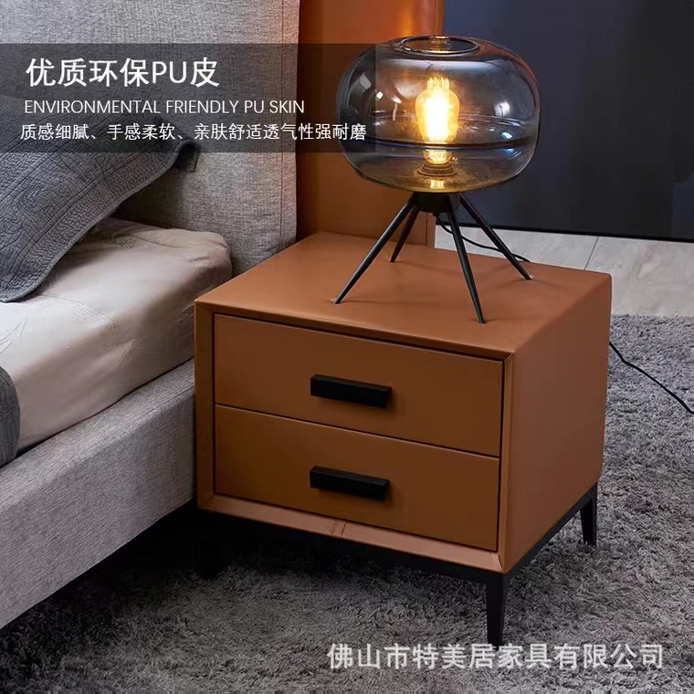 床头柜北欧简约现代床边柜双门双抽屉储物柜黑色铁艺底架皮艺柜子