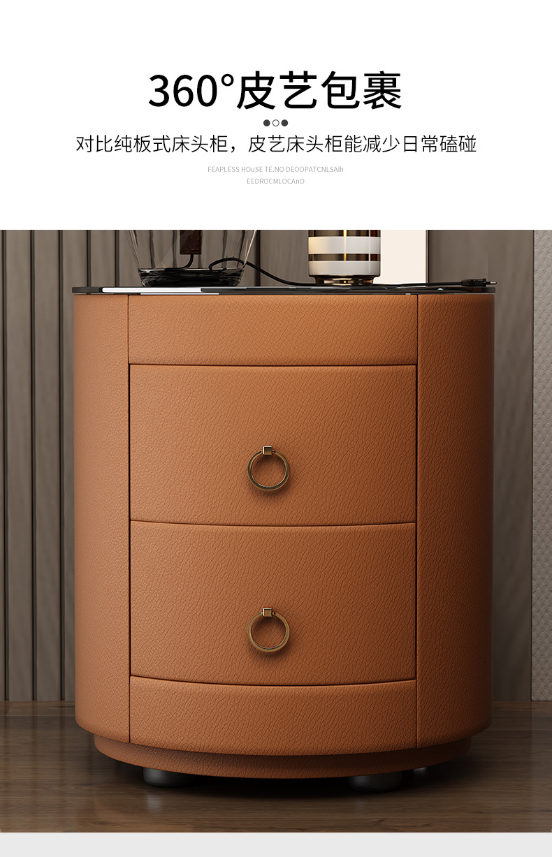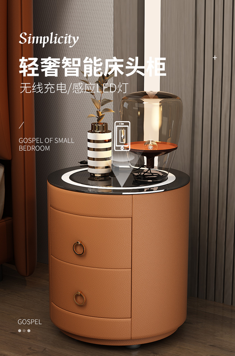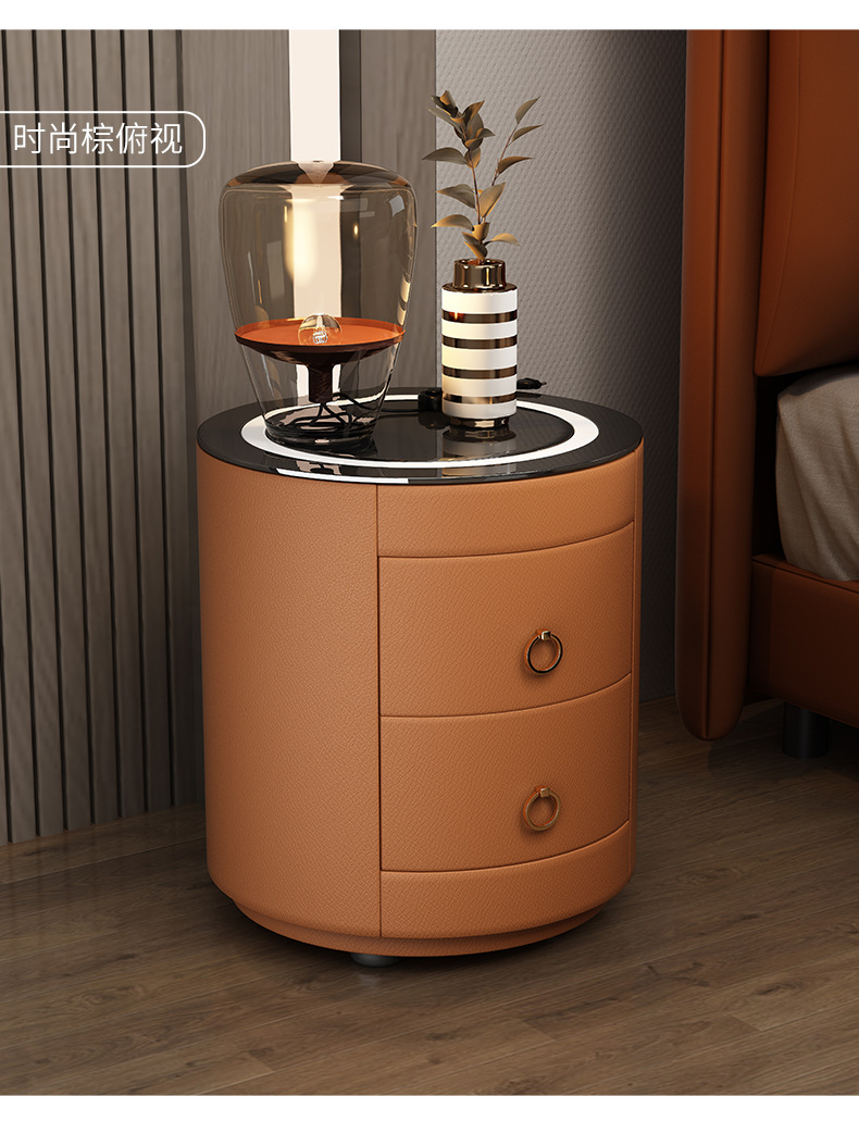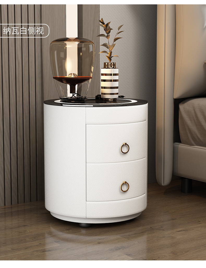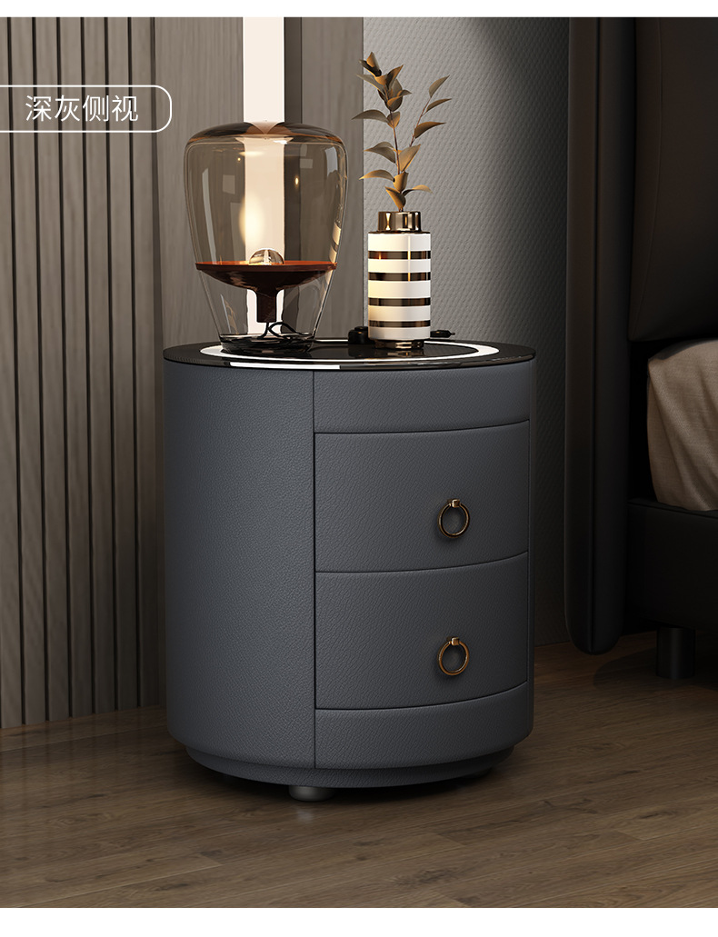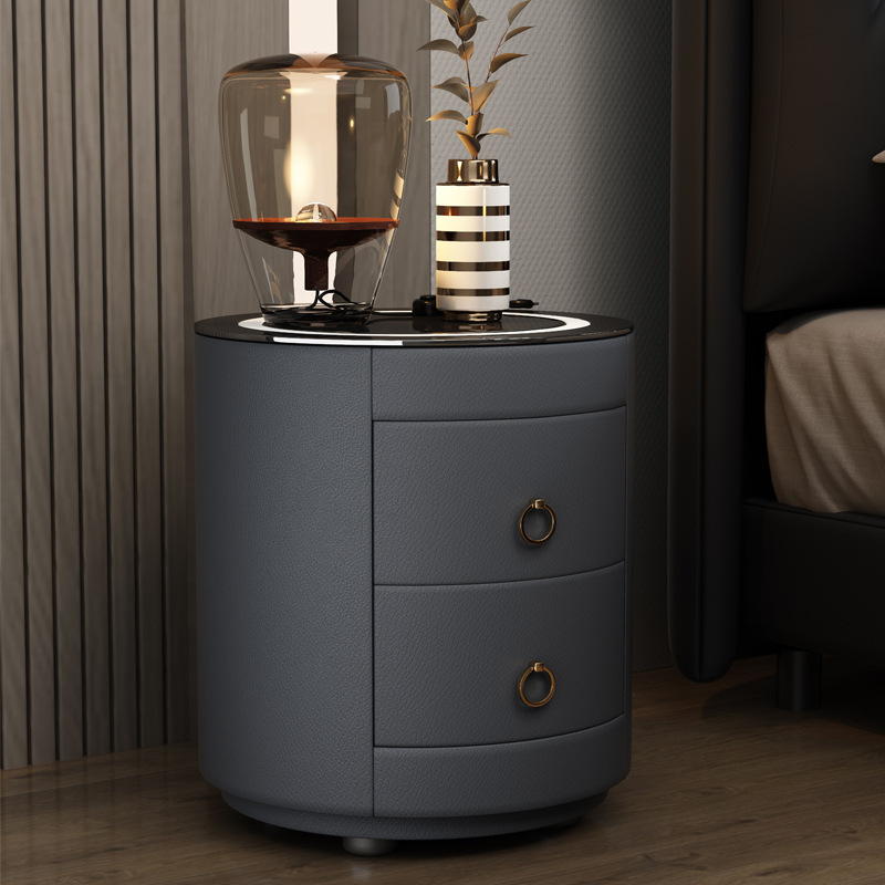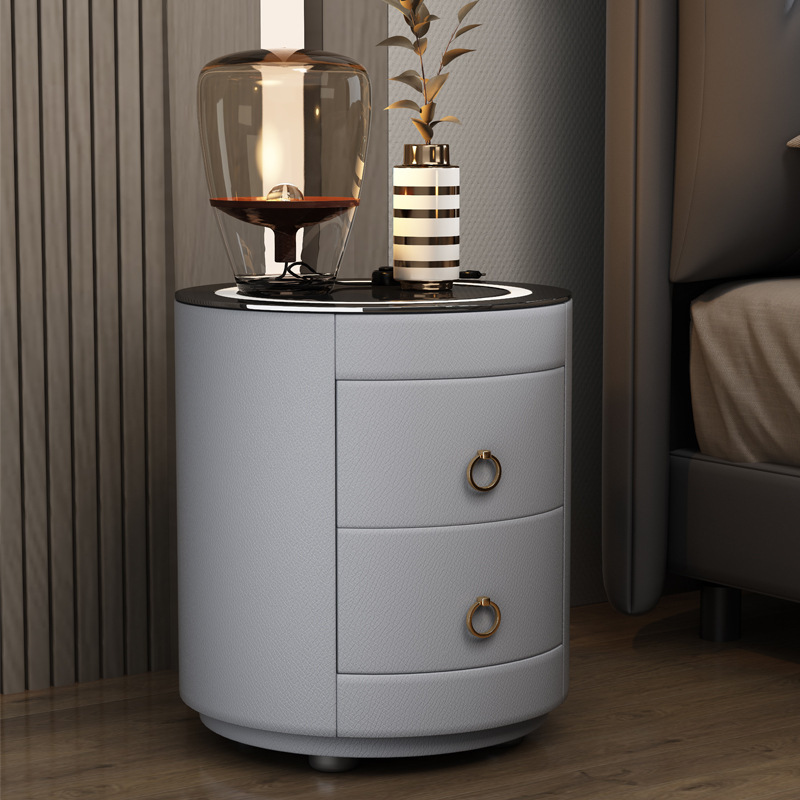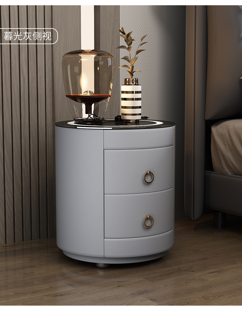 现代智能床头柜简约迷你小型充电岩板卧室灰色圆形实木轻奢床边柜
