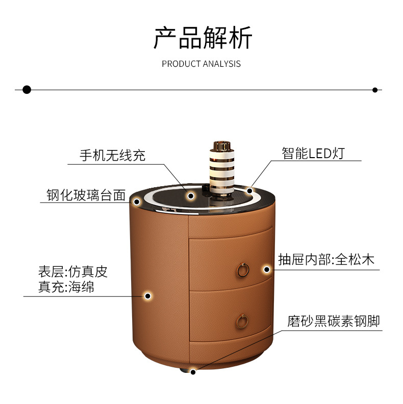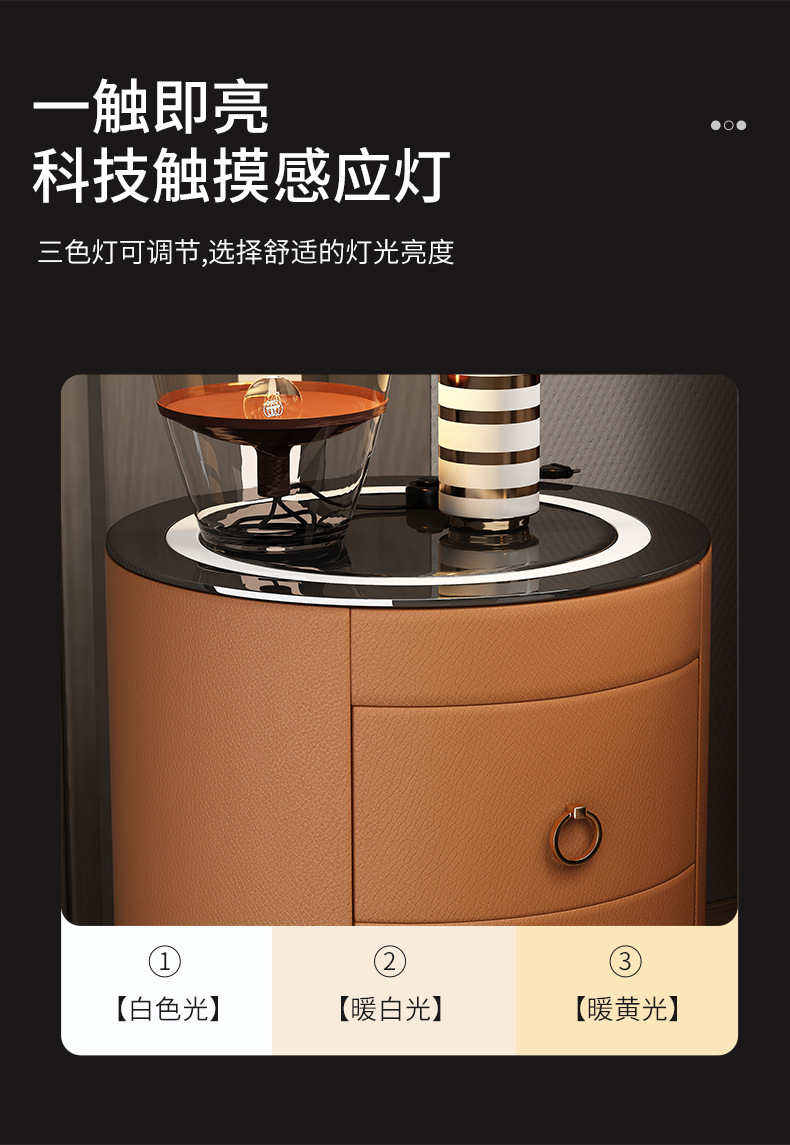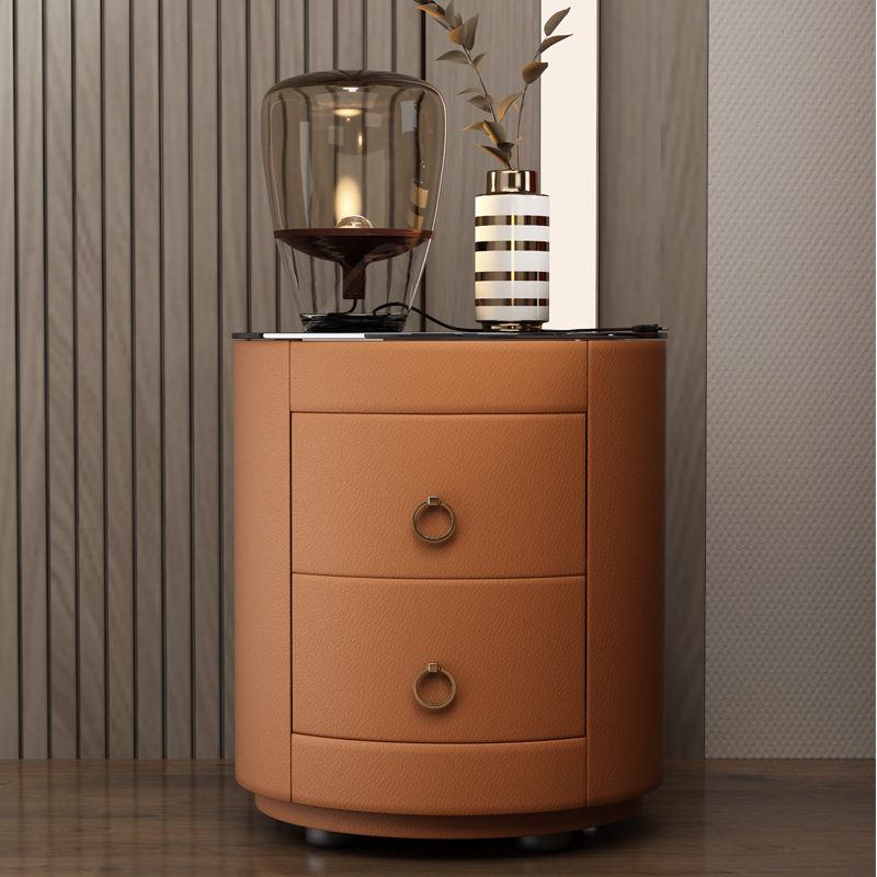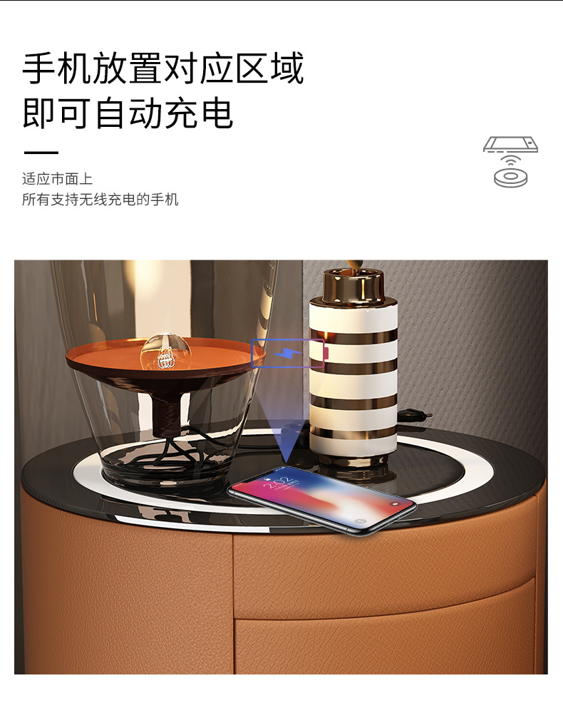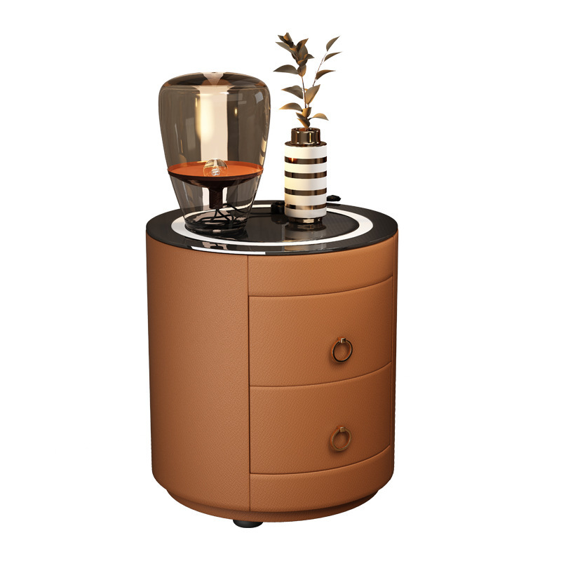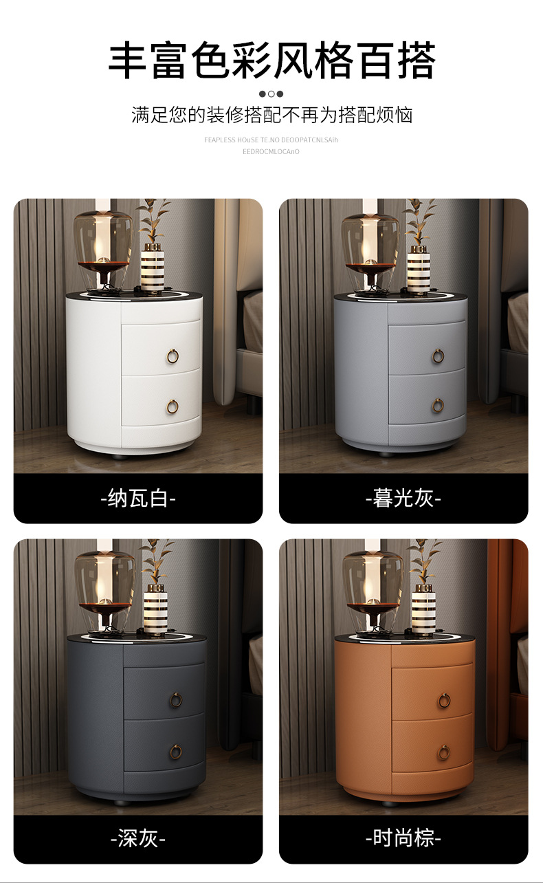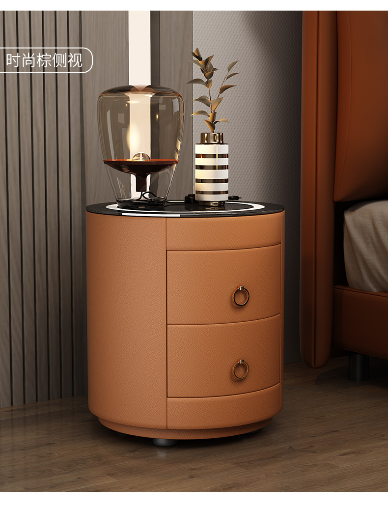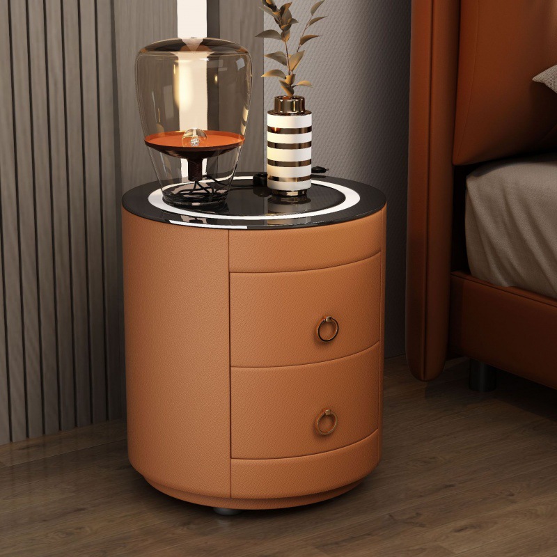 现代智能床头柜简约迷你小型充电岩板卧室灰色圆形实木轻奢床边柜