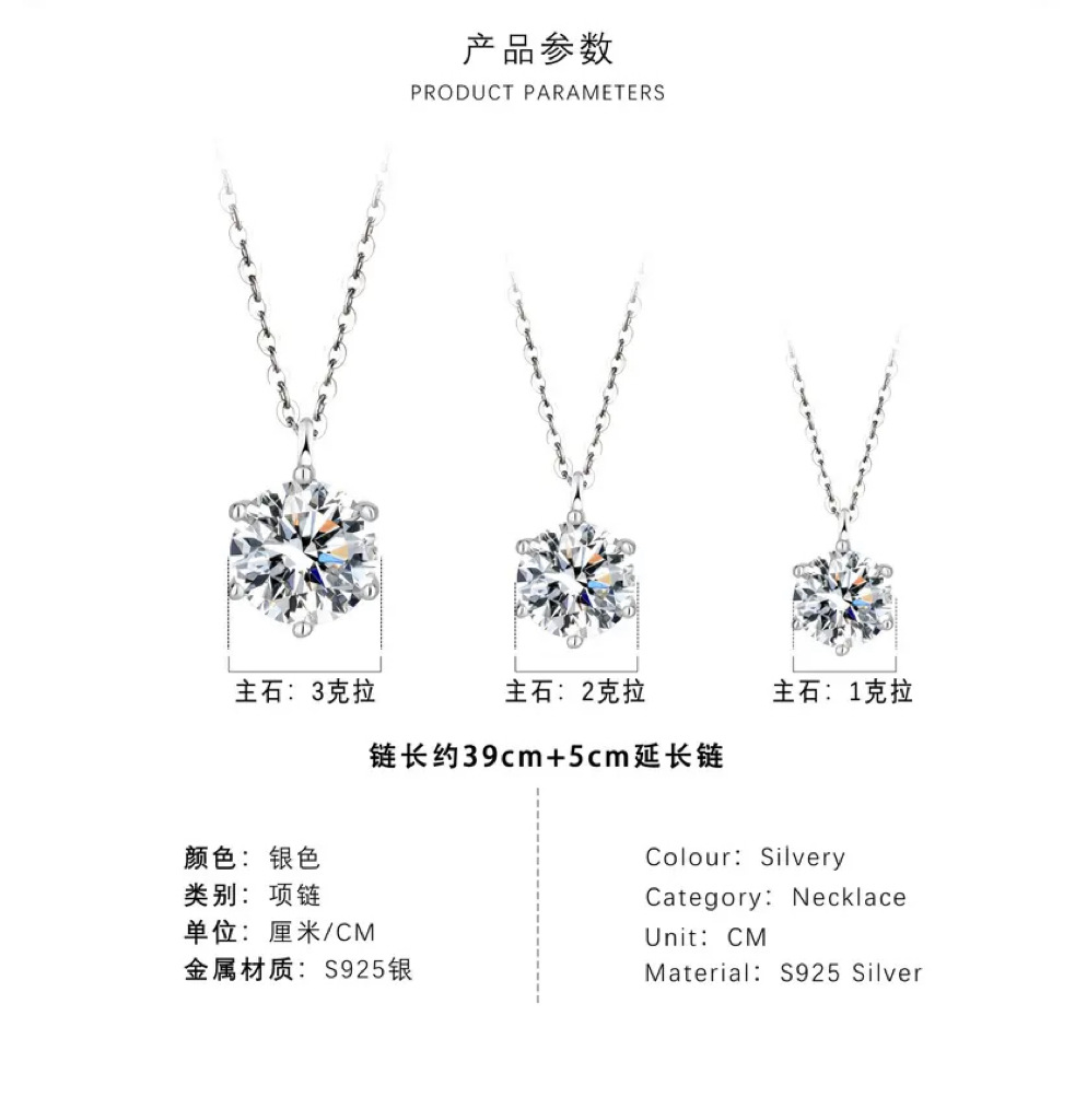 跨境925银莫桑石六爪项链1 2 3克拉简约时尚锁骨链女莫桑石项链