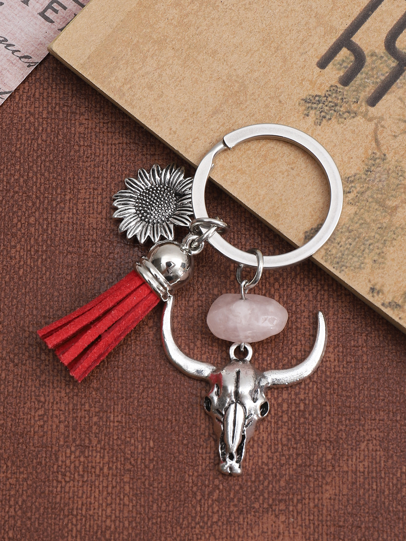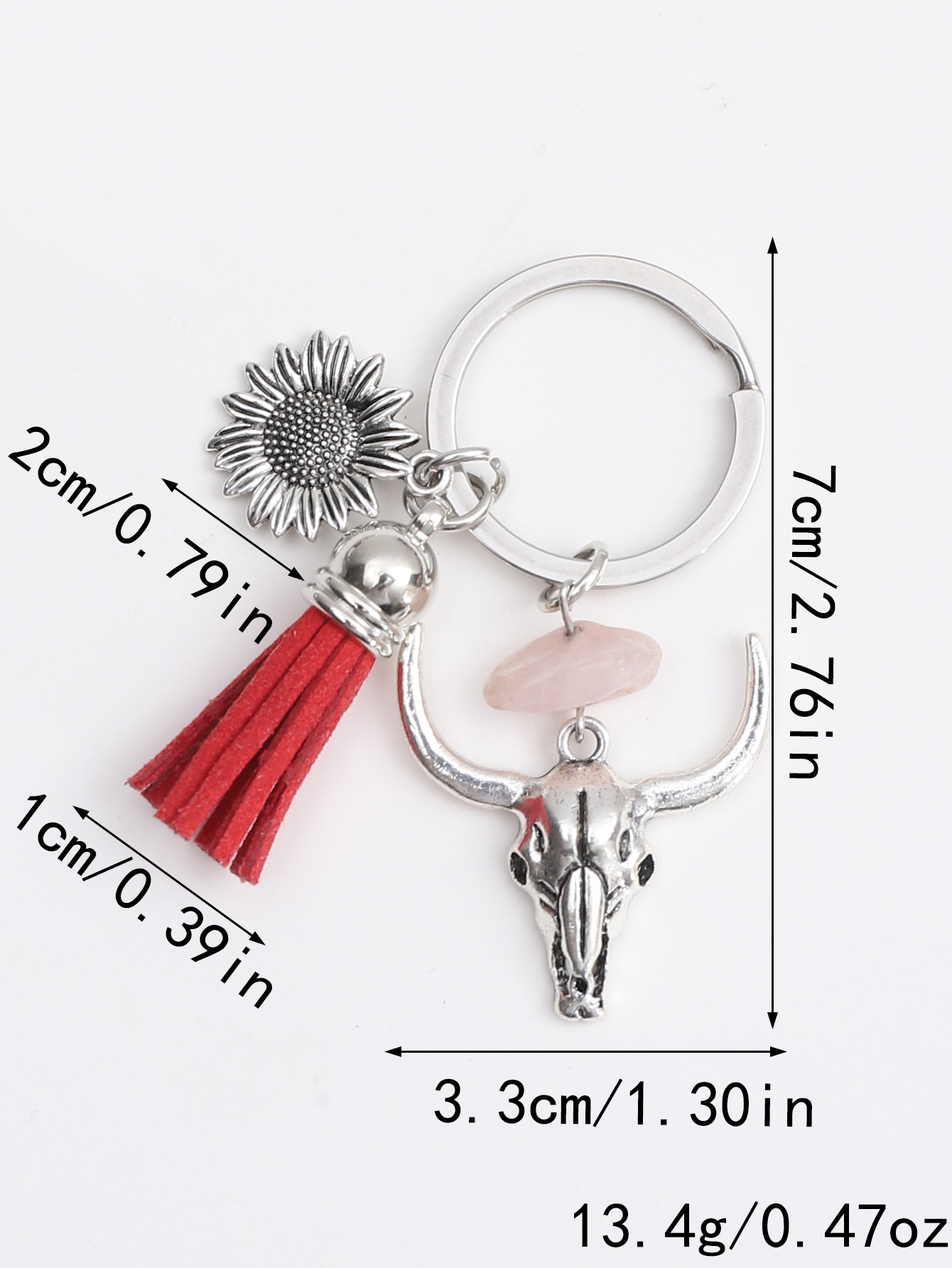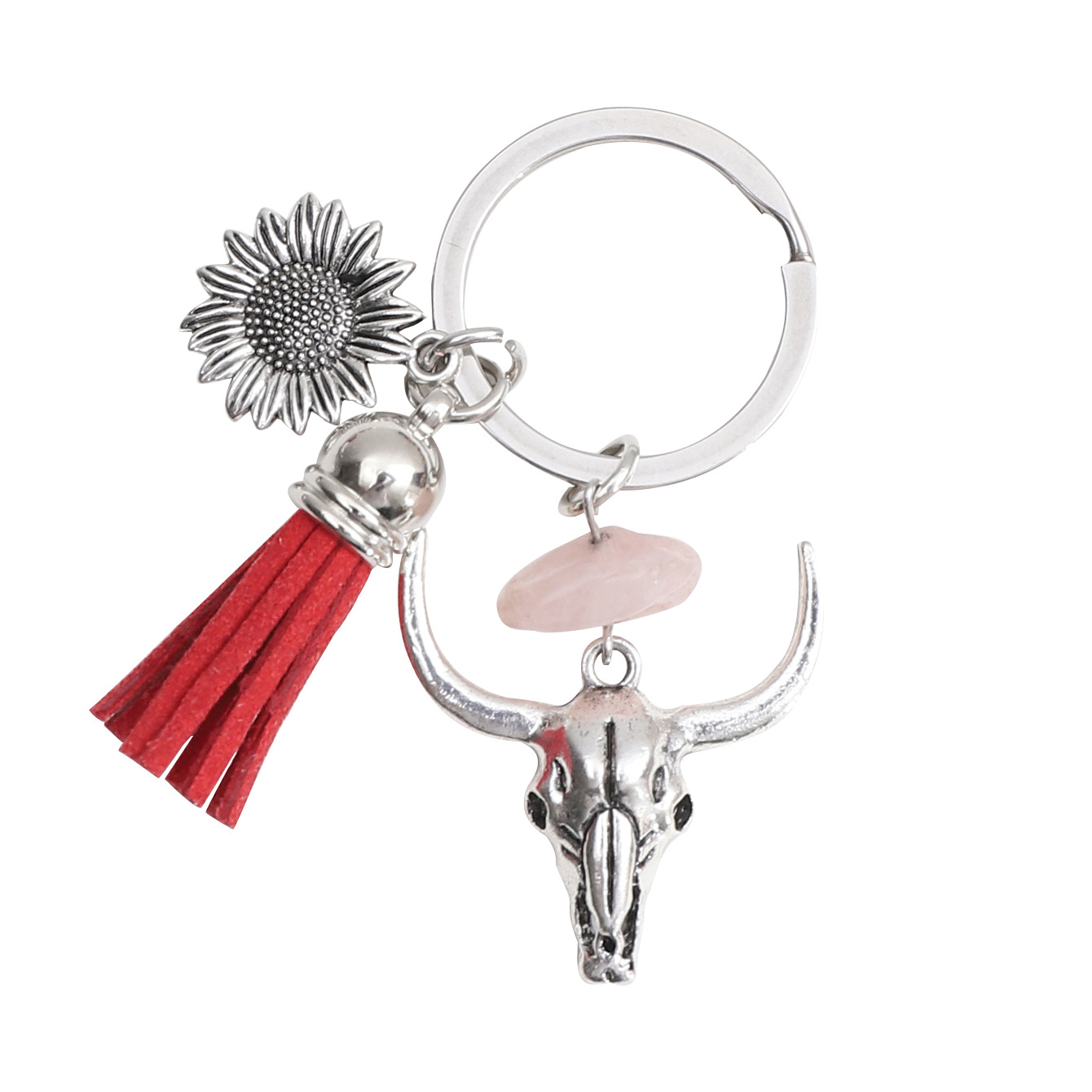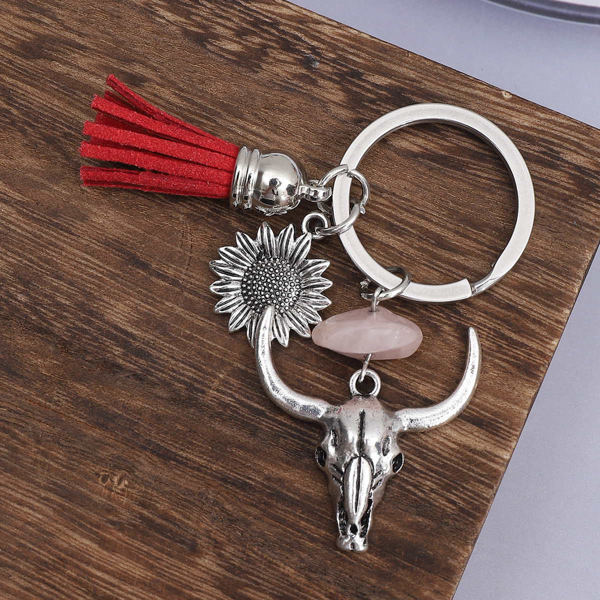 红色韩国绒流苏钥匙扣合金牛头向日葵挂件天然松石跨境欧美亚马