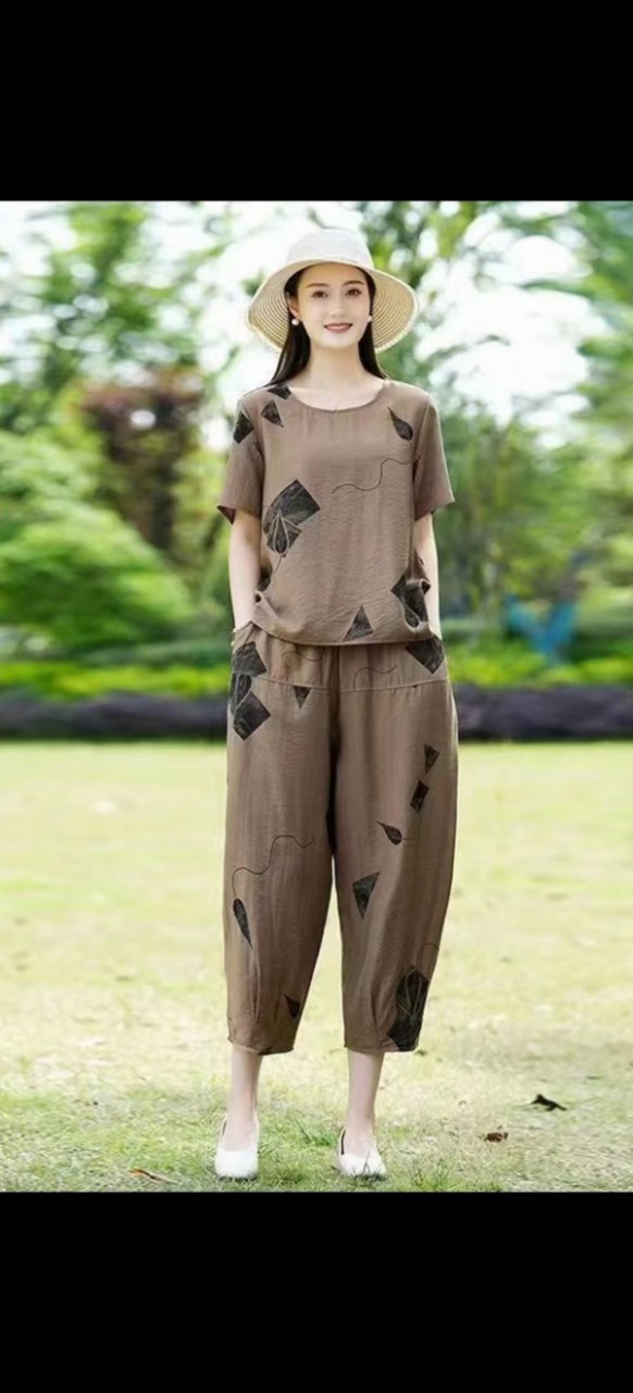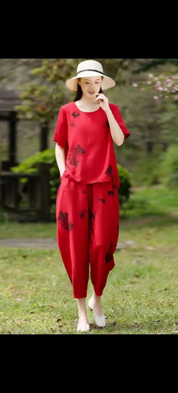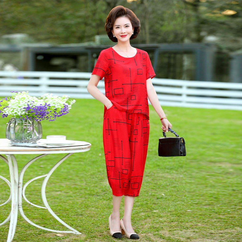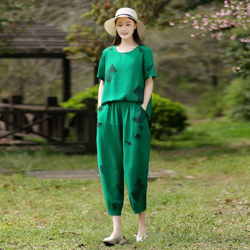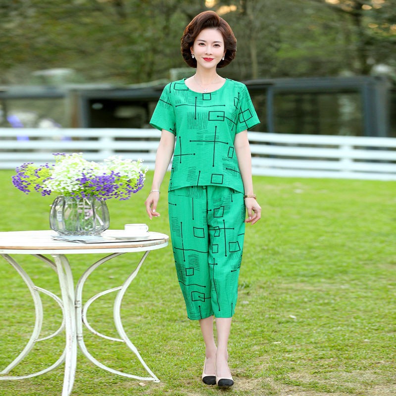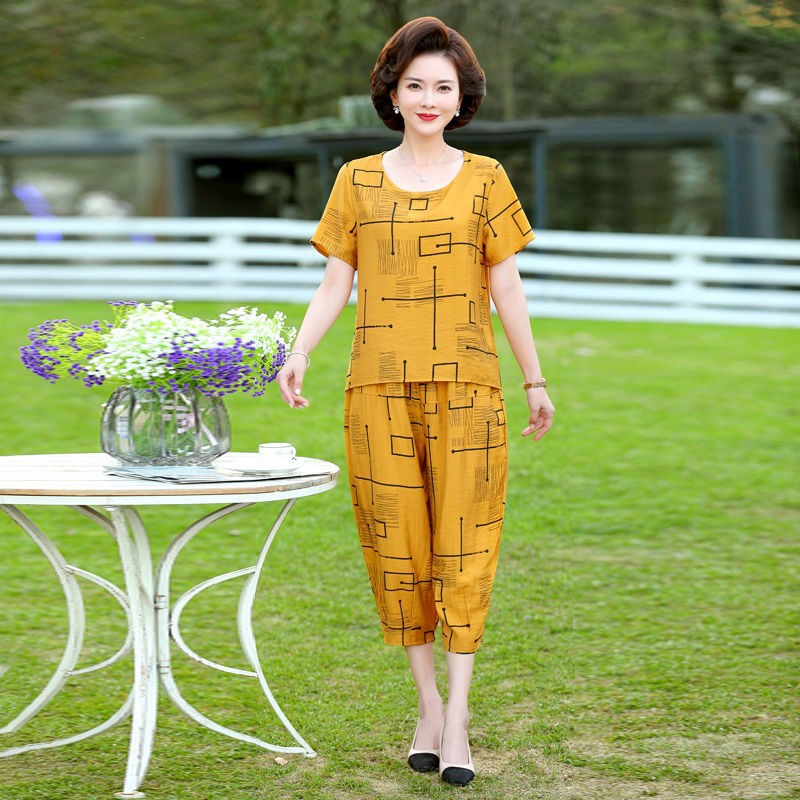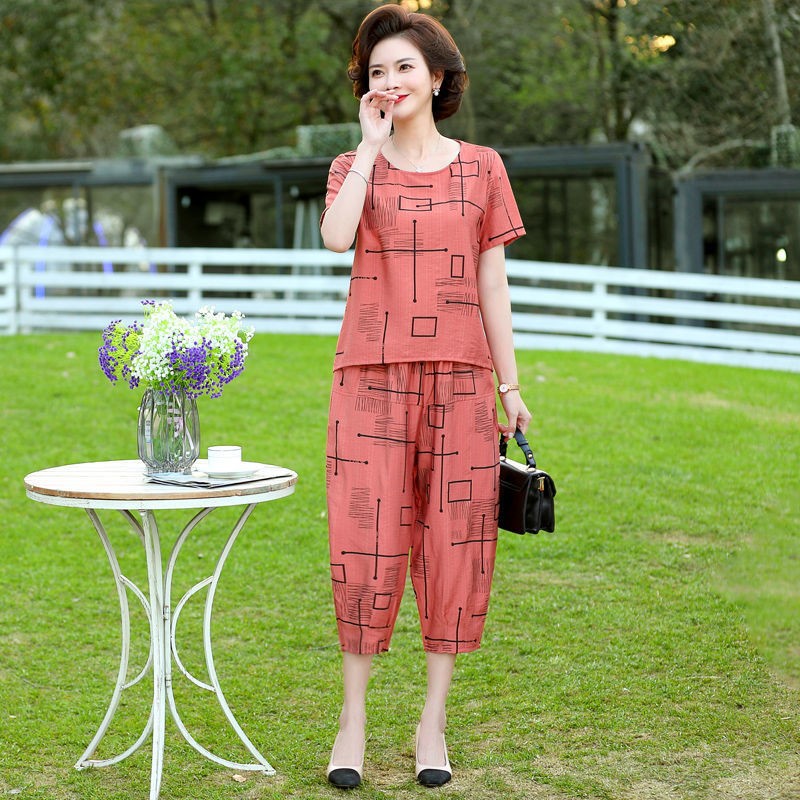 妈妈夏装洋气套装中老年气质棉麻宽松两件套中年妇女亚麻哈伦裤潮