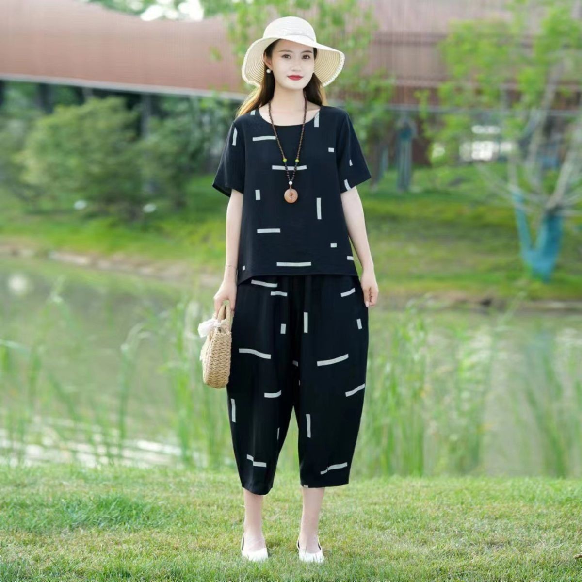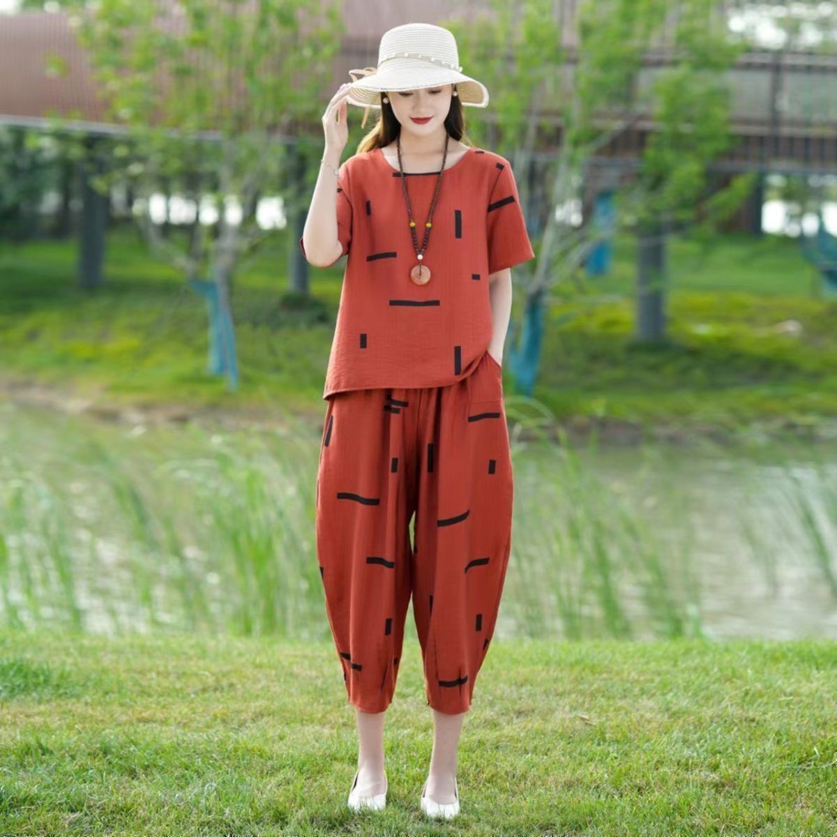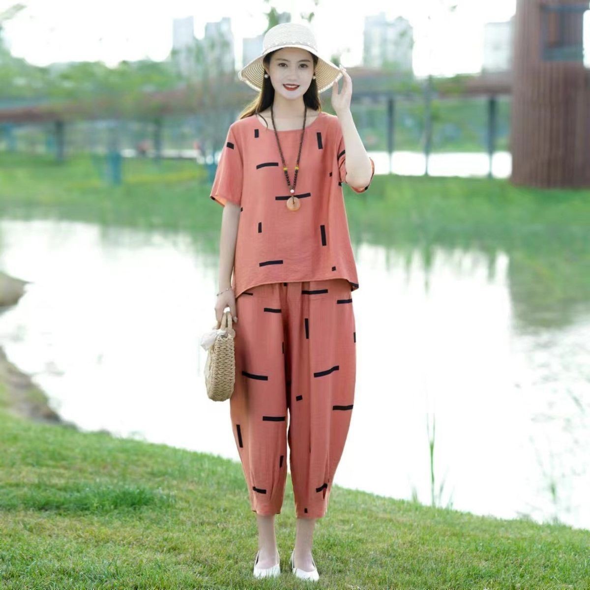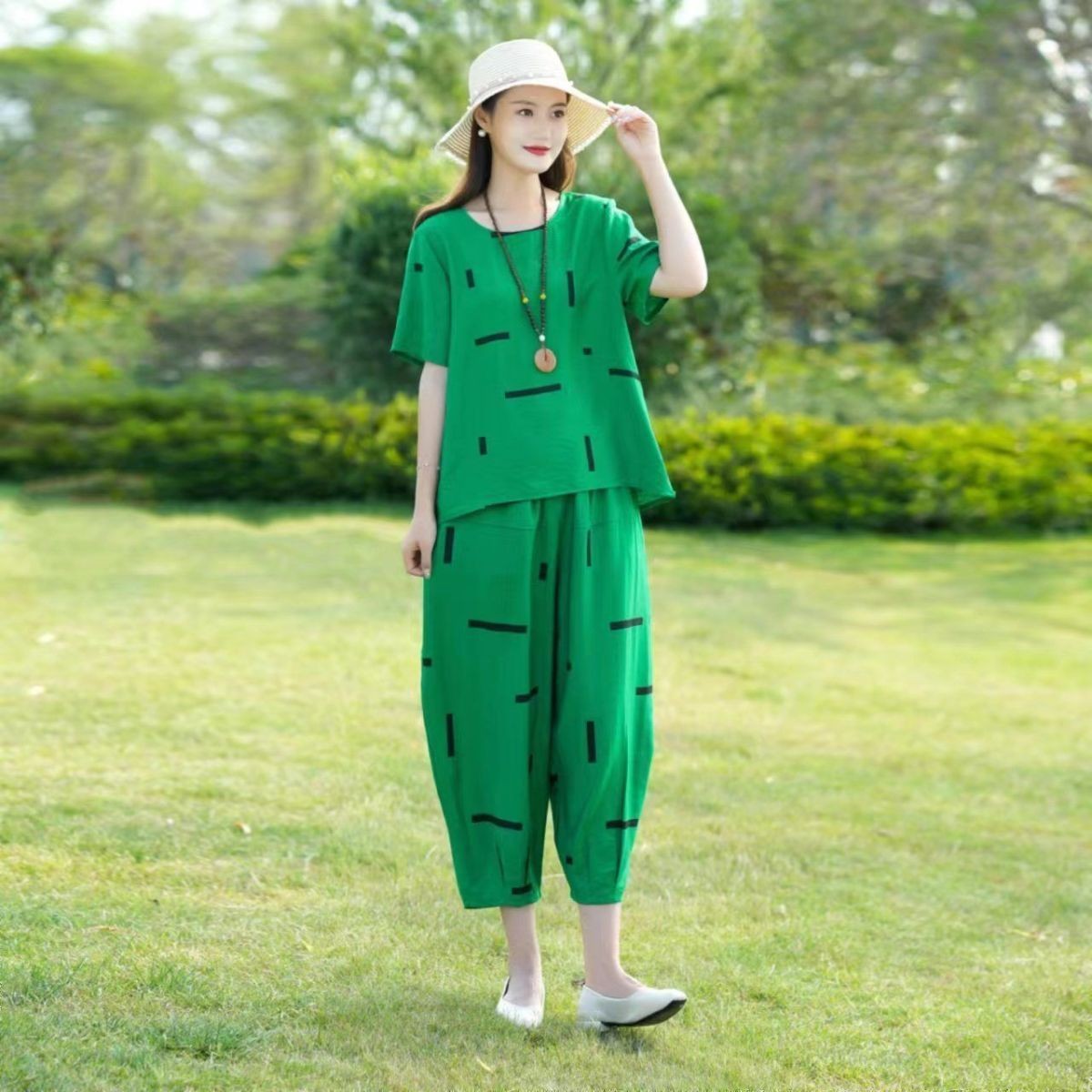 妈妈夏装洋气套装中老年气质棉麻宽松两件套中年妇女亚麻哈伦裤潮