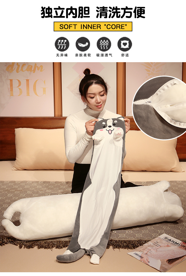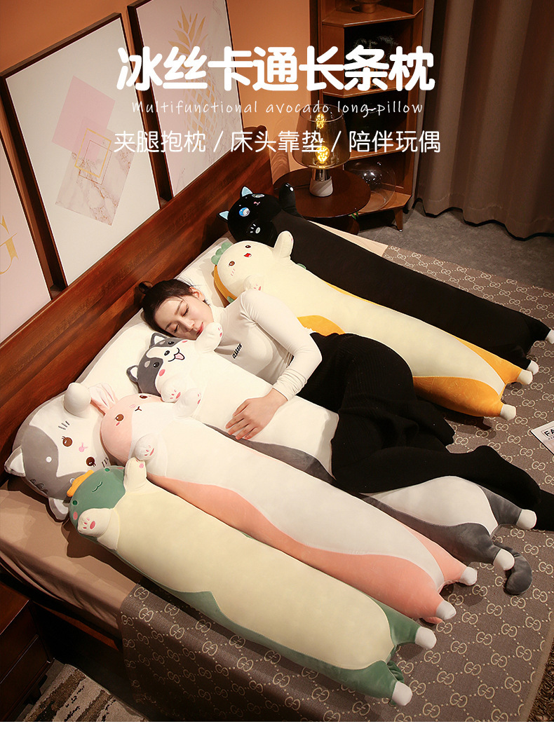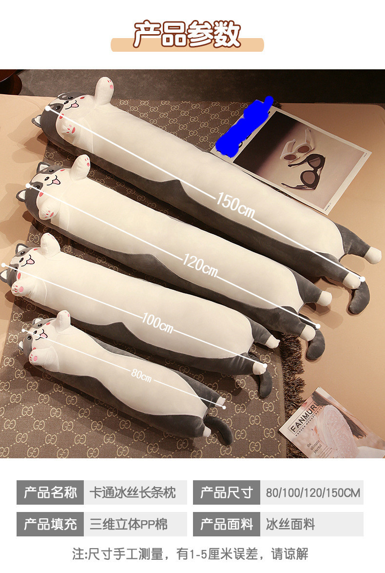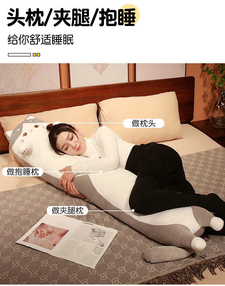 可爱长条黑猫哈士奇冰丝夹腿大抱枕床靠垫男女抱睡觉毛绒玩偶批发