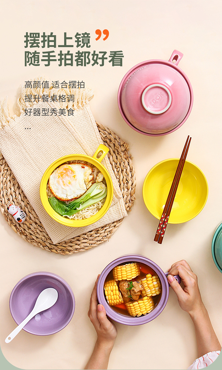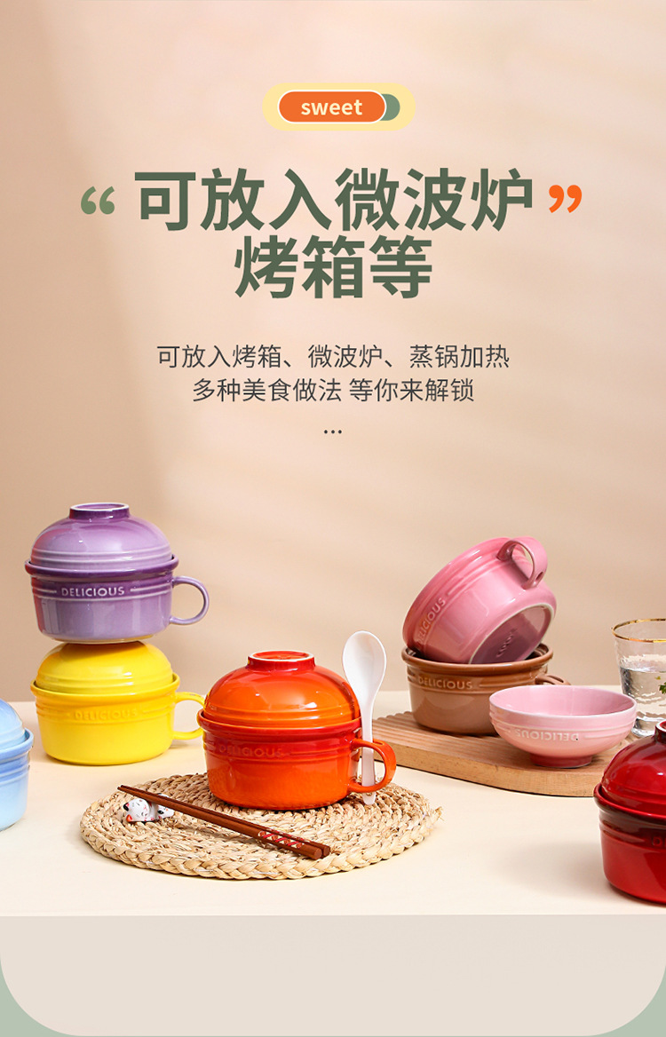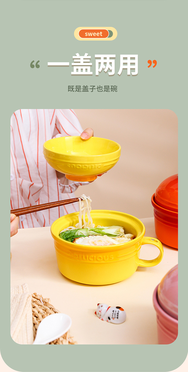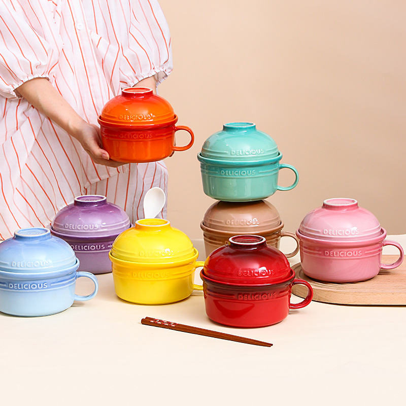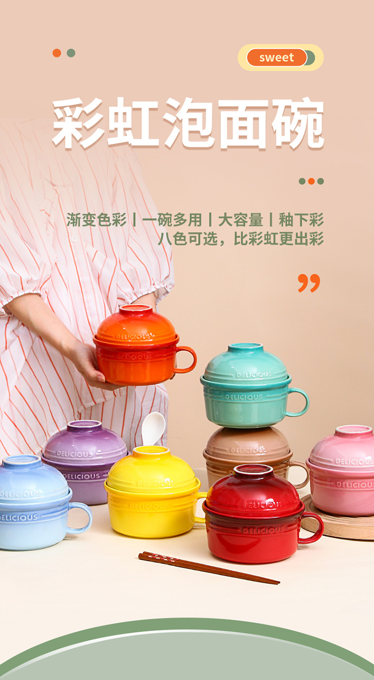陶瓷泡面碗炫彩创意渐变带盖勺把手碗学生宿舍家用饭盒便当大号碗