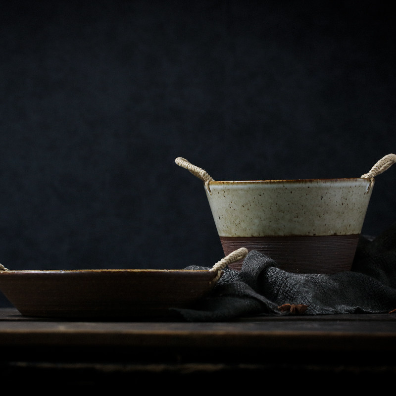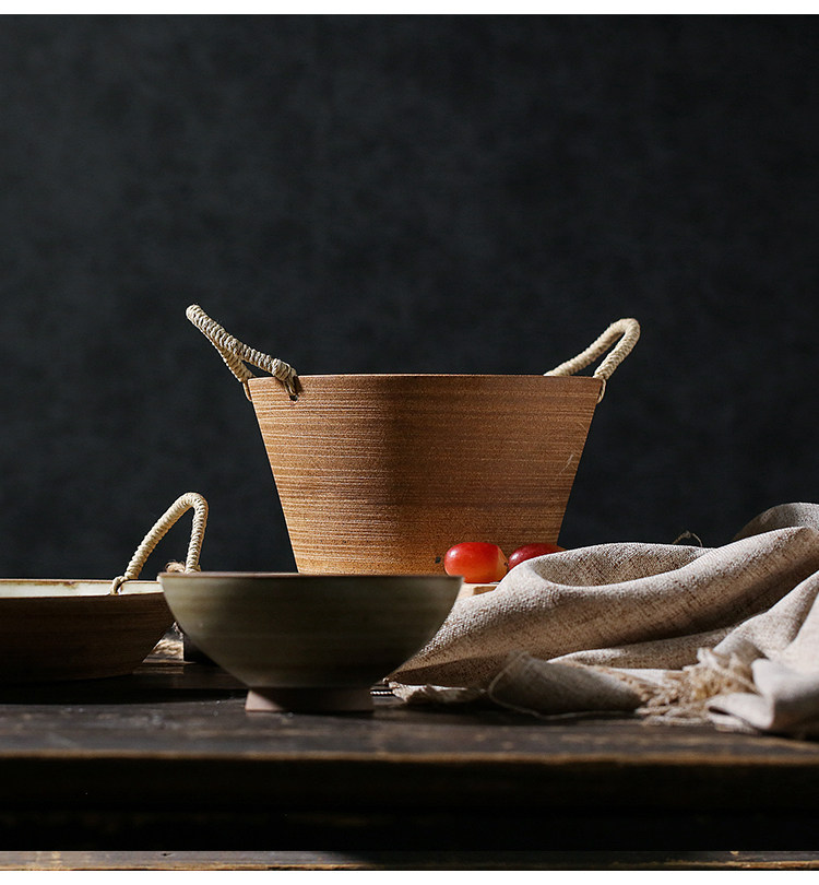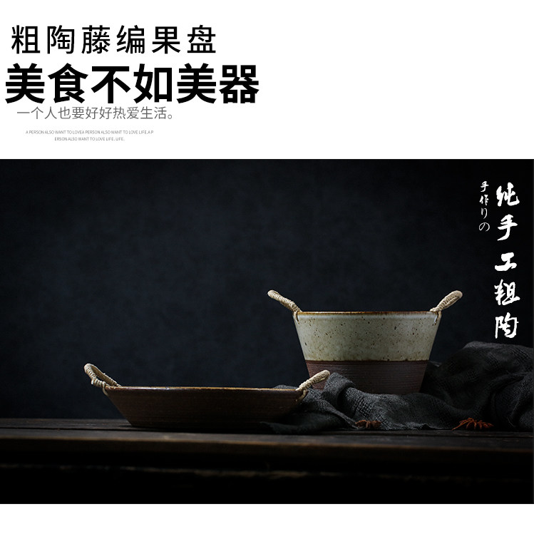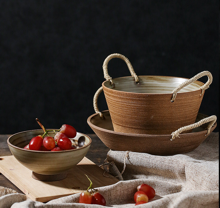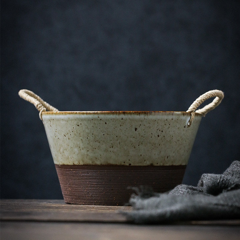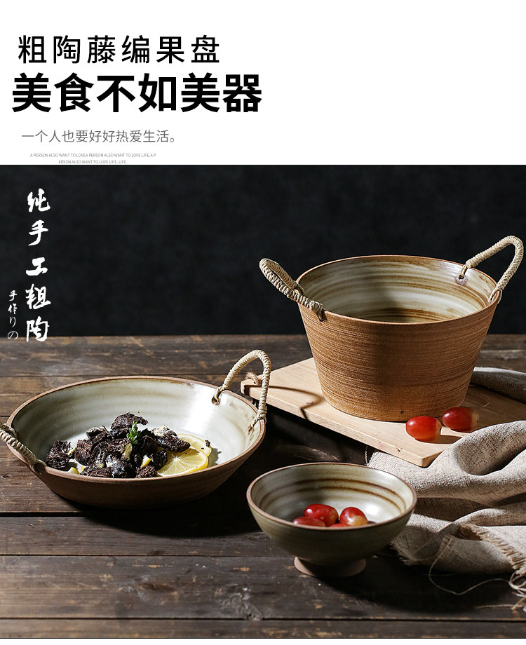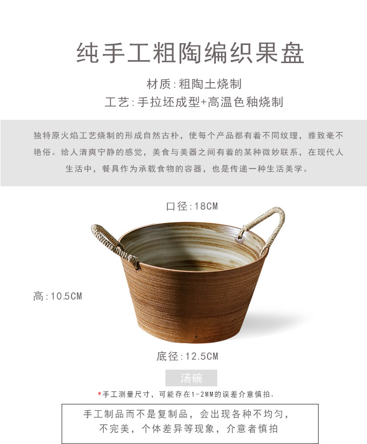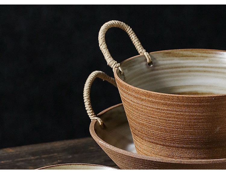 陶瓷餐具双耳汤碗大号家用藤编日式水果沙拉碗创意复古粗陶手作