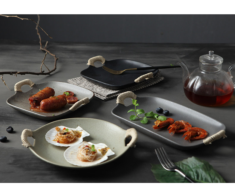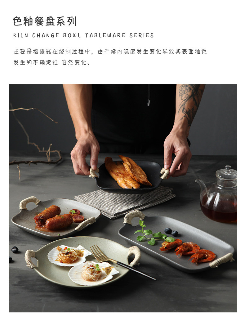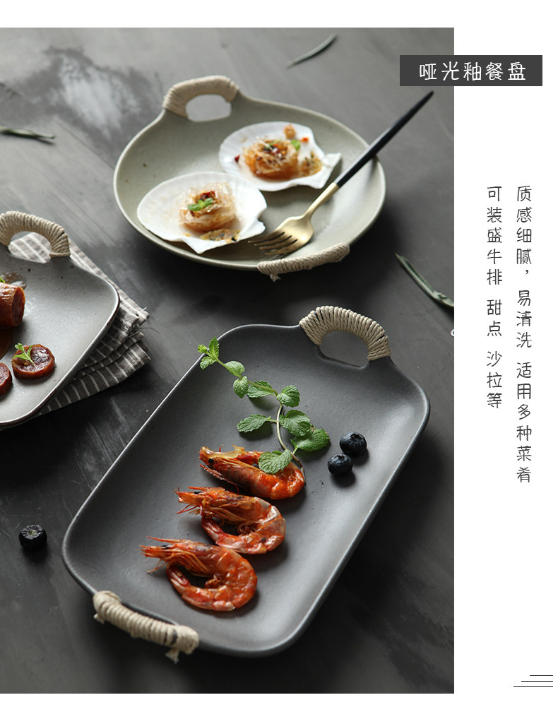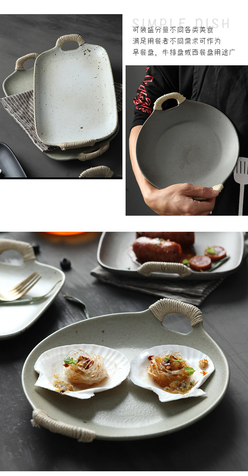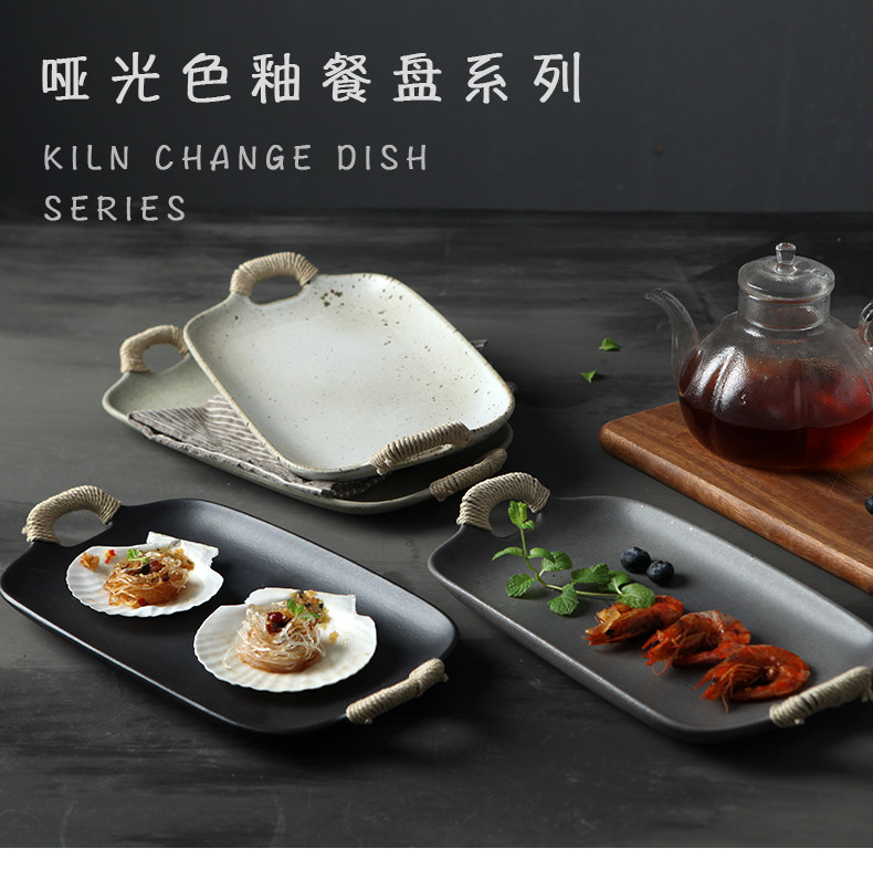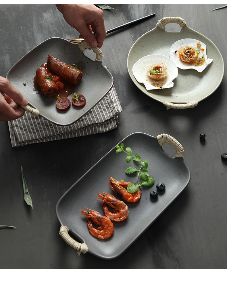 日式菜盘水果盘寿司盘双耳麻绳多种形状陶瓷盘哑光色釉创意烤盘