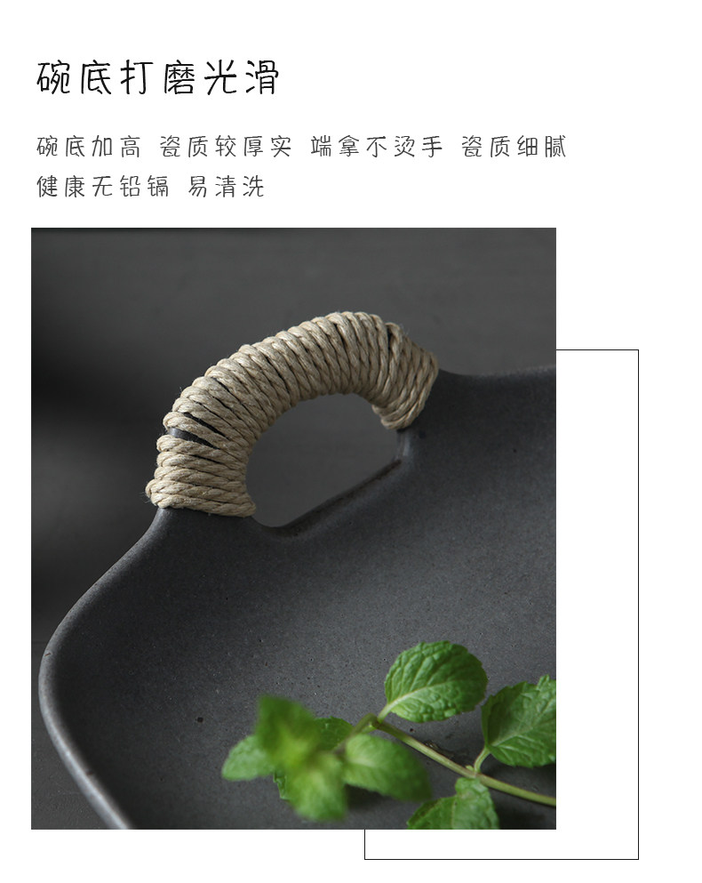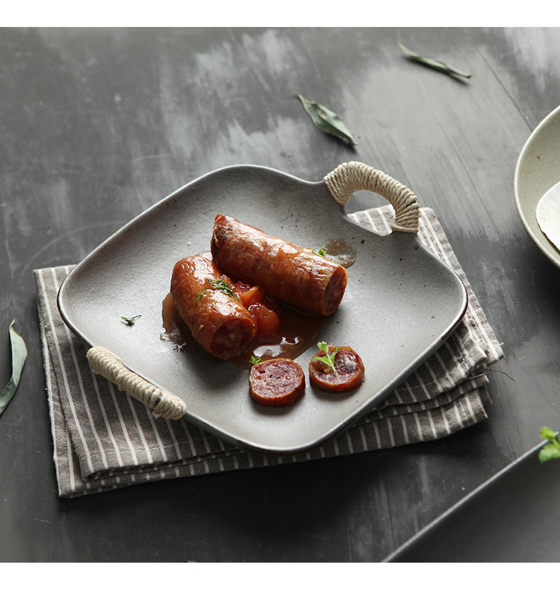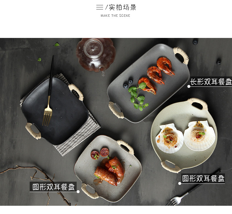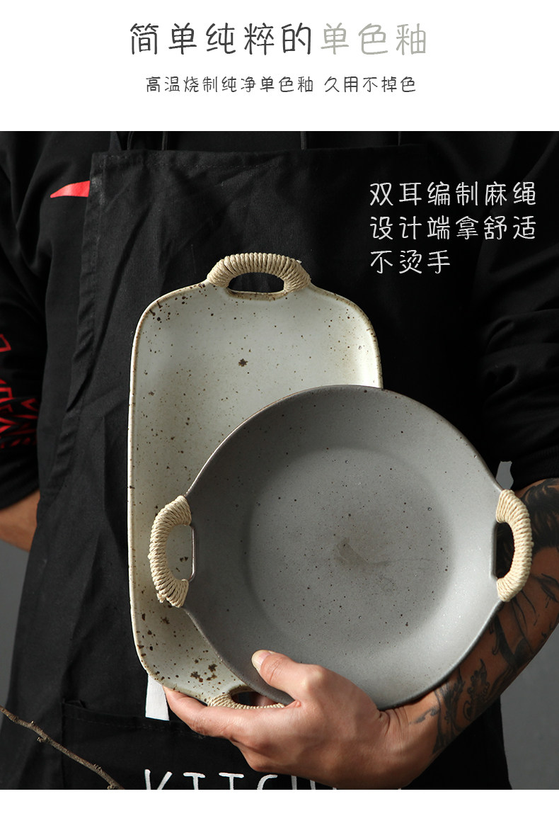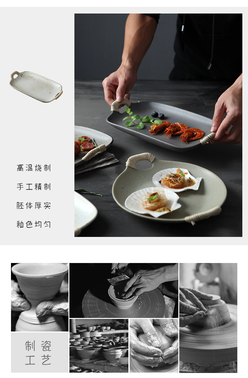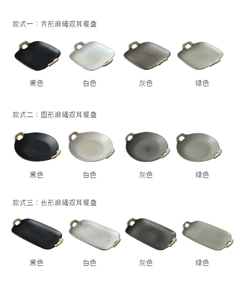 日式菜盘水果盘寿司盘双耳麻绳多种形状陶瓷盘哑光色釉创意烤盘
