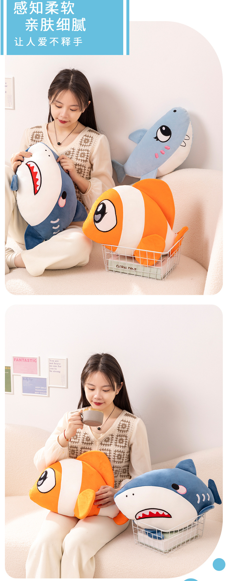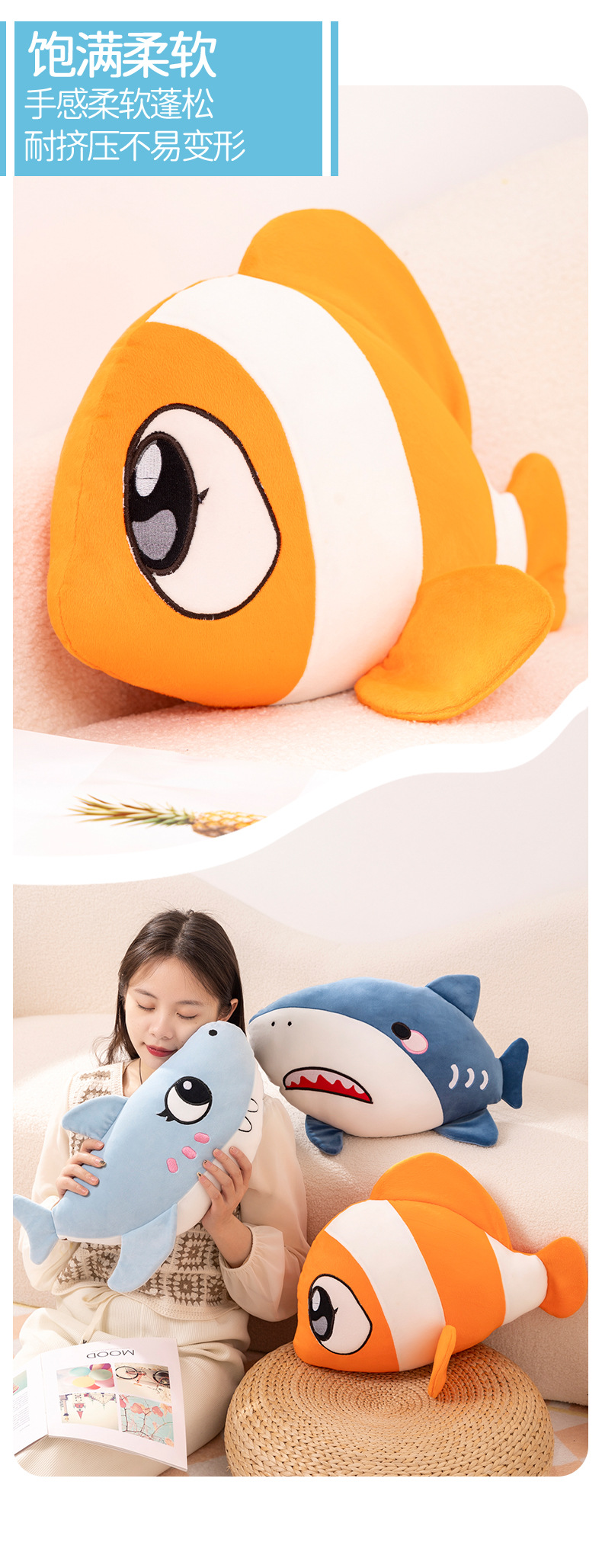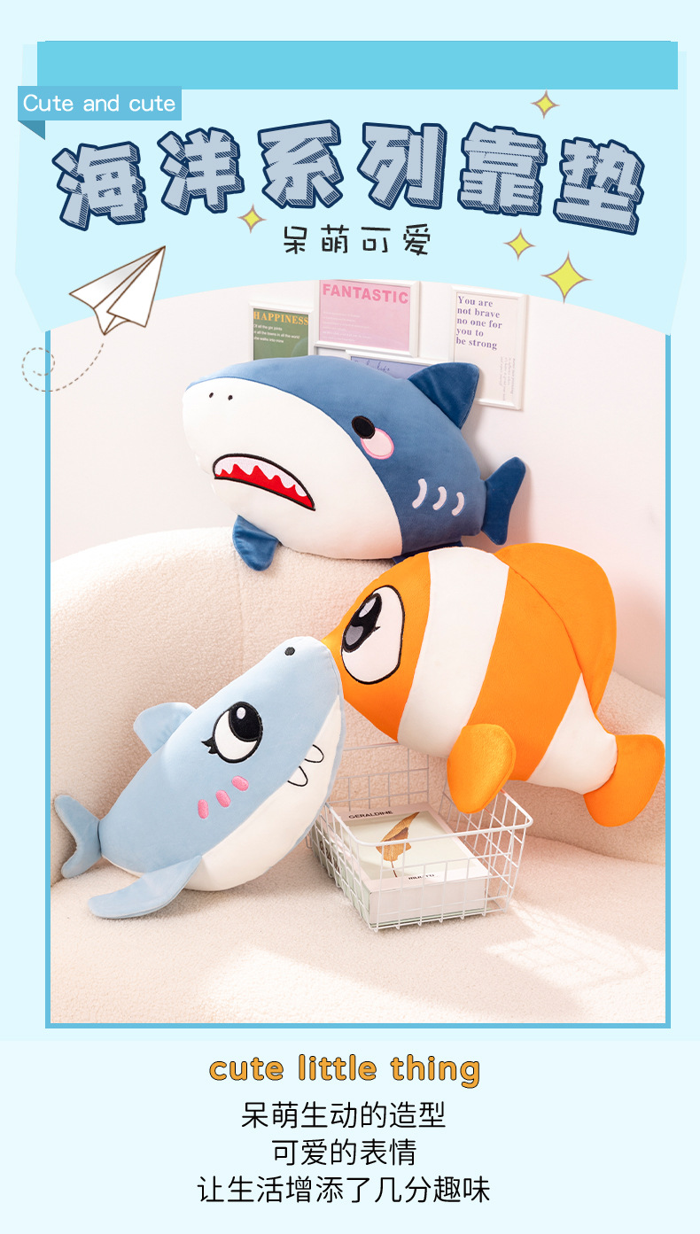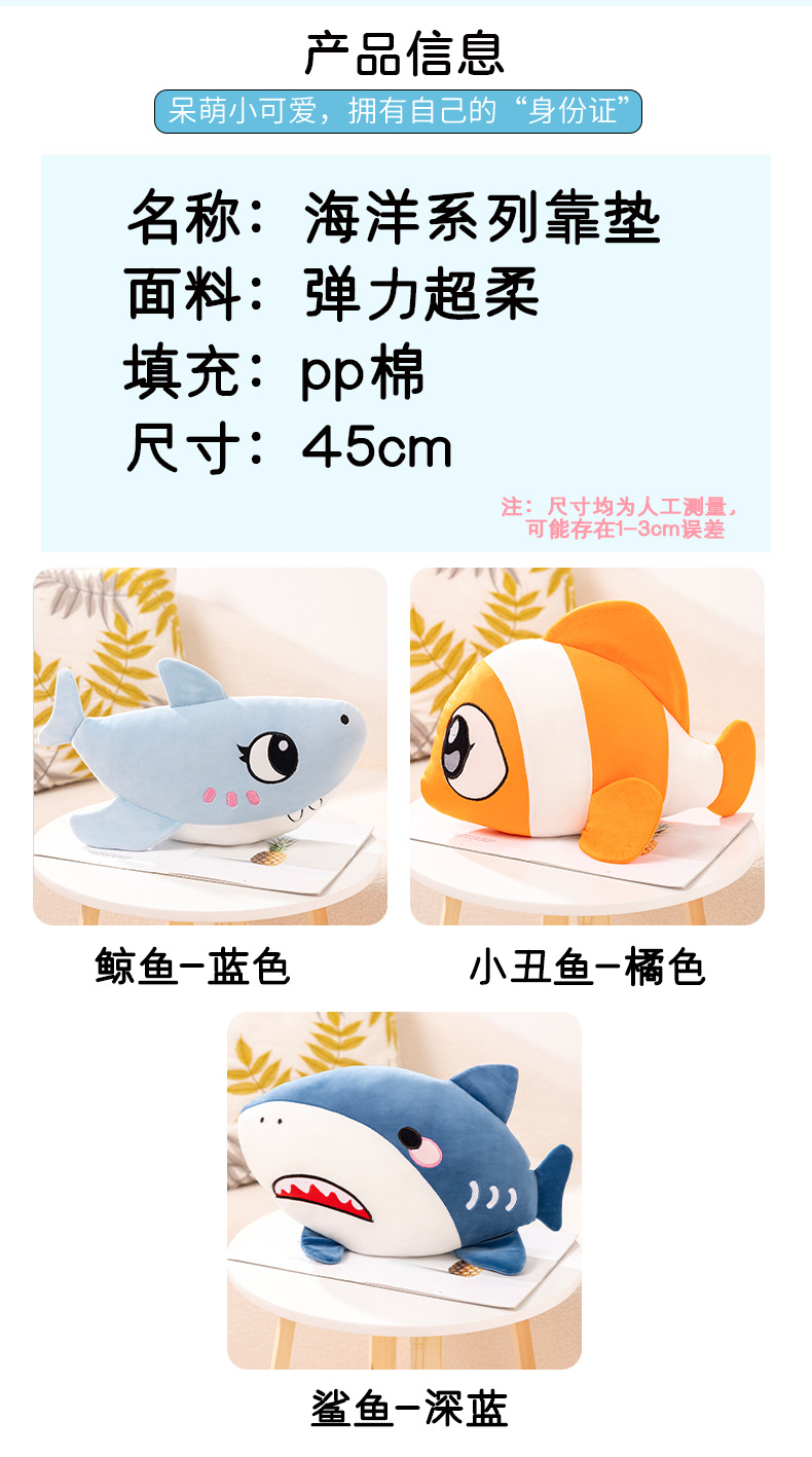 可爱鲨鱼抱枕毛绒玩具海洋馆动物靠垫小丑鱼娃娃批发儿童陪伴礼物