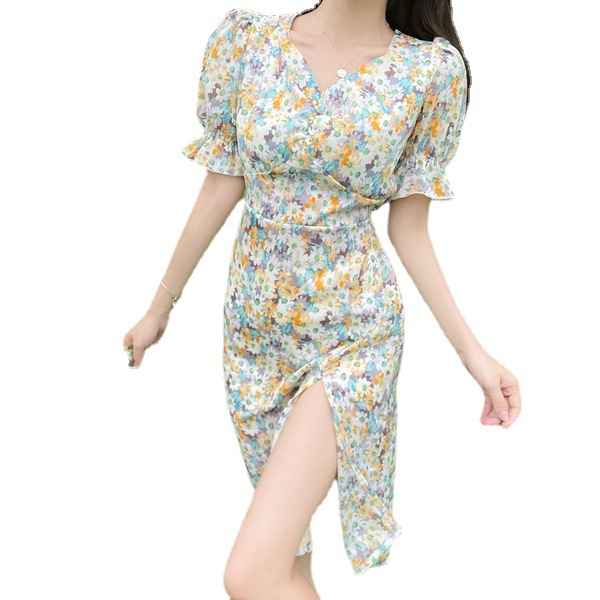 夏天显瘦裙子超仙女森系泡泡袖不规则赫本风碎花连衣裙女装批发潮