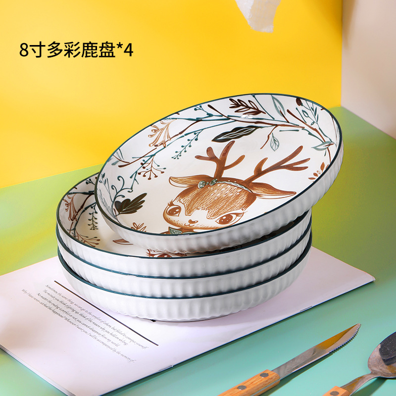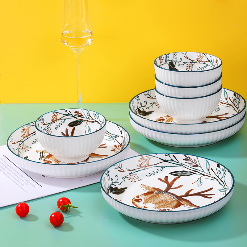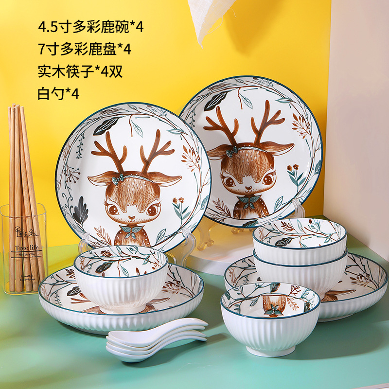 网红创意日式田园风小鹿卡通可爱陶瓷碗盘菜盘米饭碗釉下彩水果盘