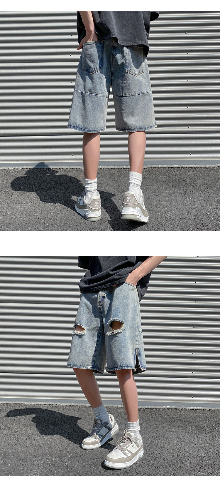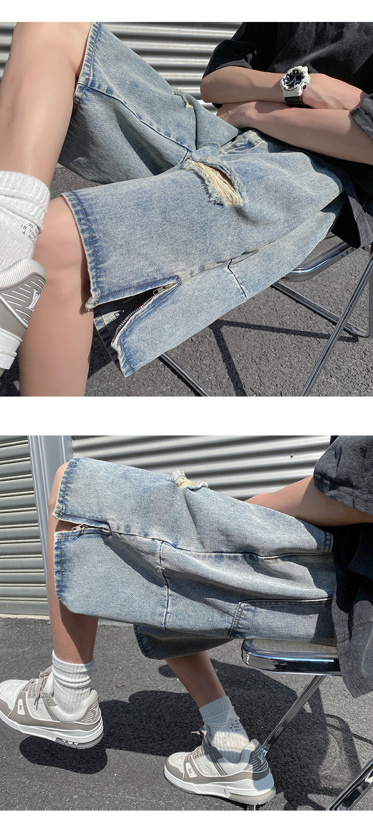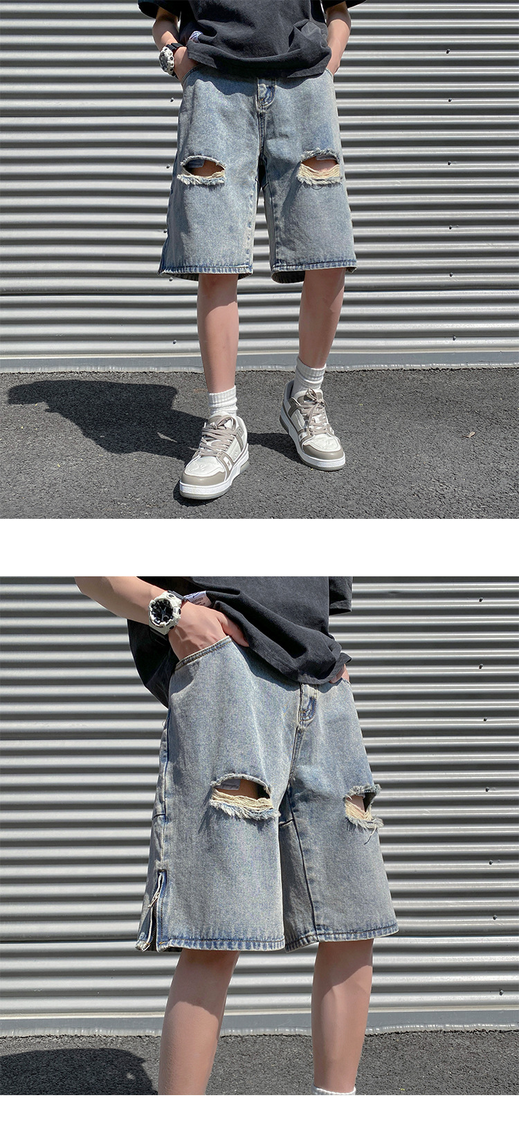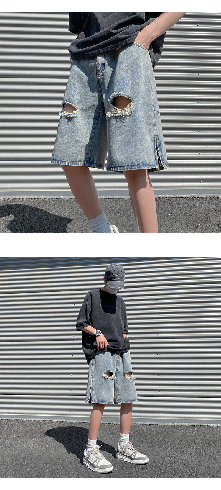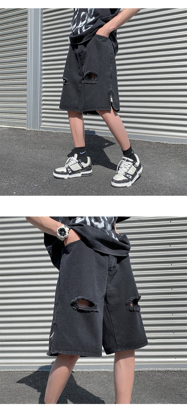2023夏季新款高街潮流破洞牛仔裤侧边拉链休闲裤美式潮牌五分裤