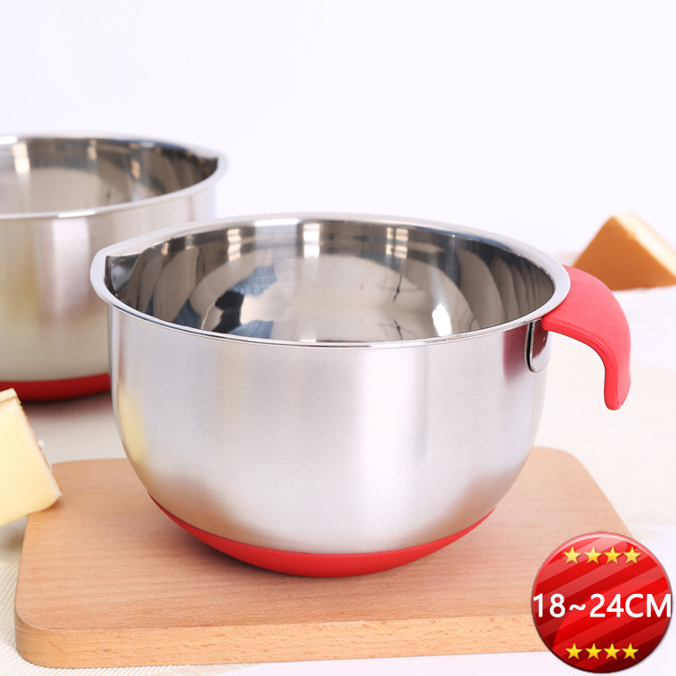 不锈钢打蛋盆防滑底硅胶打蛋盆带滤嘴带手柄沙拉盆18CM24CM洗菜盆