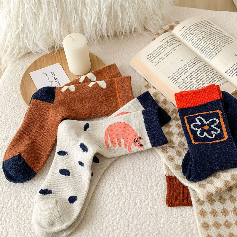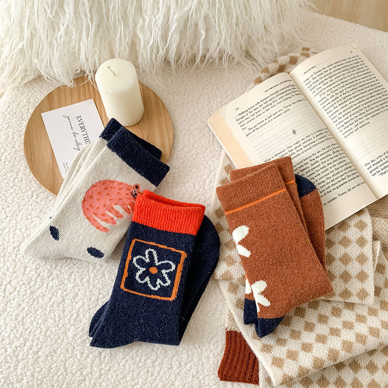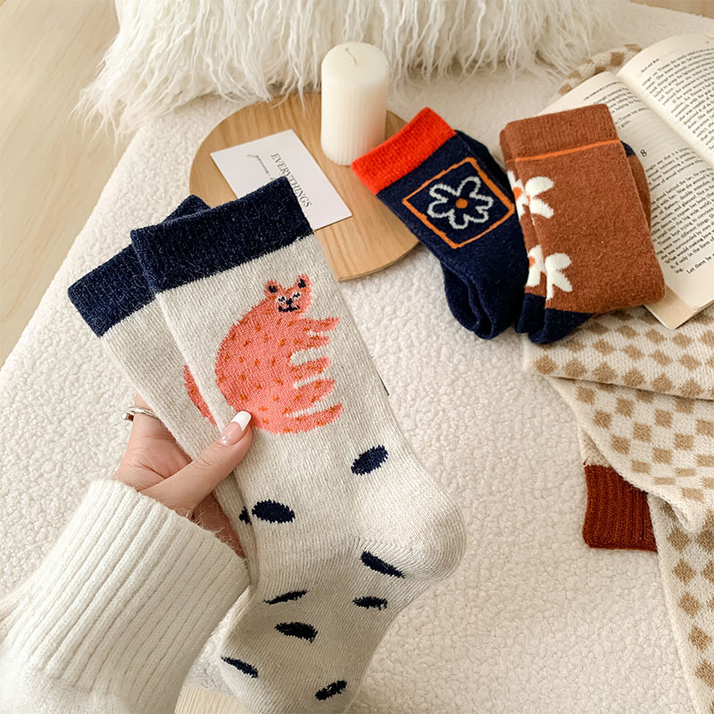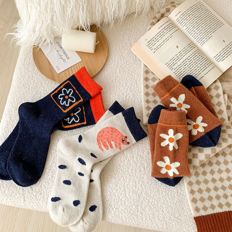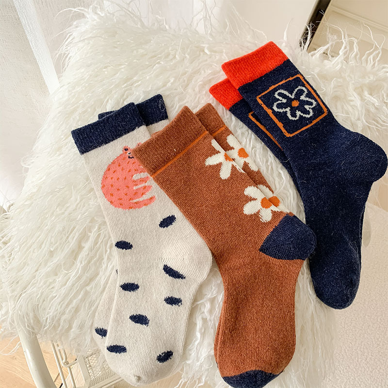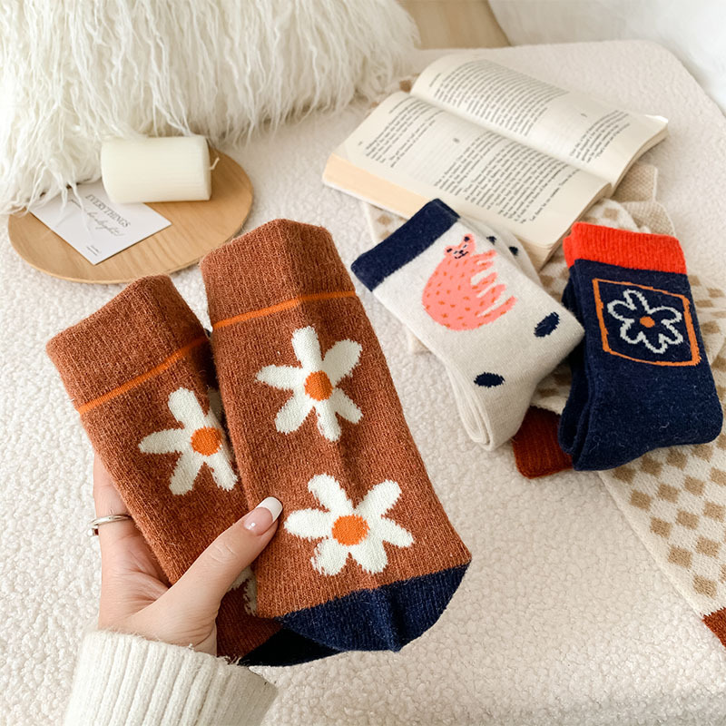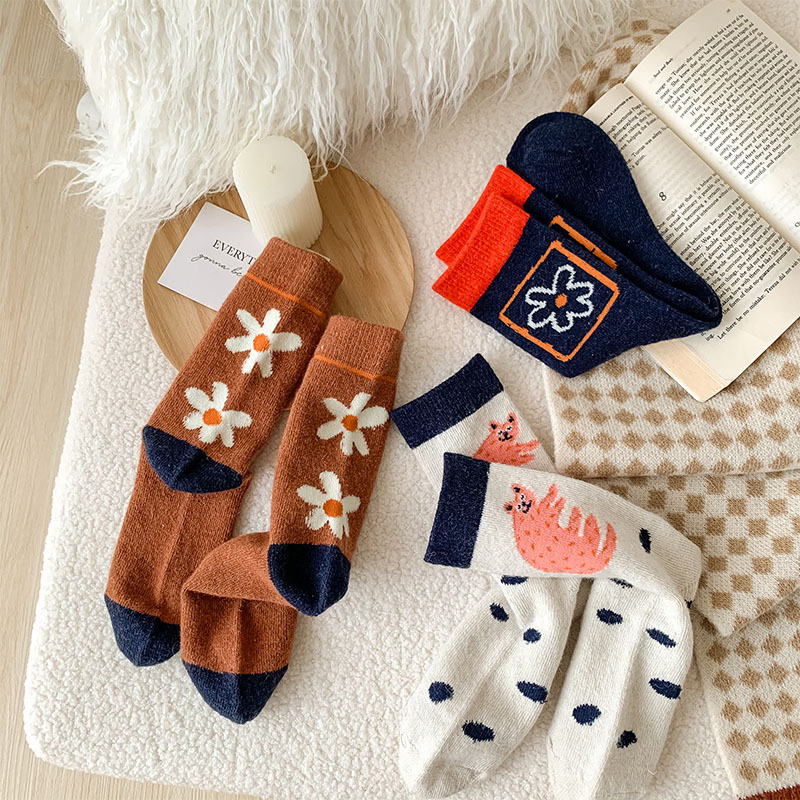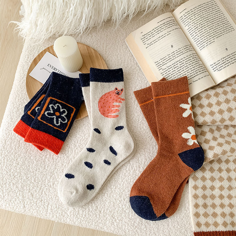 甜美花朵少女系羊毛袜温暖加厚学院风中筒袜可爱小猫学生休闲长袜