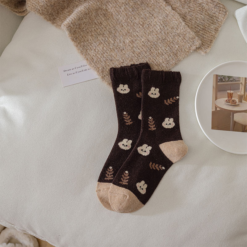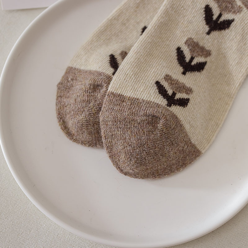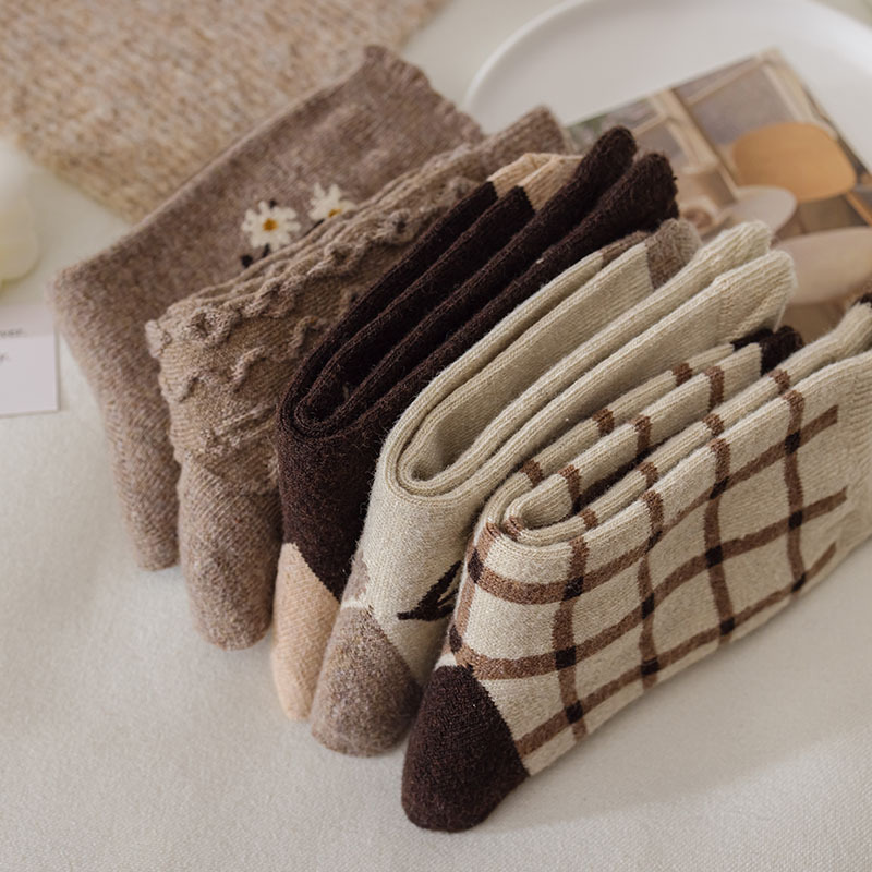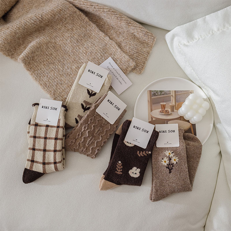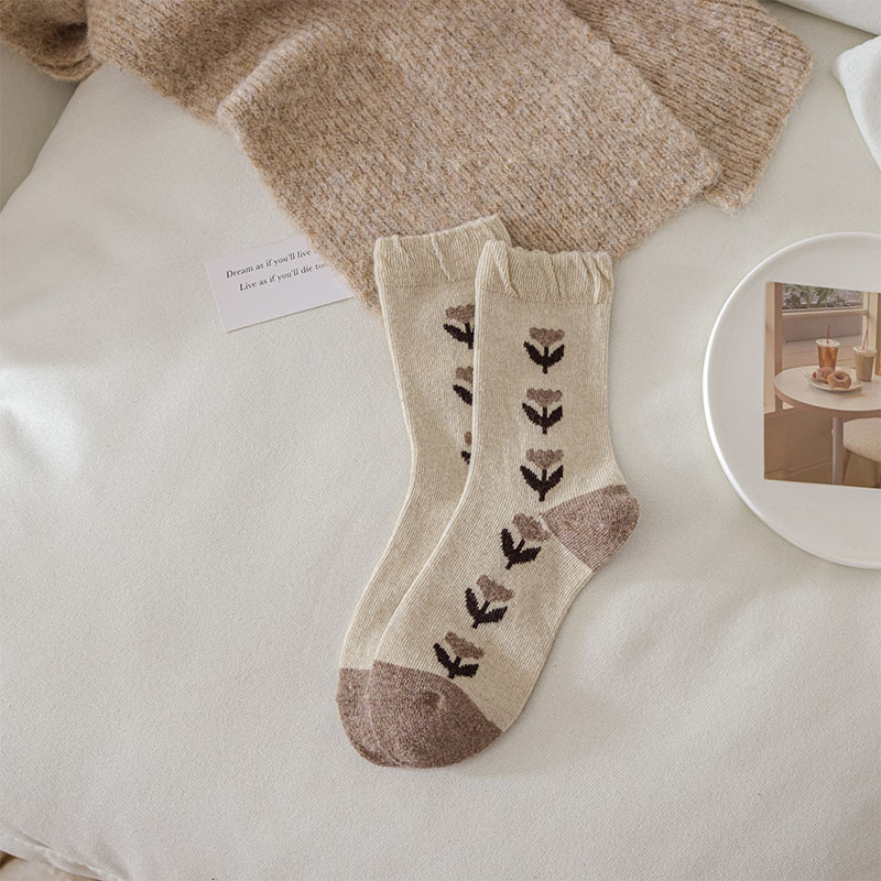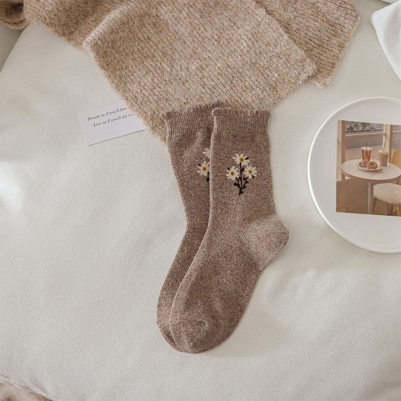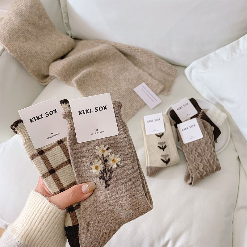 袜子女复古文艺咖色小花羊毛中筒袜冬季加厚保暖日系花边堆堆袜潮