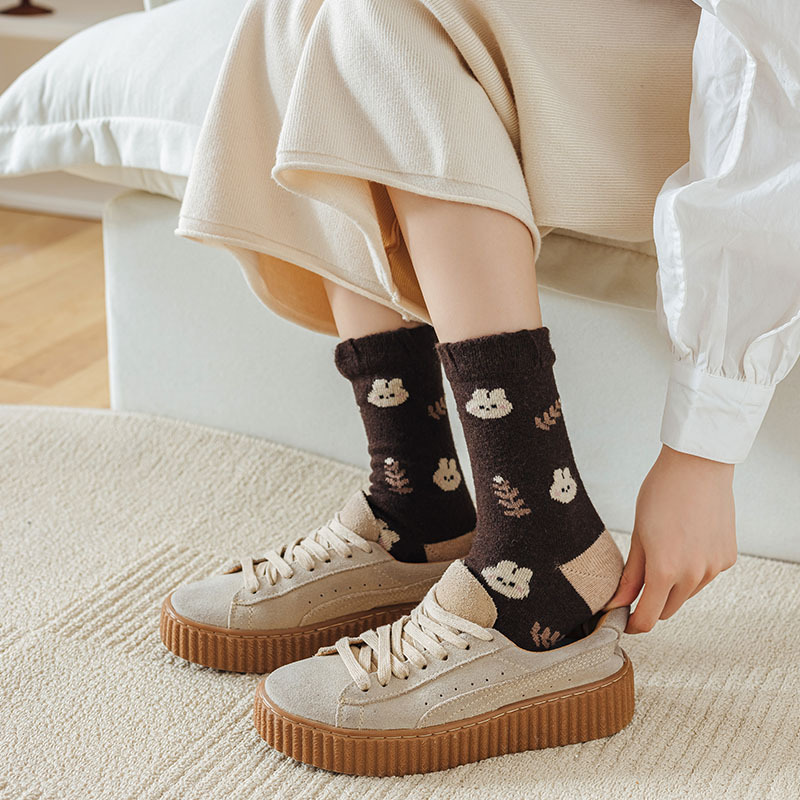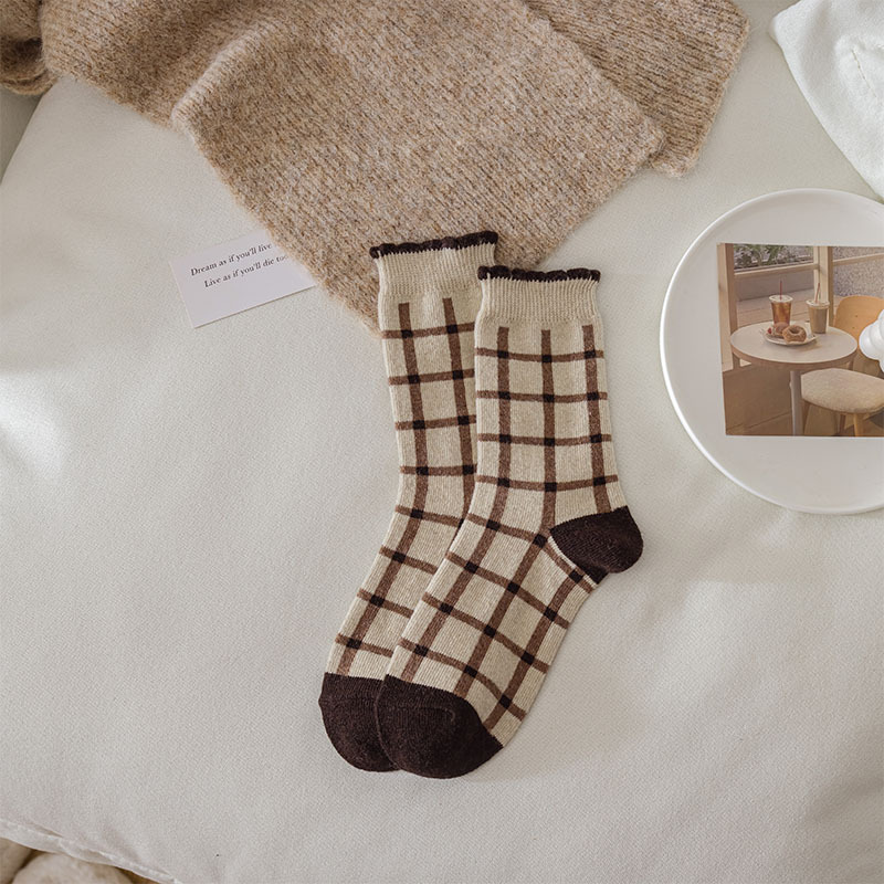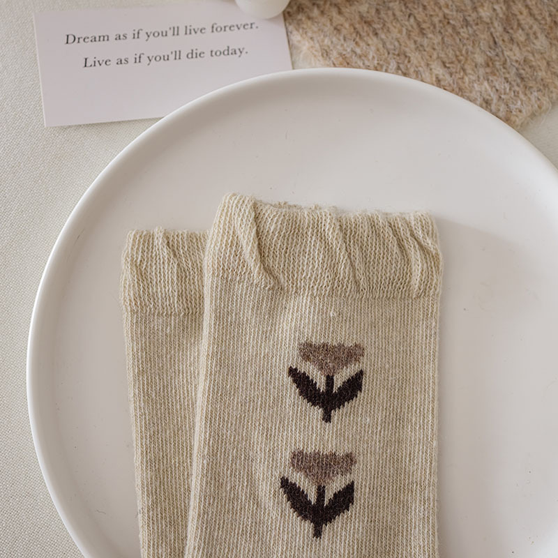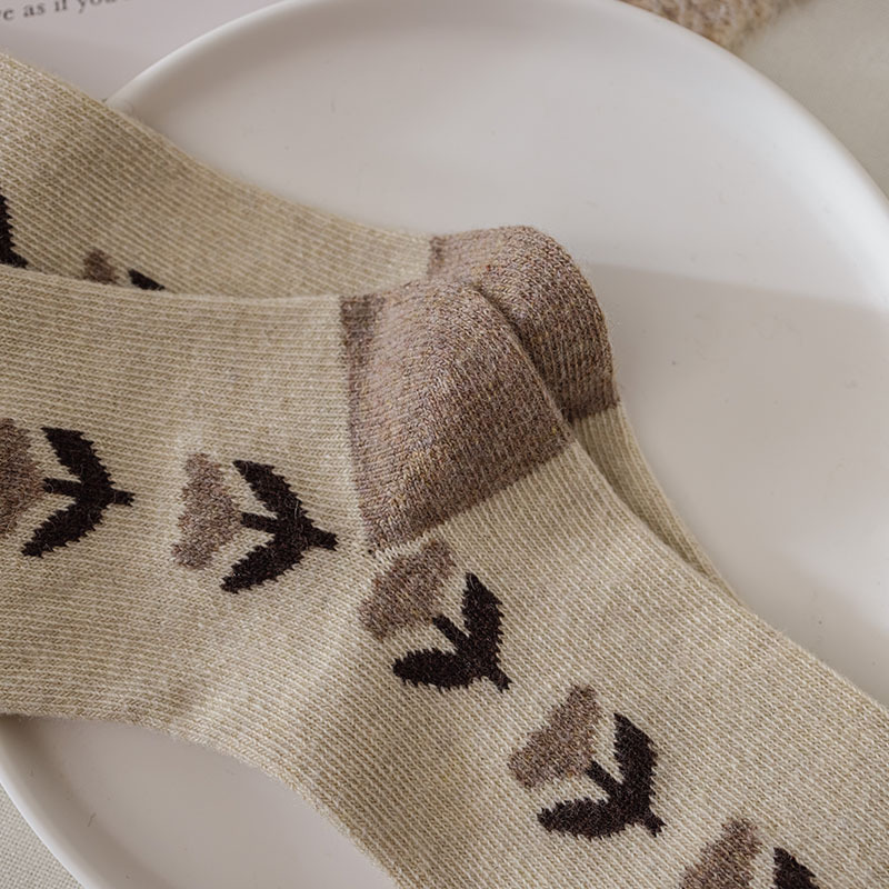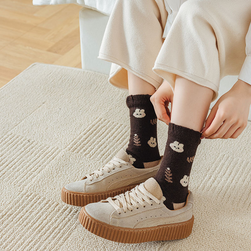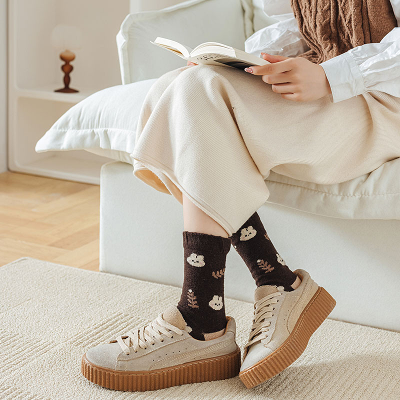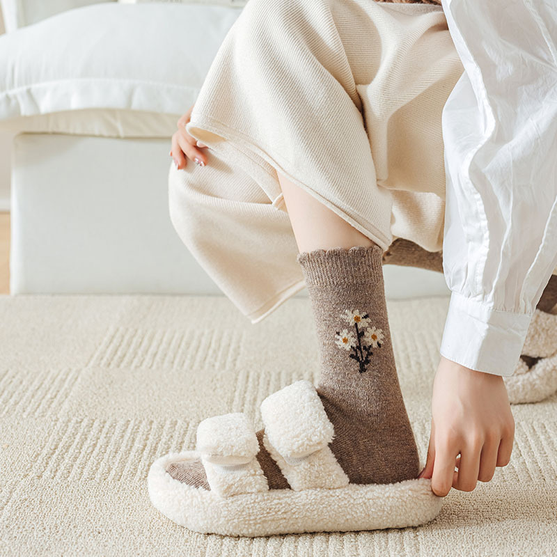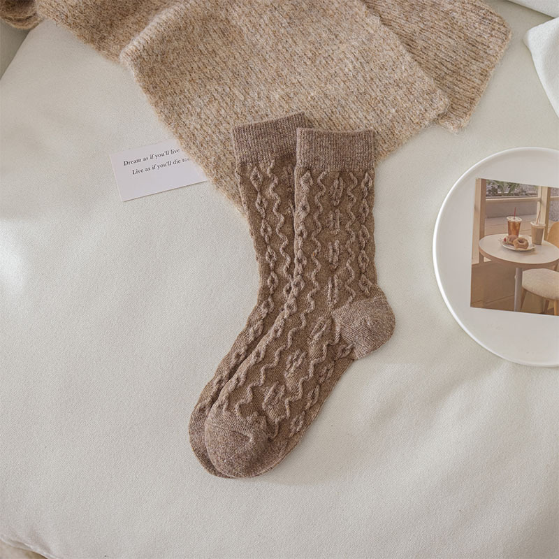 袜子女复古文艺咖色小花羊毛中筒袜冬季加厚保暖日系花边堆堆袜潮