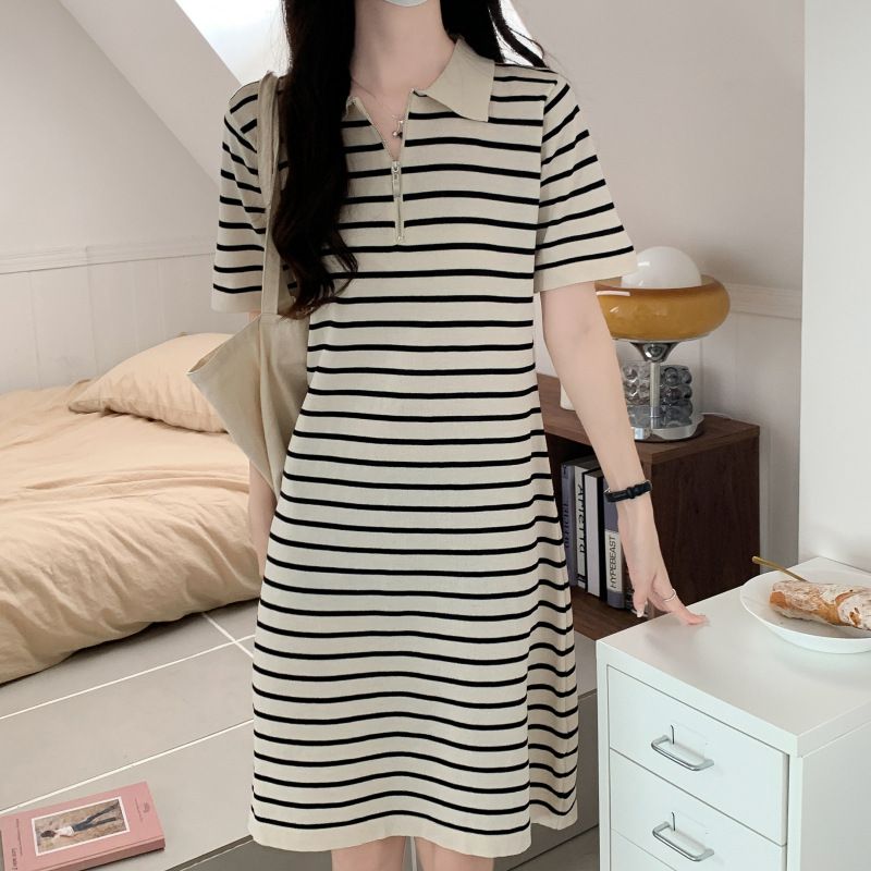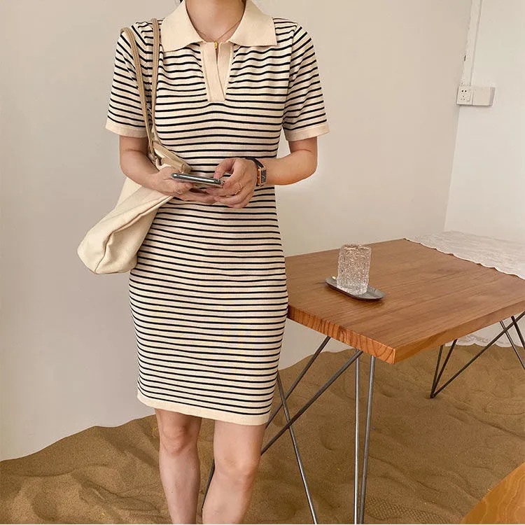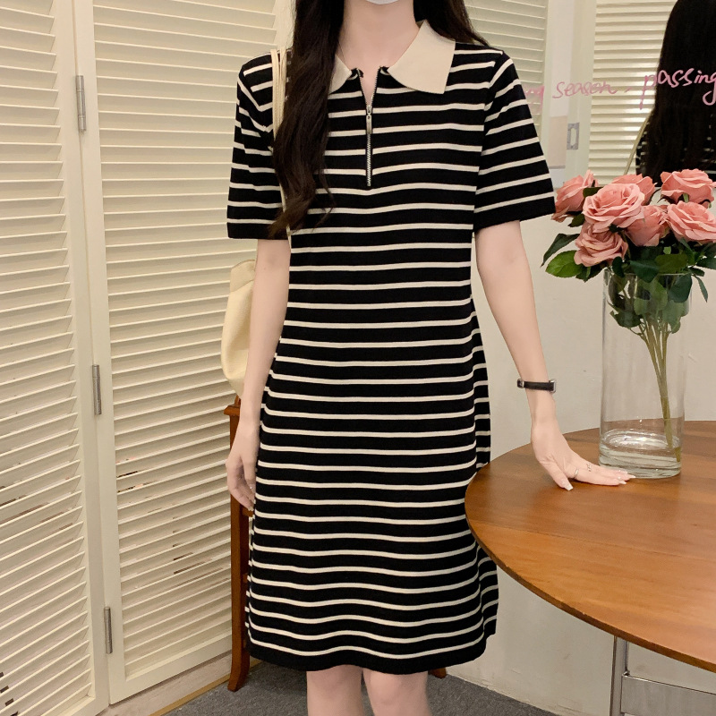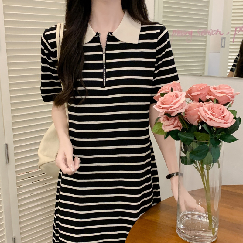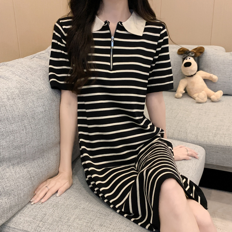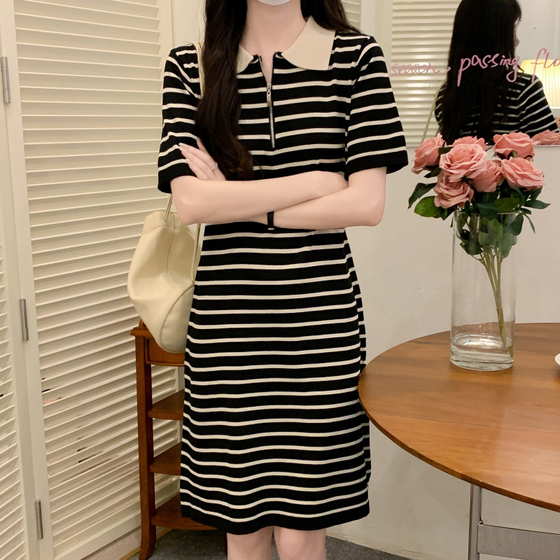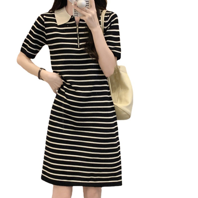 2023连衣裙夏季女法式今年流行Polo领宽松条纹百搭针织短裙子潮