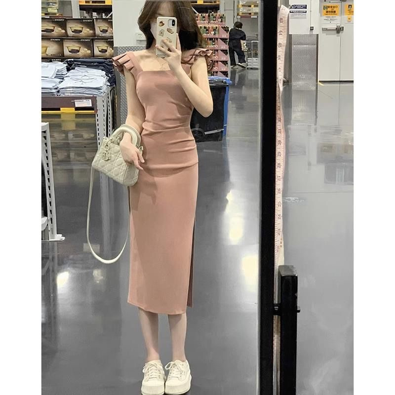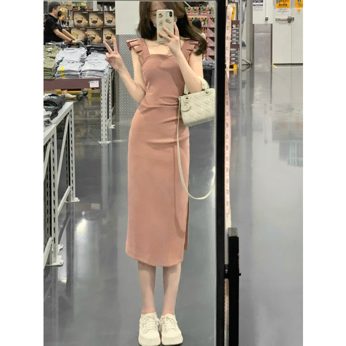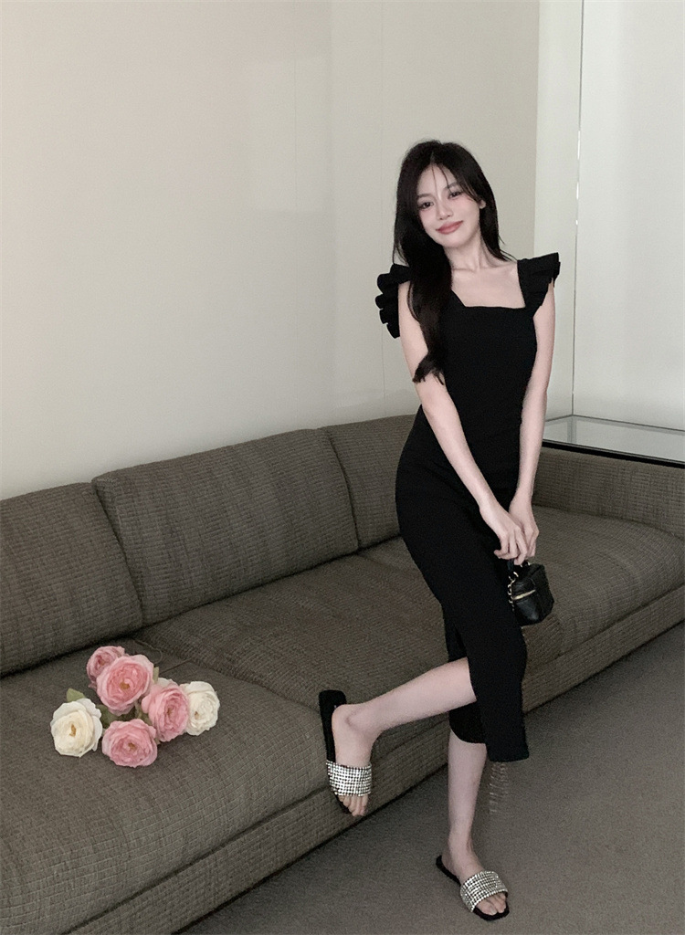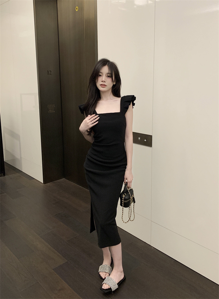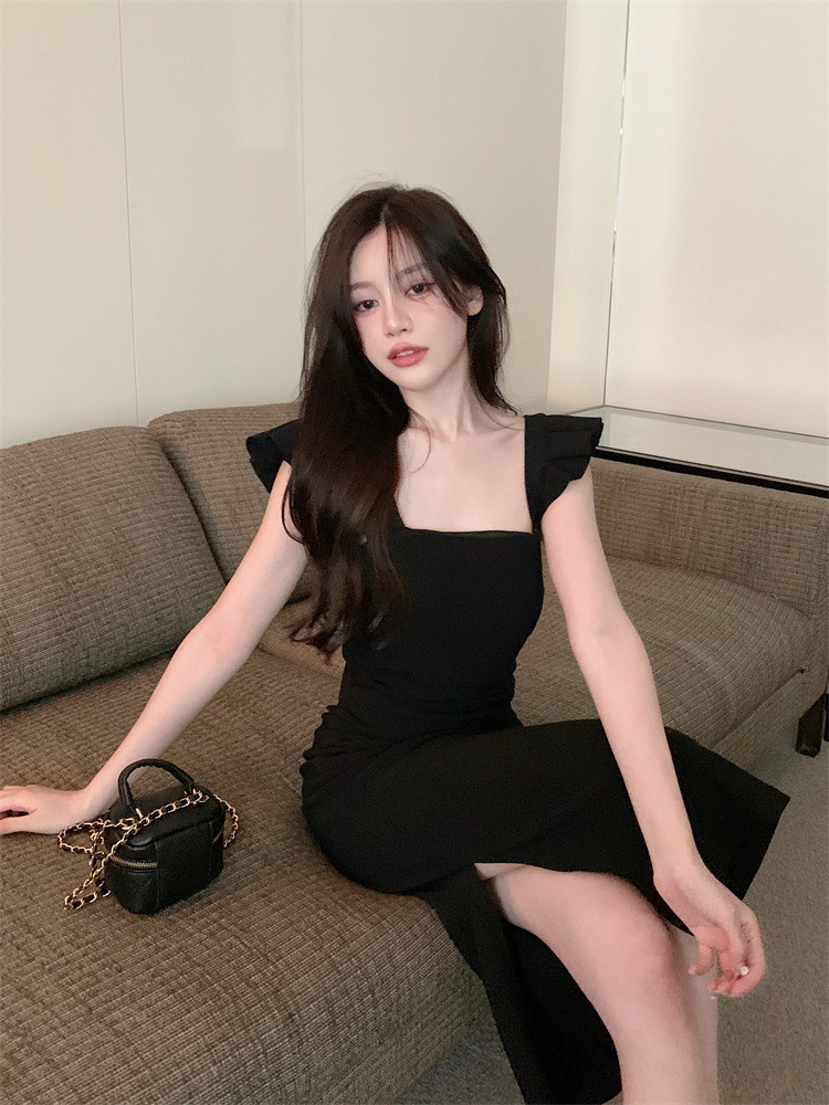 法式小飞袖连衣裙子女夏季设计感小众气质收腰显瘦修身侧开叉长裙