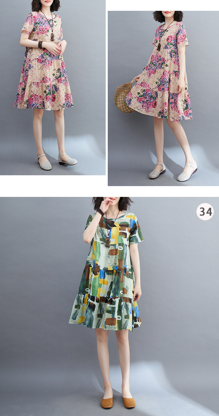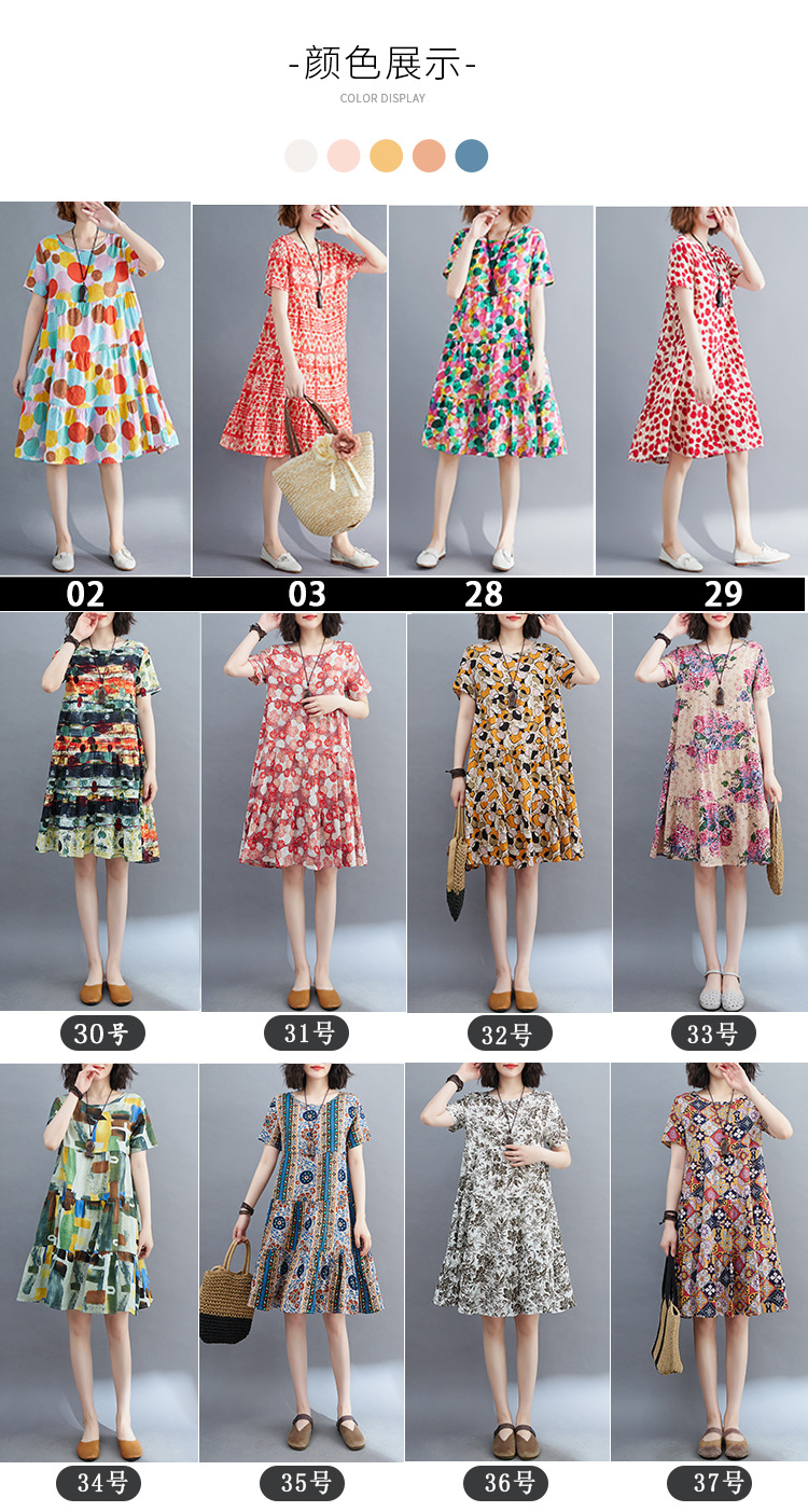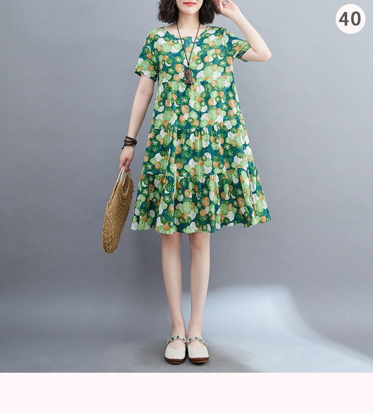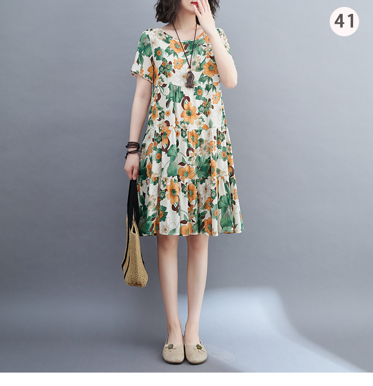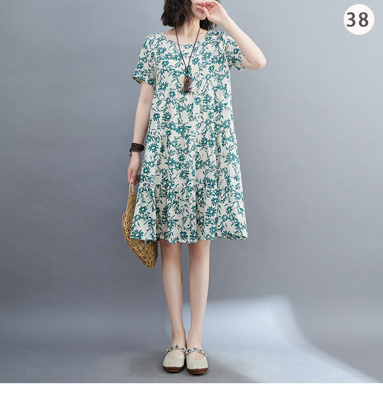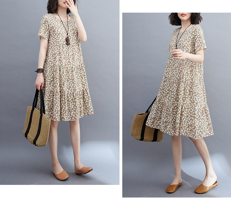 棉麻遮肚子连衣裙女2023夏装韩版碎花短袖大码宽松显瘦中长裙5516