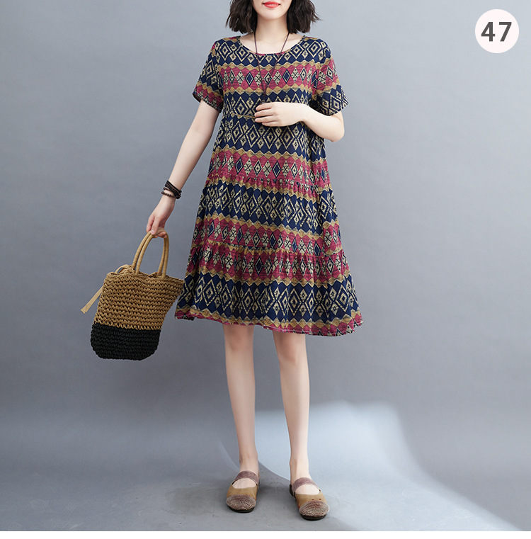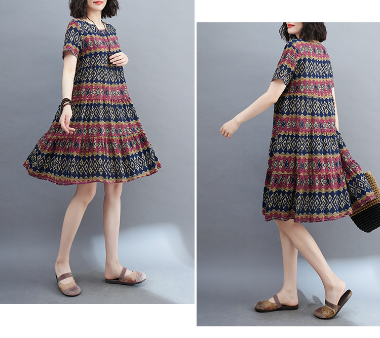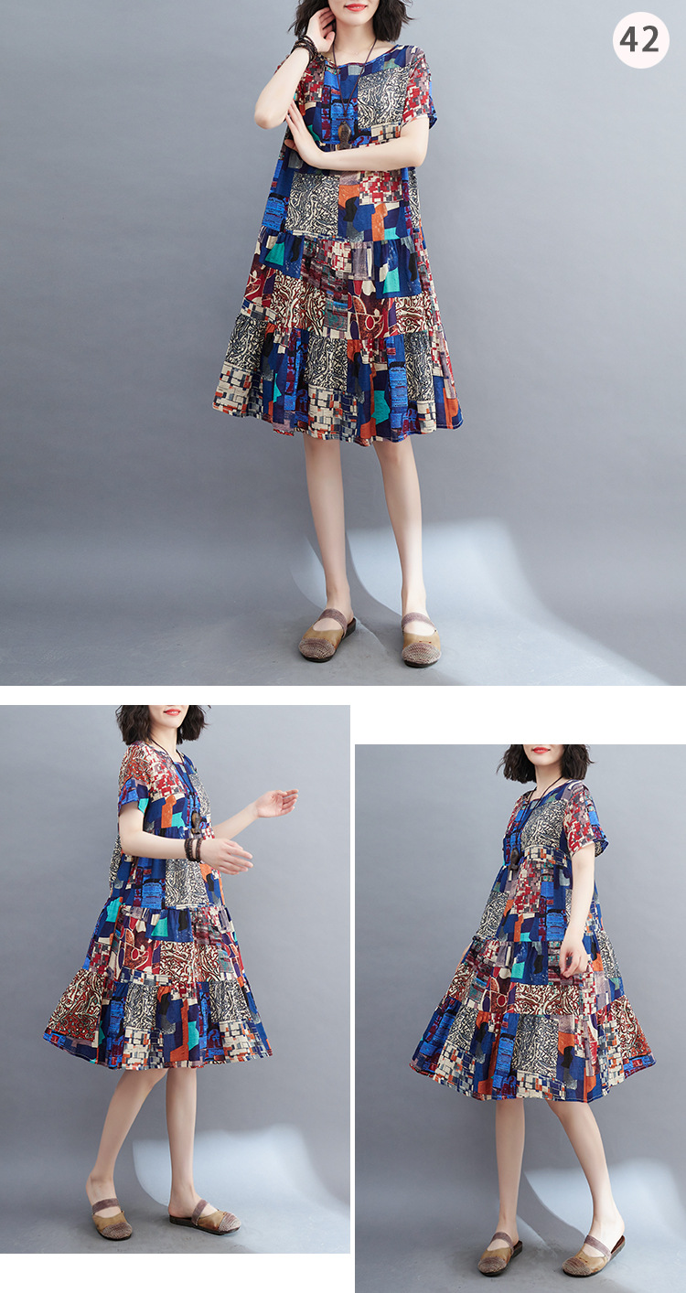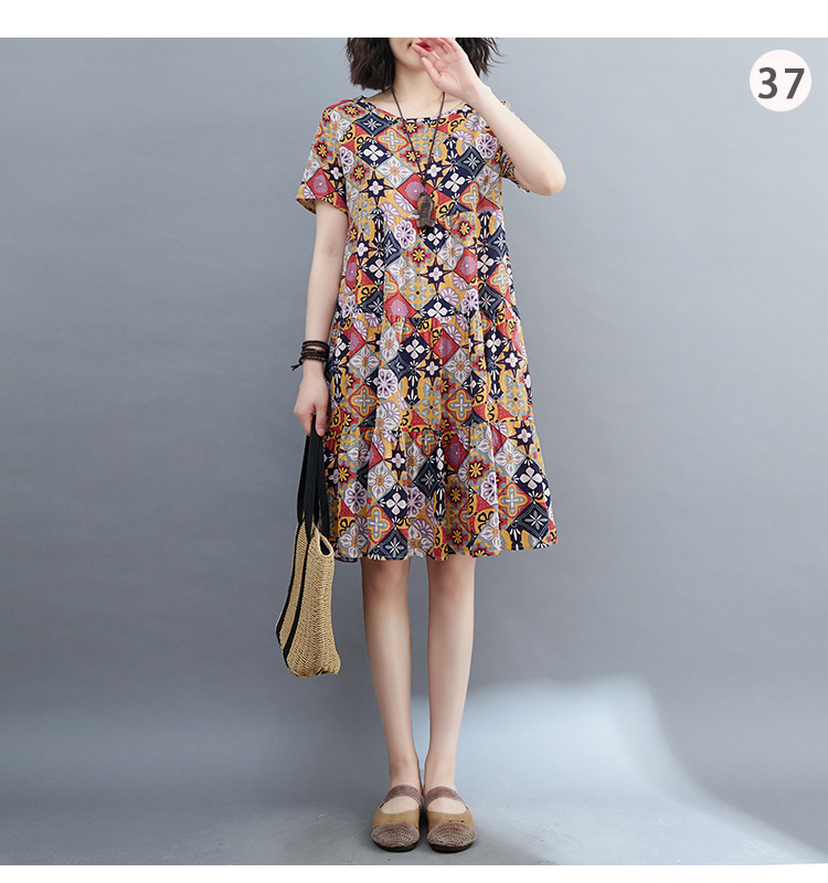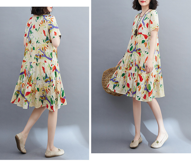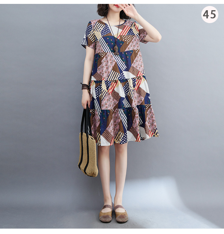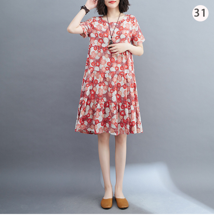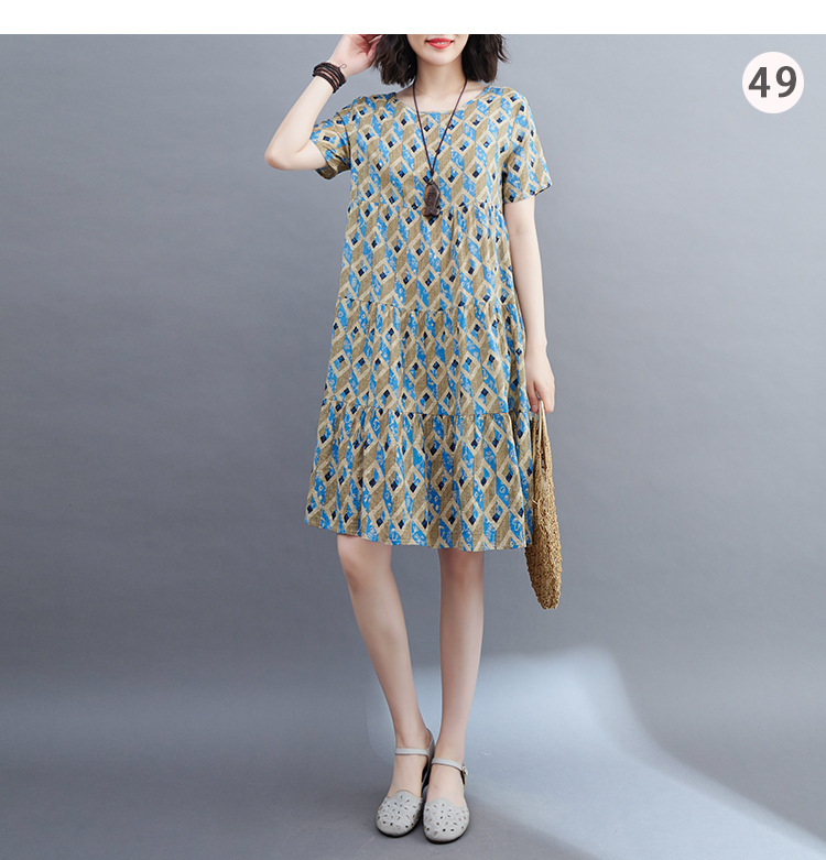 棉麻遮肚子连衣裙女2023夏装韩版碎花短袖大码宽松显瘦中长裙5516
