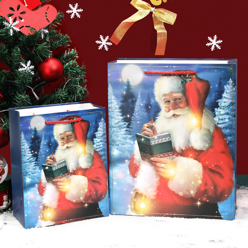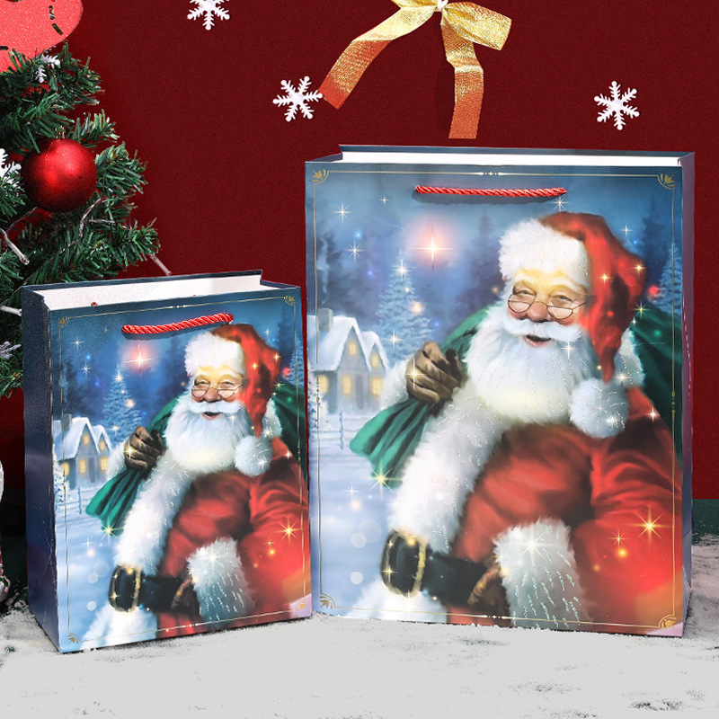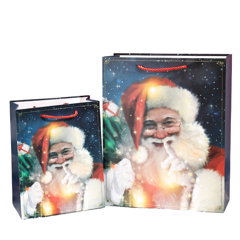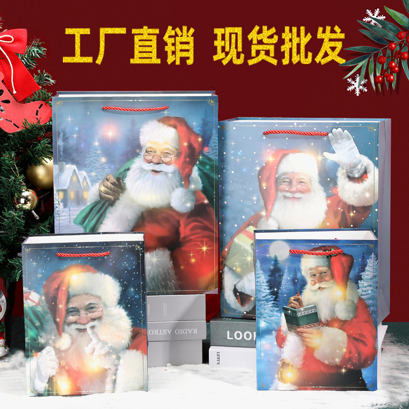 跨境热销新款印花圣诞老人白卡纸手提袋圣诞节礼物方底通用包装袋