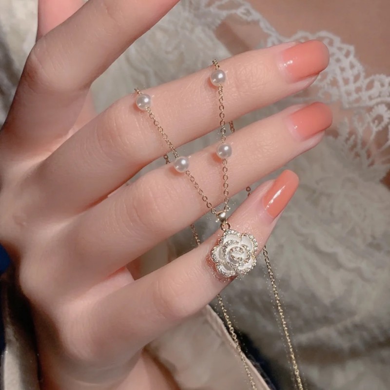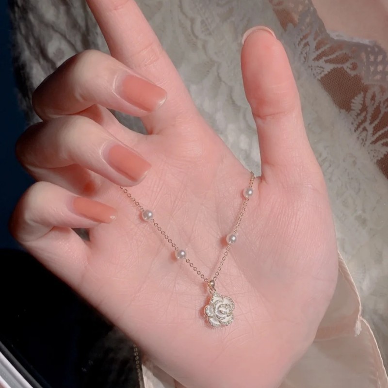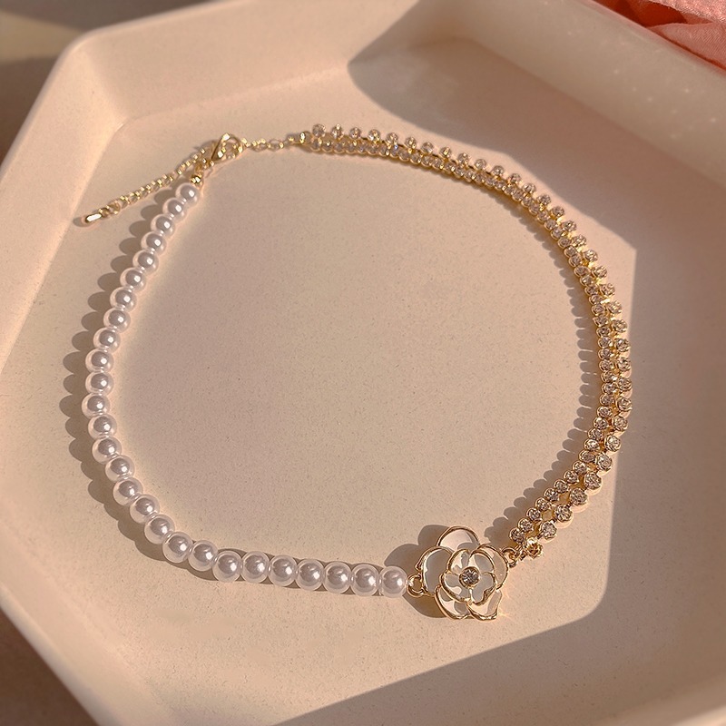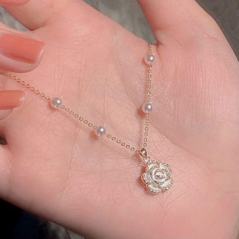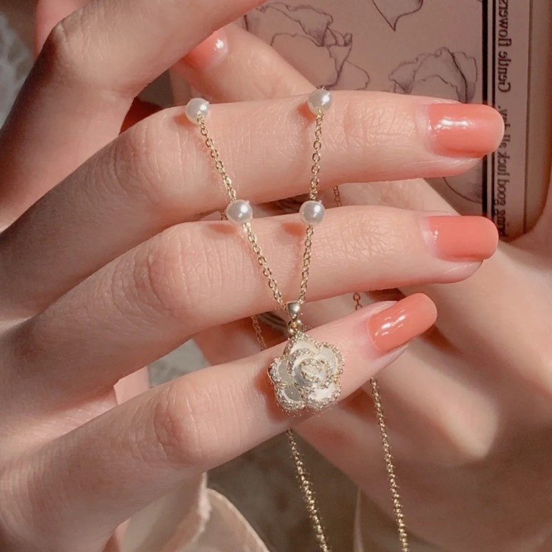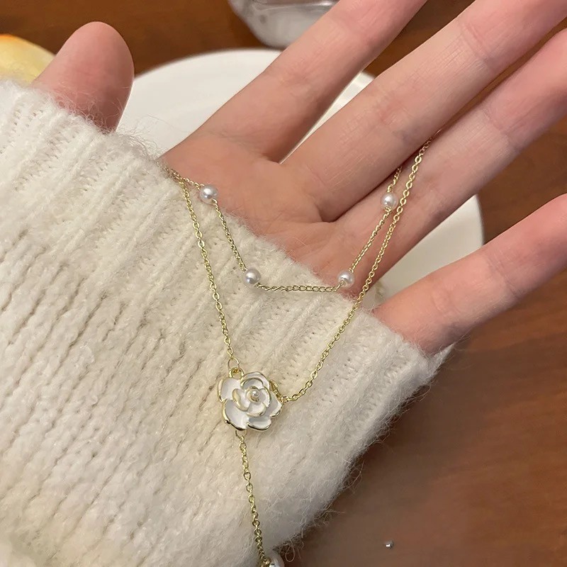 法式山茶花项链女小香风轻奢小众夏季高级感简约气质珍珠合金颈链