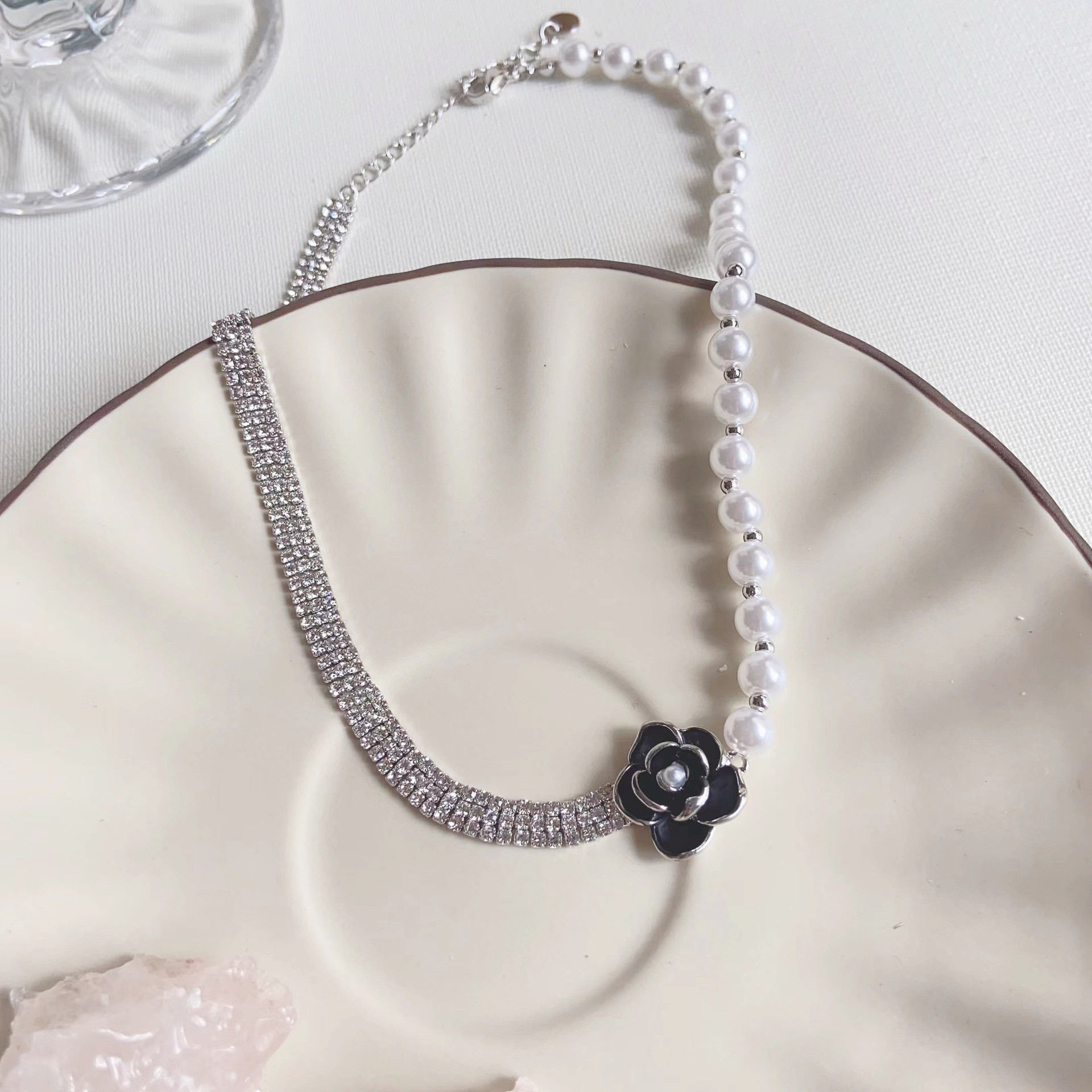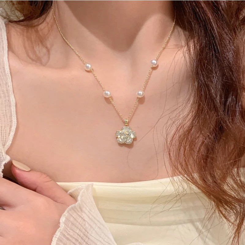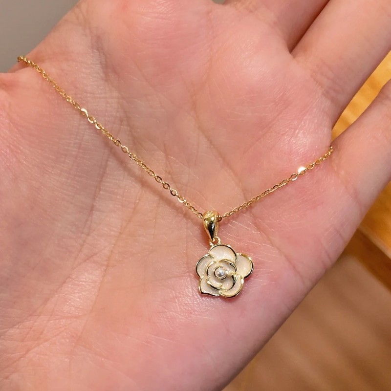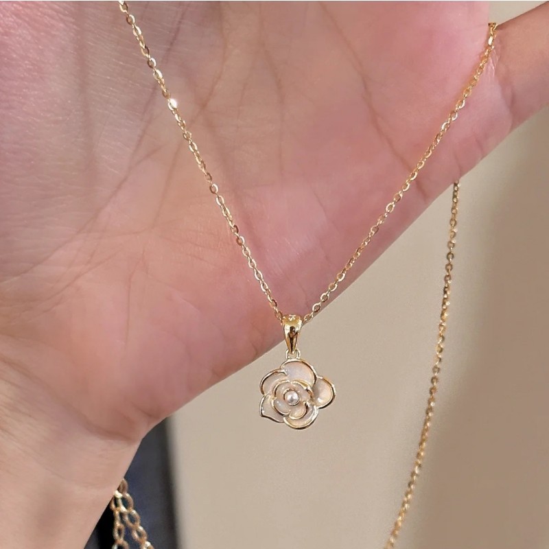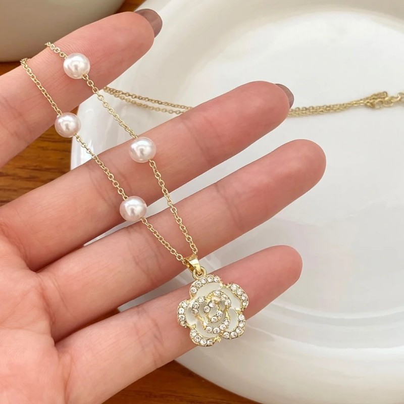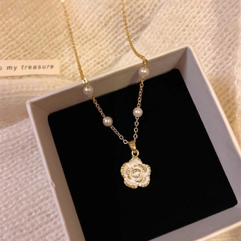 法式山茶花项链女小香风轻奢小众夏季高级感简约气质珍珠合金颈链