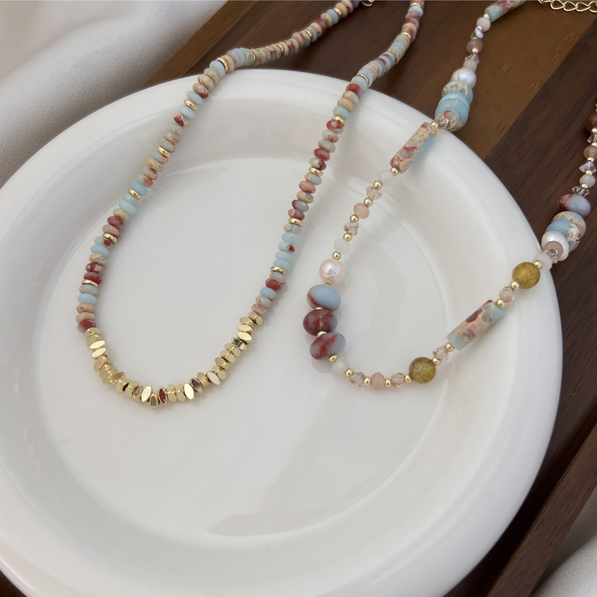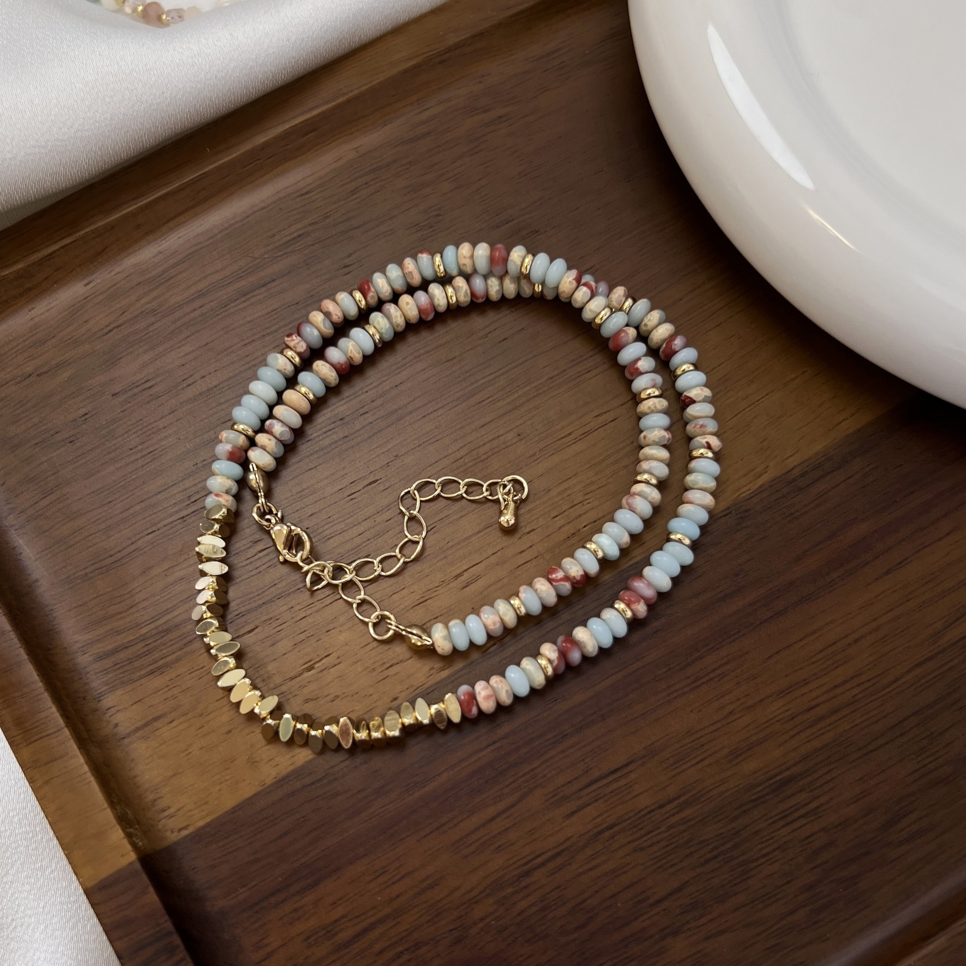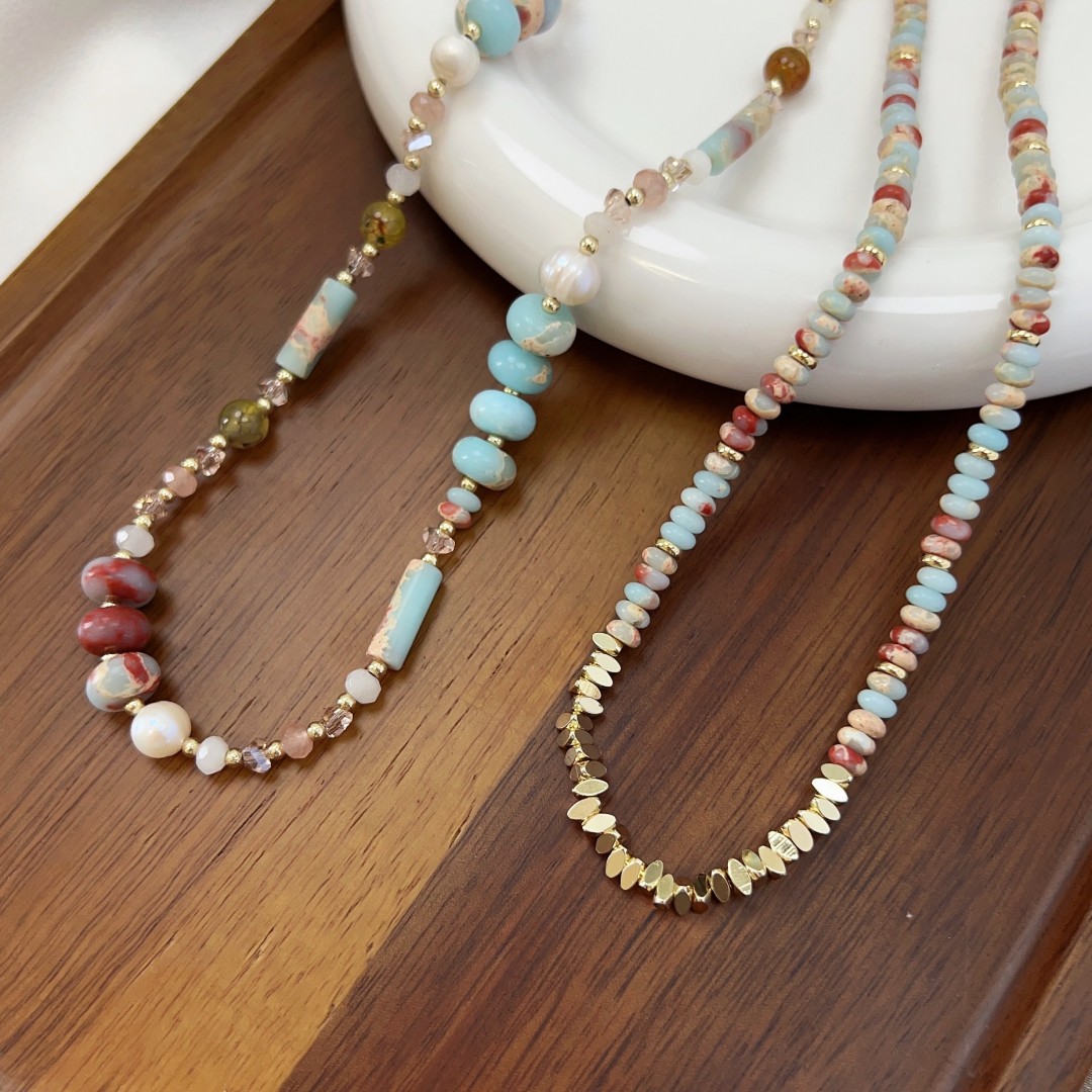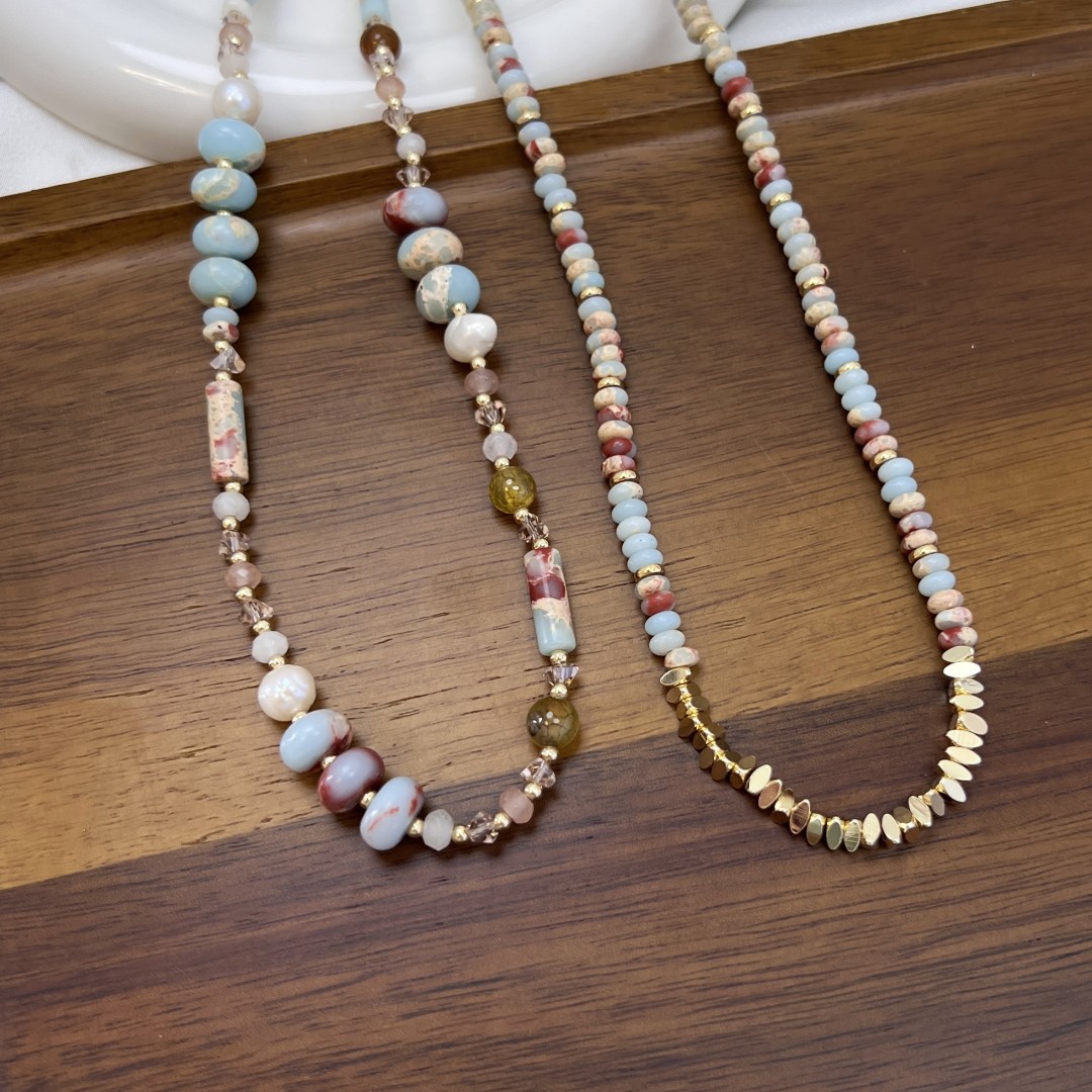 蓝色天然石项链小众复古花纹石串珠彩色锁骨链简约高级感叠戴颈链