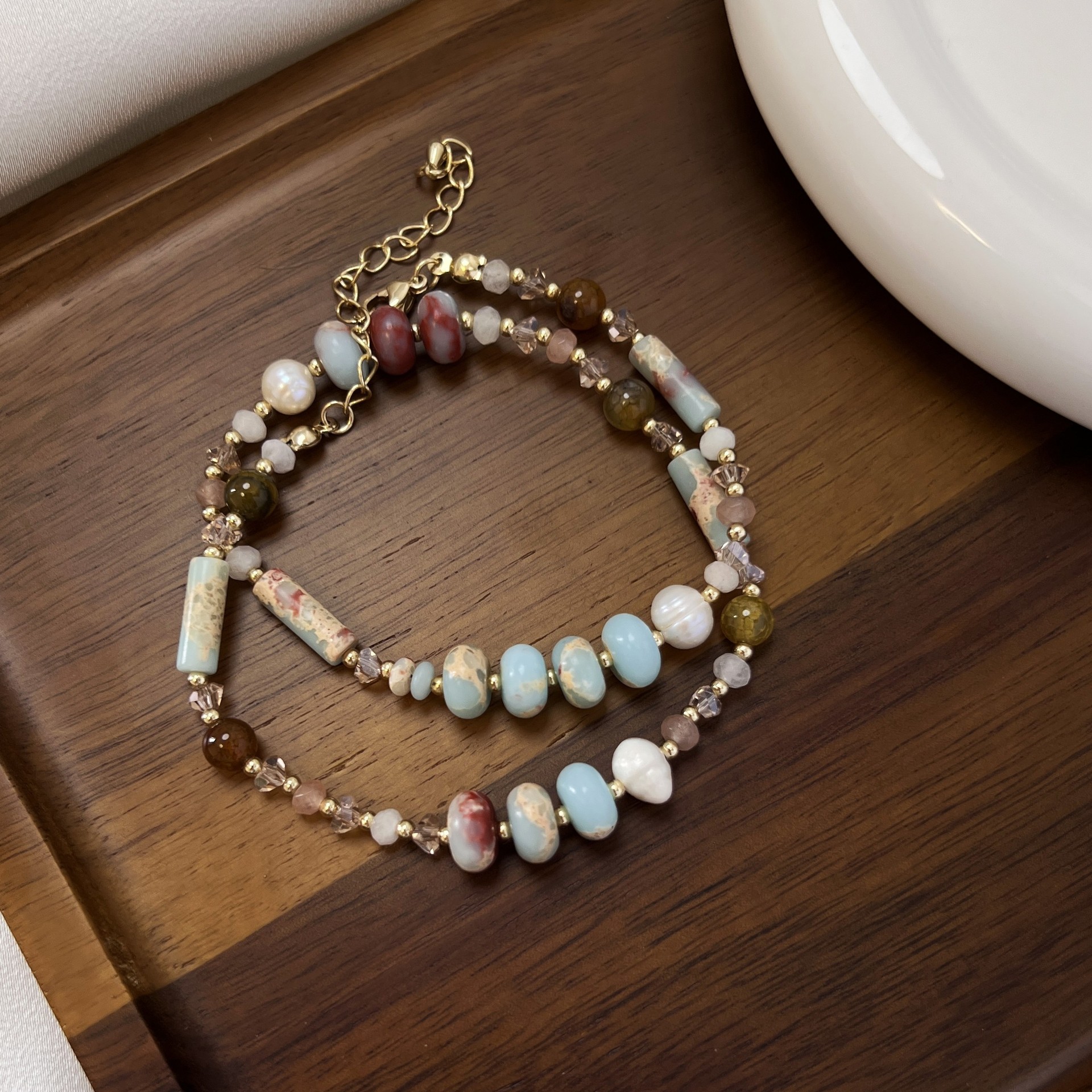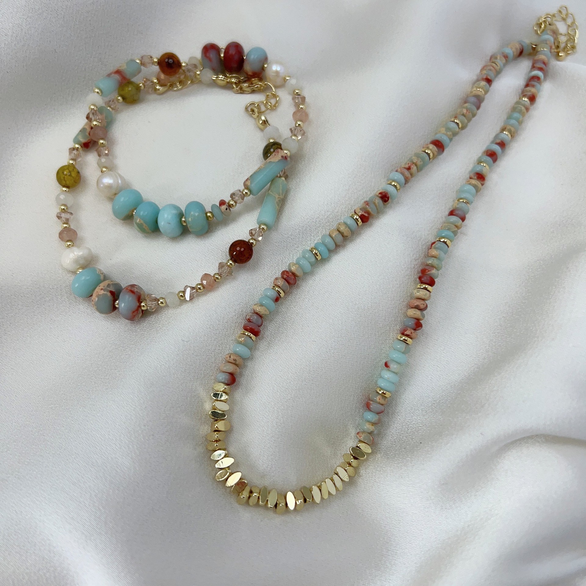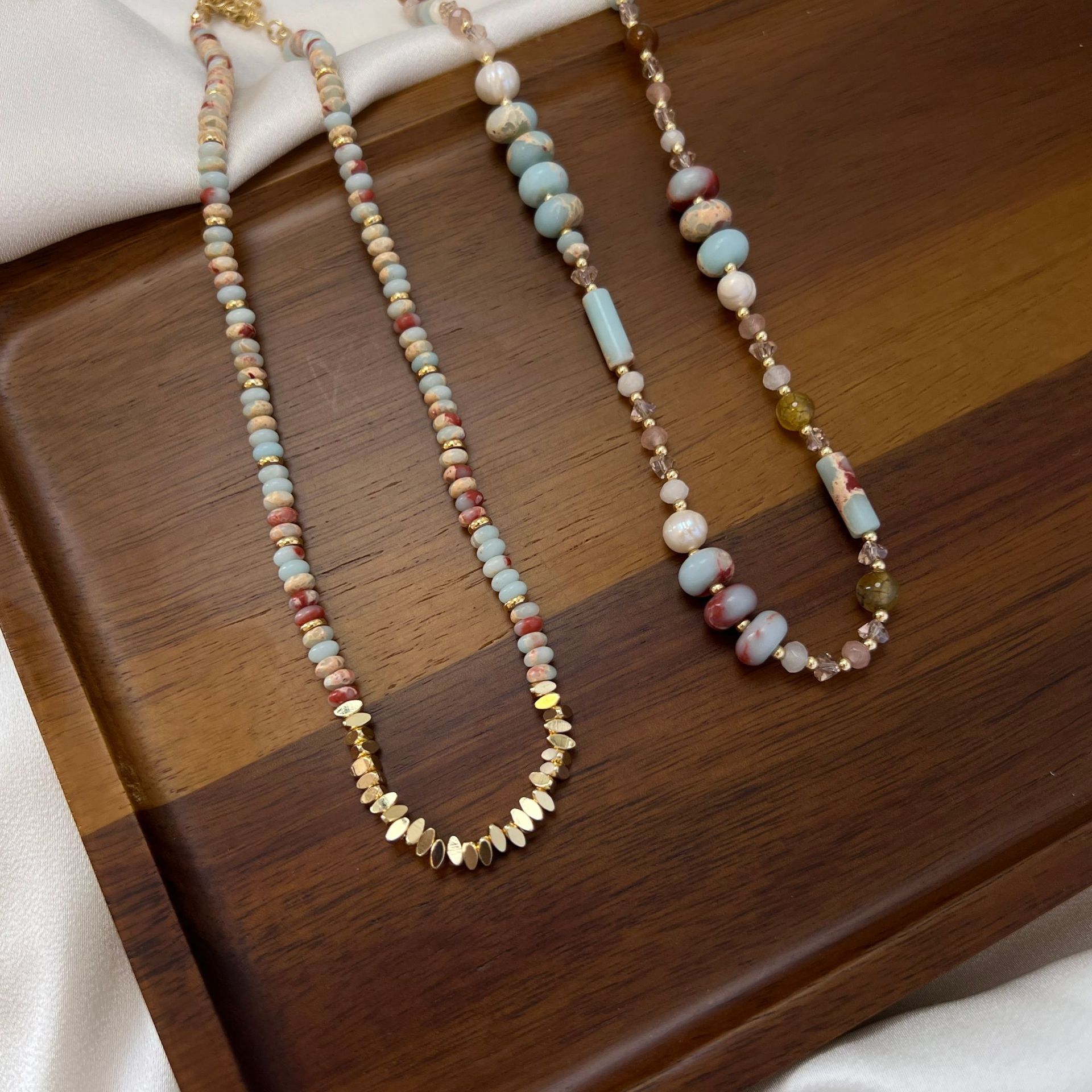 蓝色天然石项链小众复古花纹石串珠彩色锁骨链简约高级感叠戴颈链