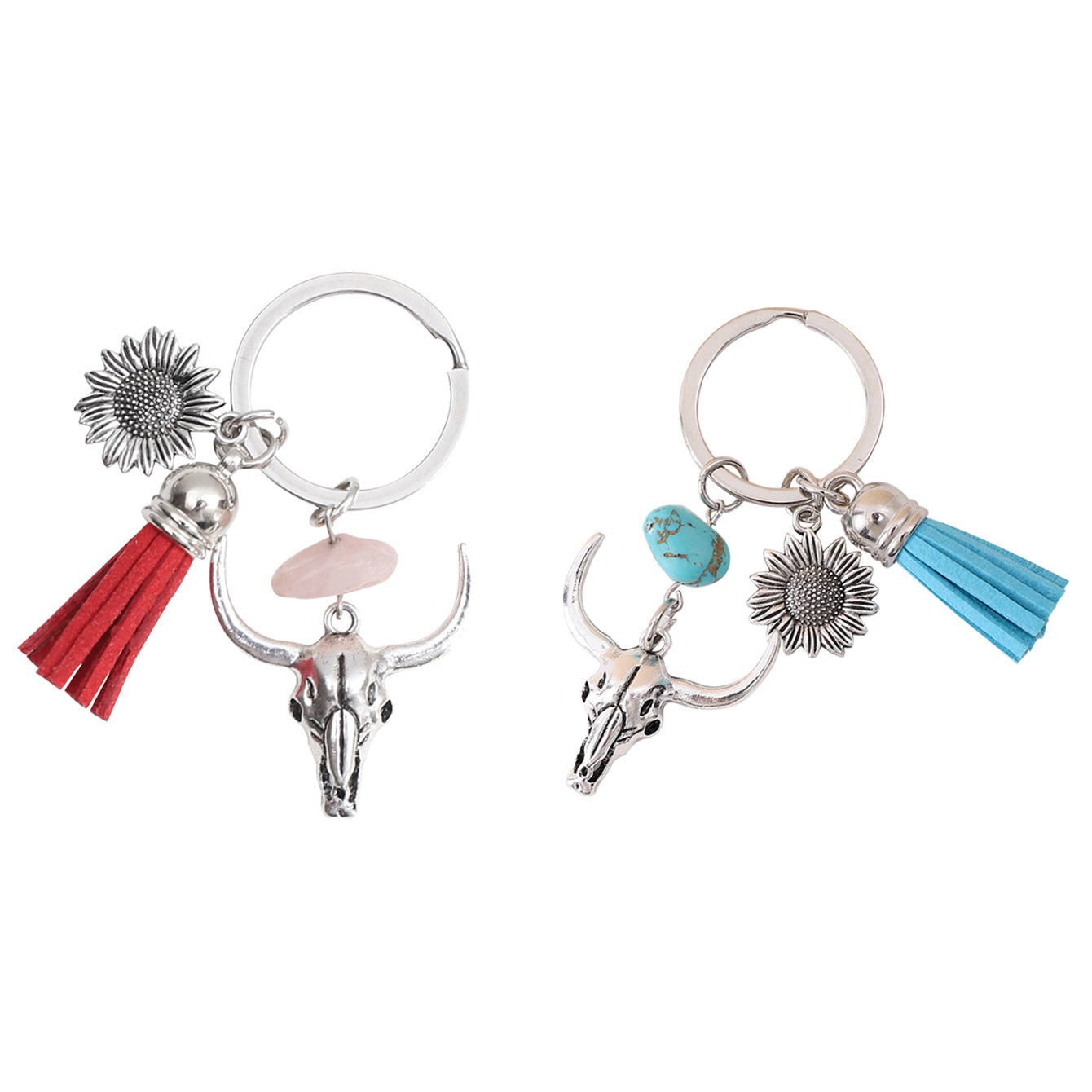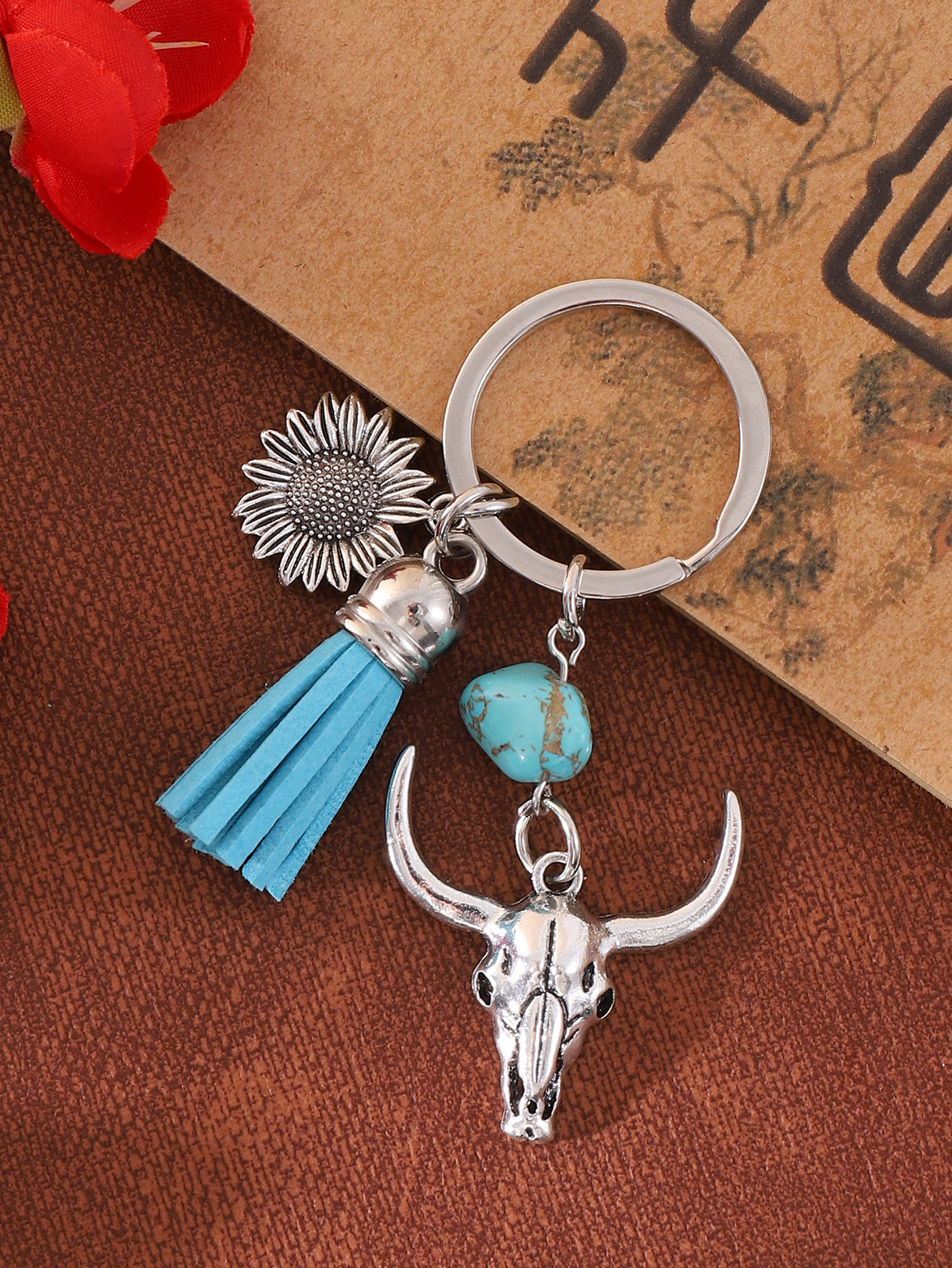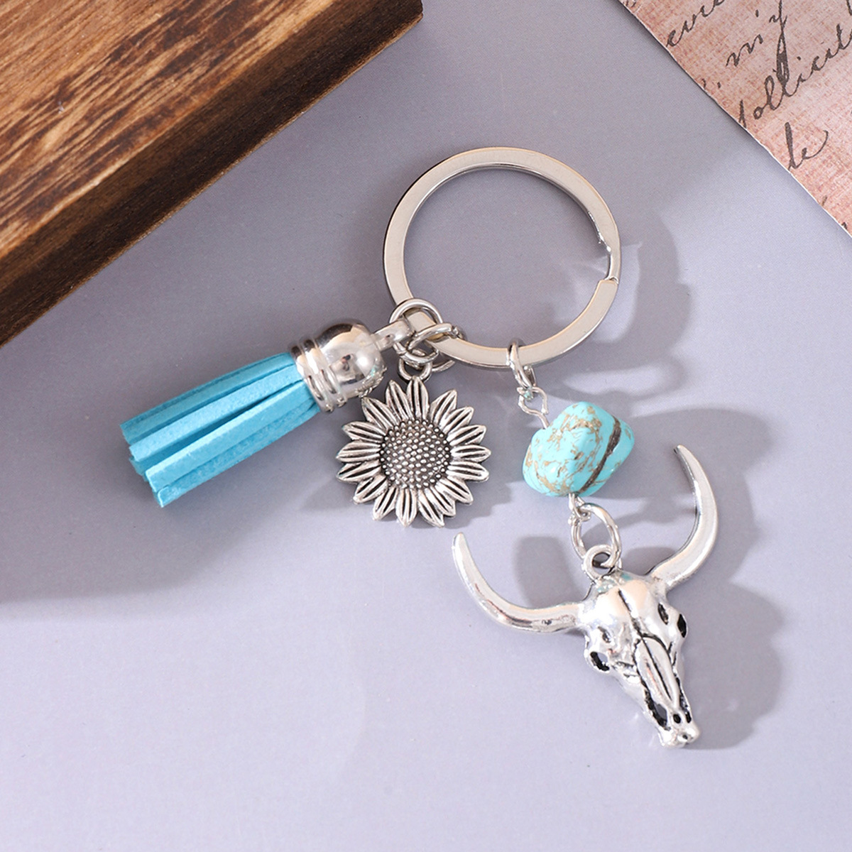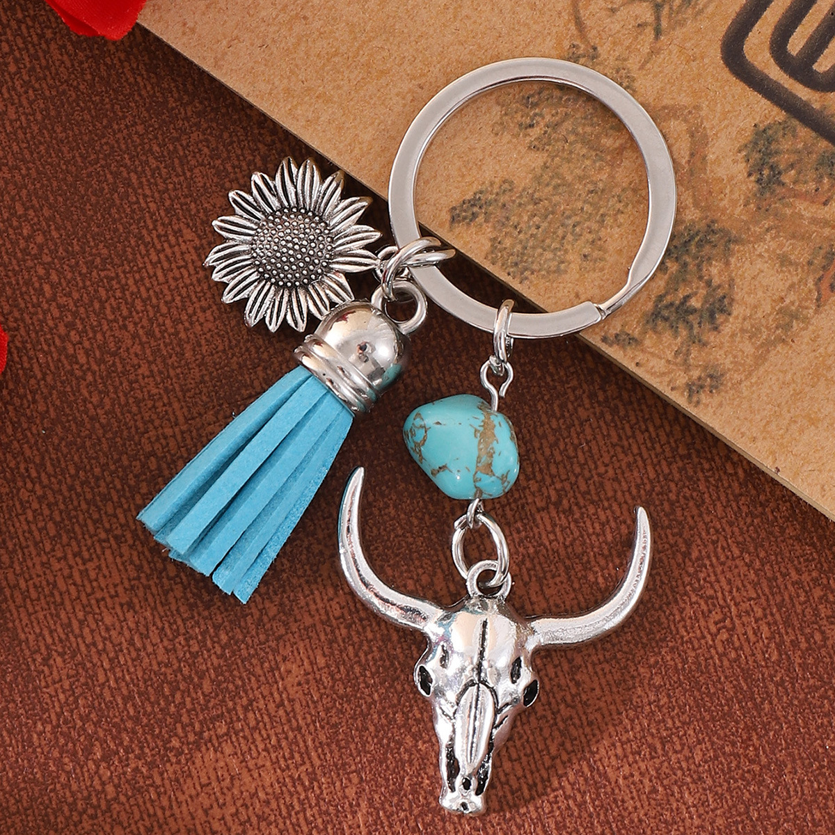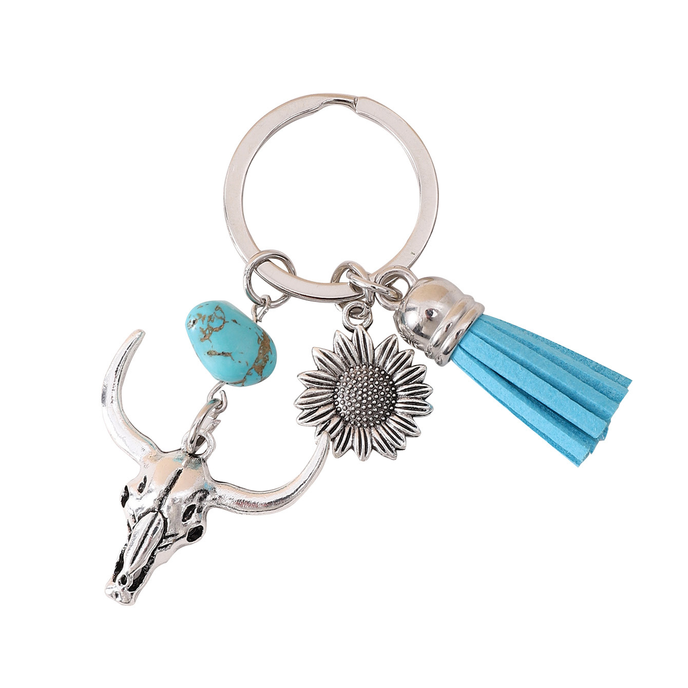 红色韩国绒流苏钥匙扣合金牛头向日葵挂件天然松石跨境欧美亚马
