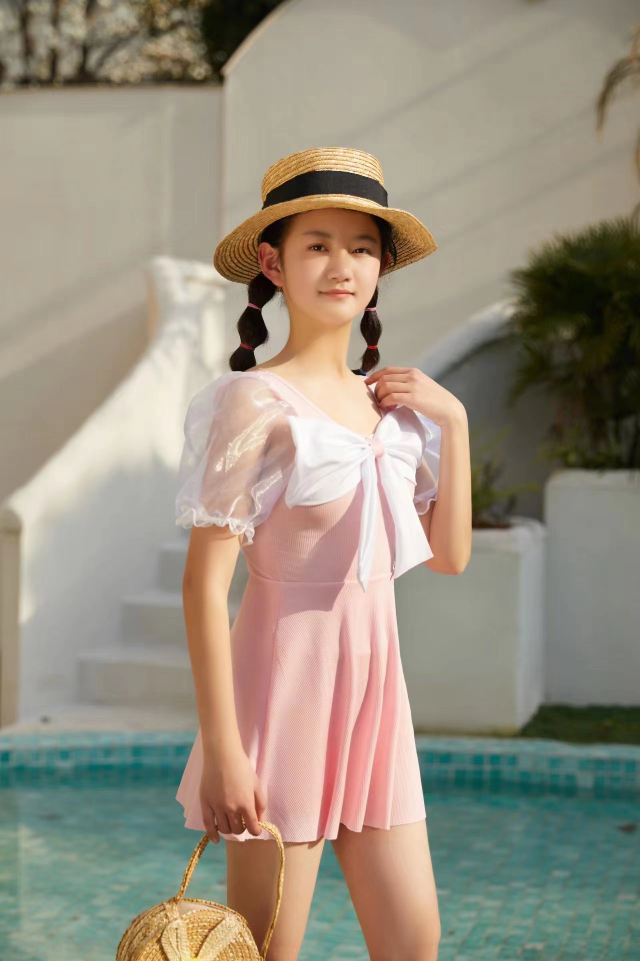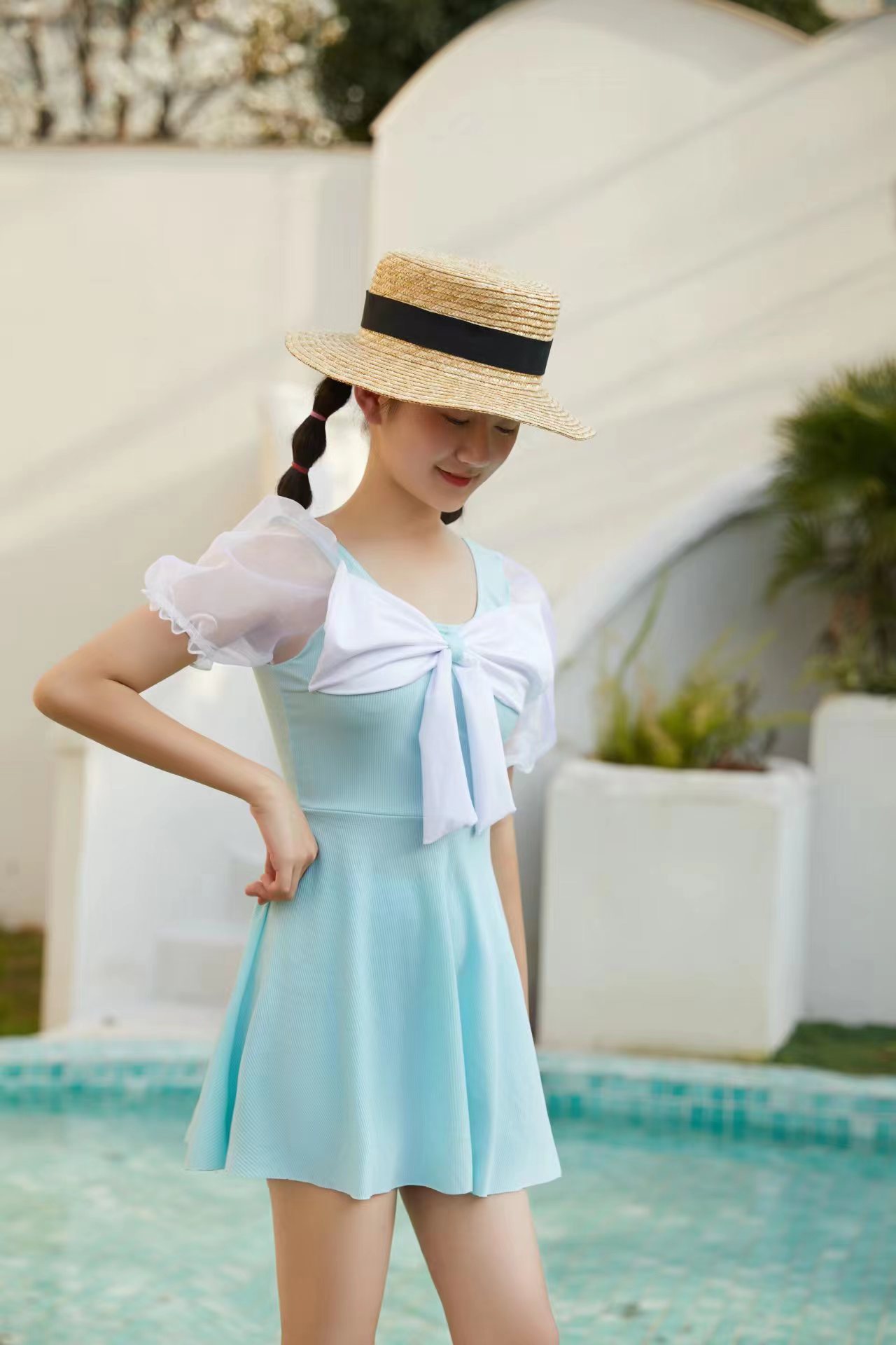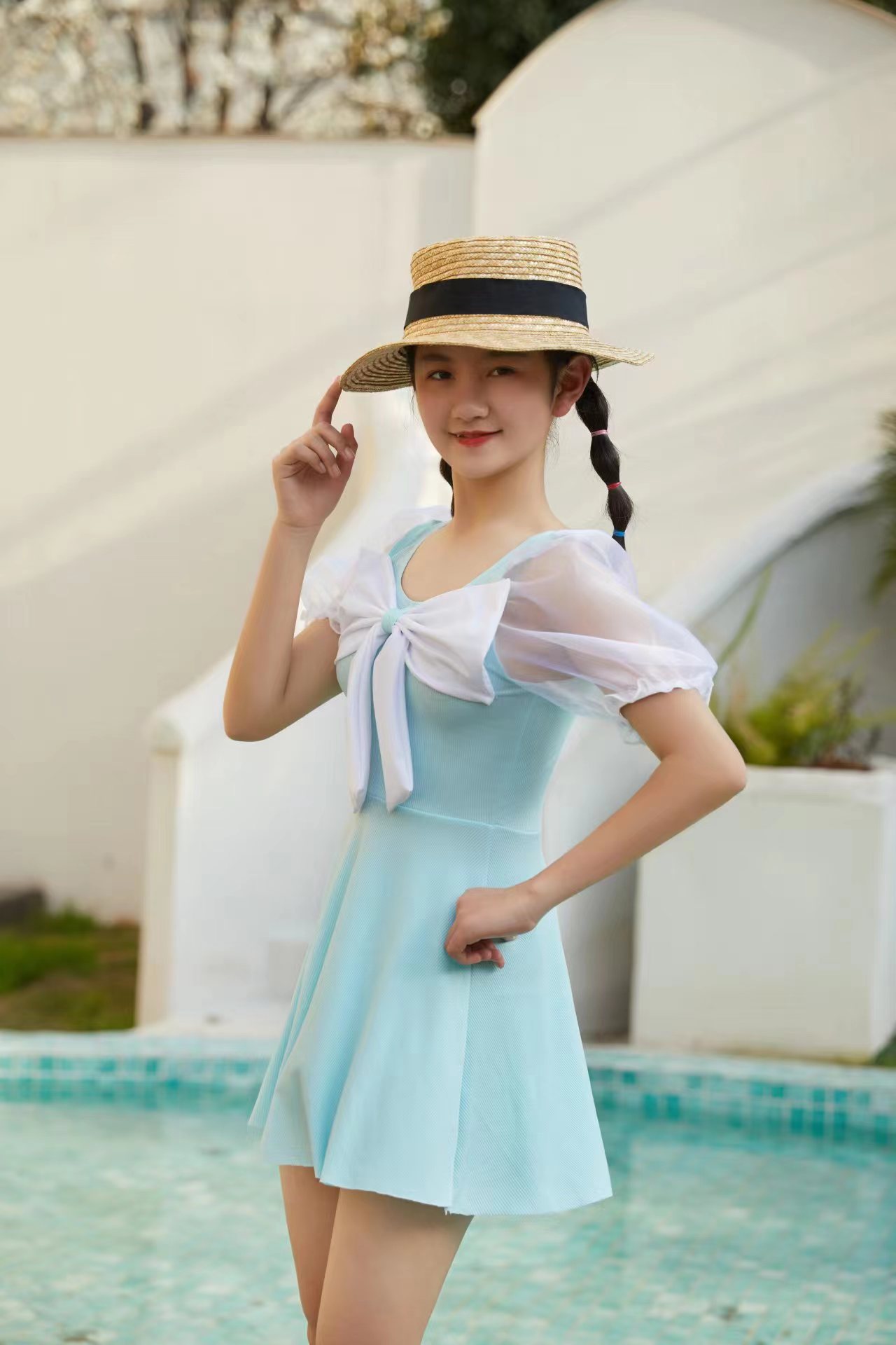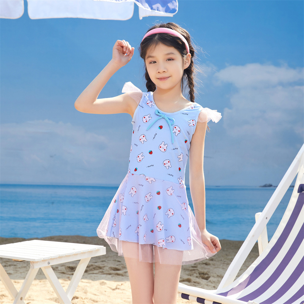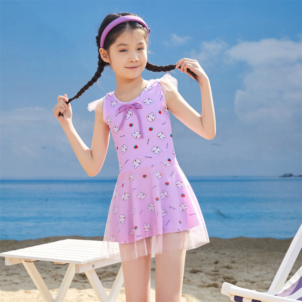 儿童泳衣女孩仙女款蝴蝶结连体ins游泳衣中大童保守裙式泳装批发