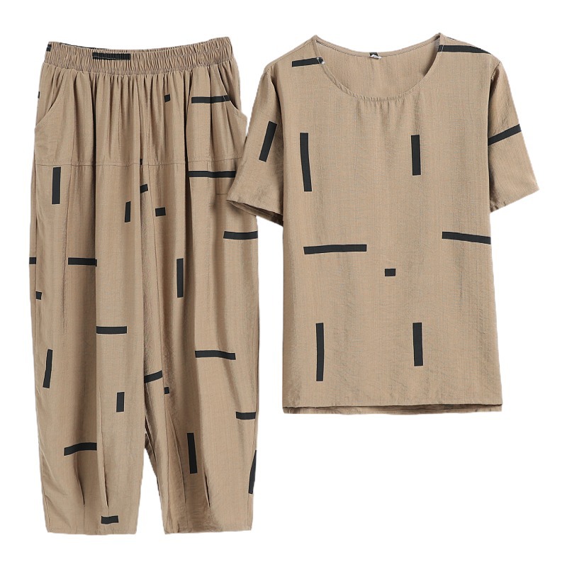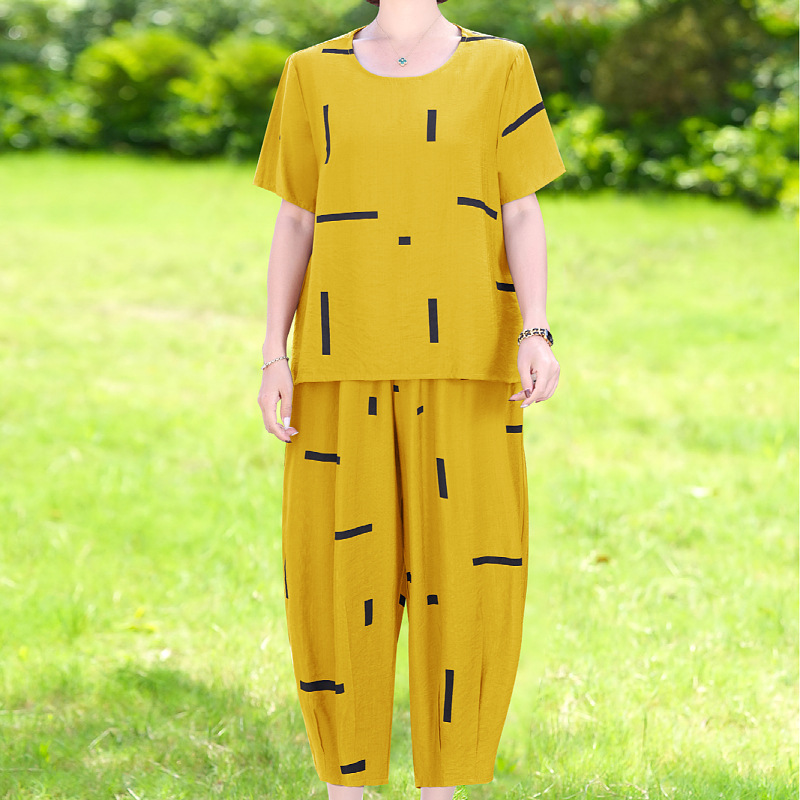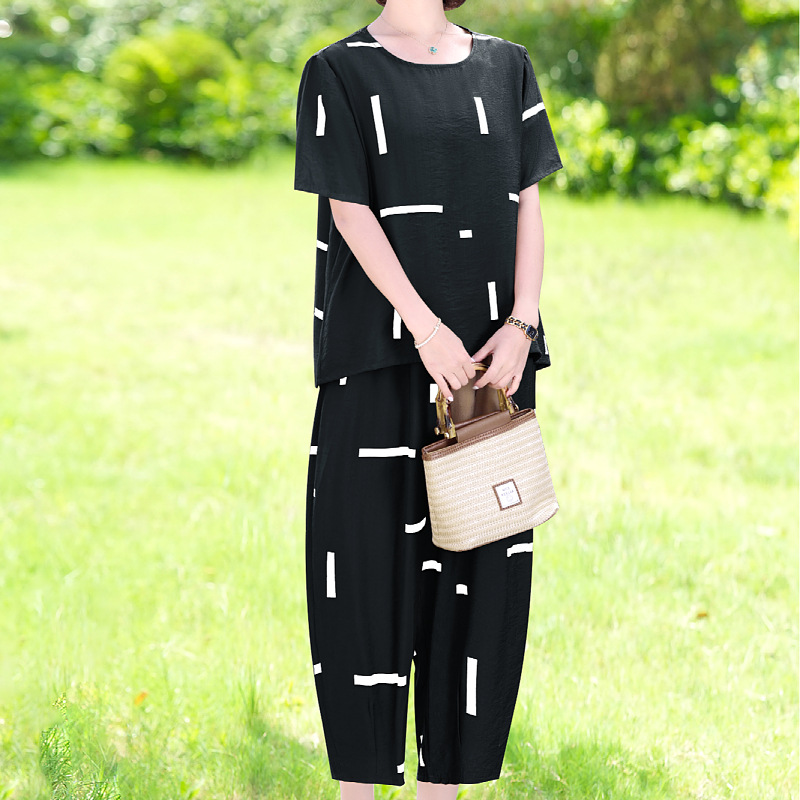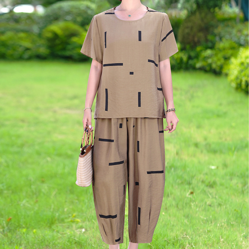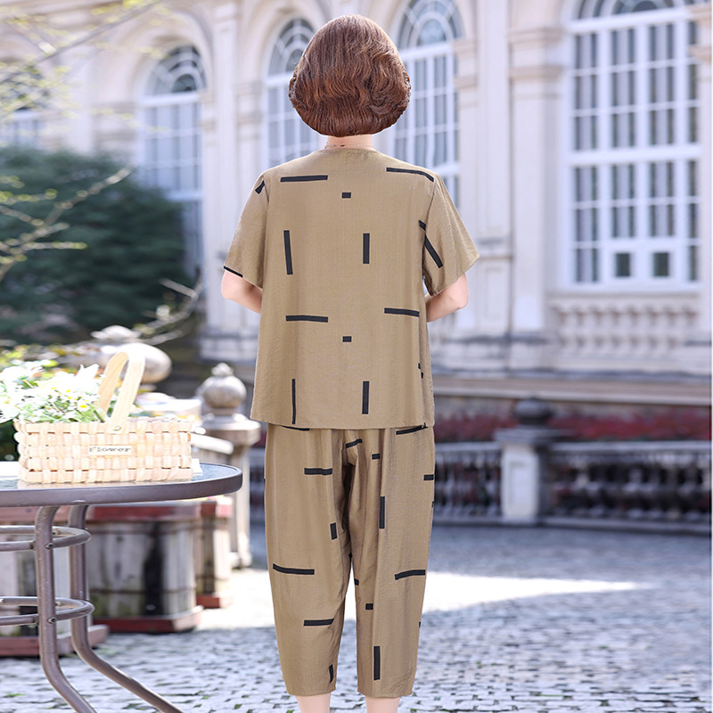 中年妈妈夏装短袖T恤中老年女士休闲棉麻套装宽松大码遮肚两件套
