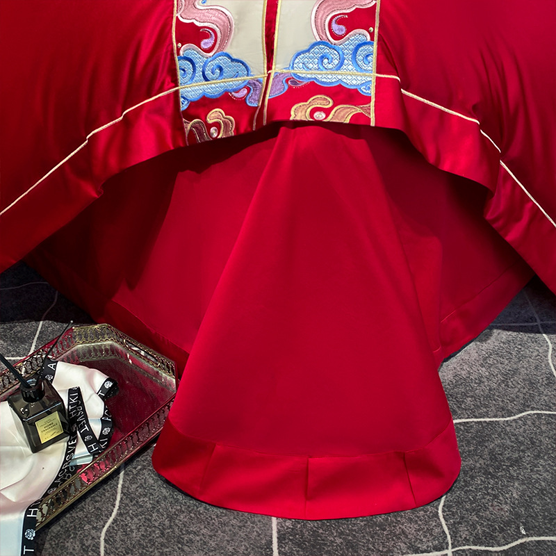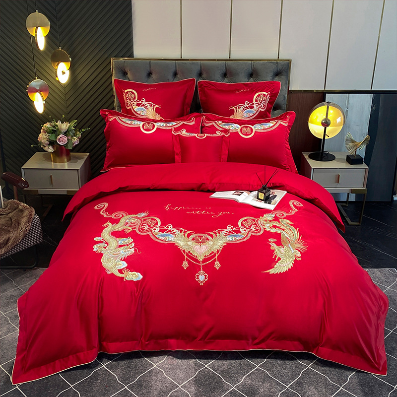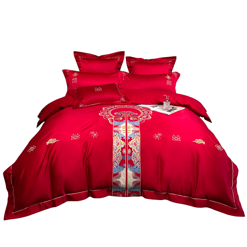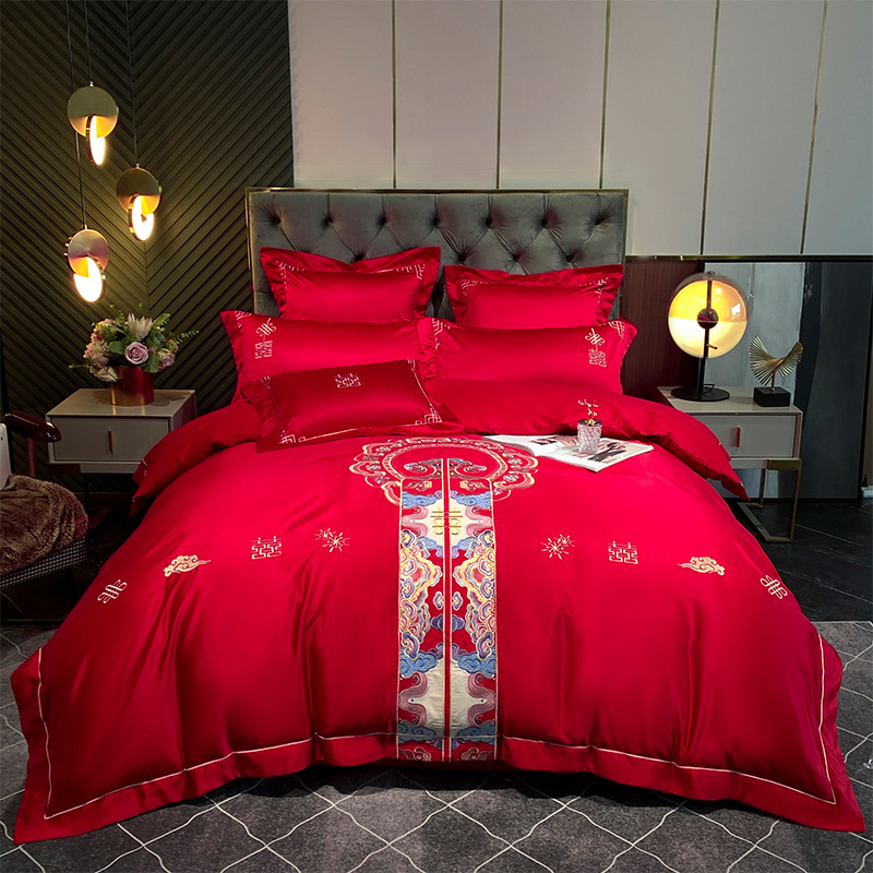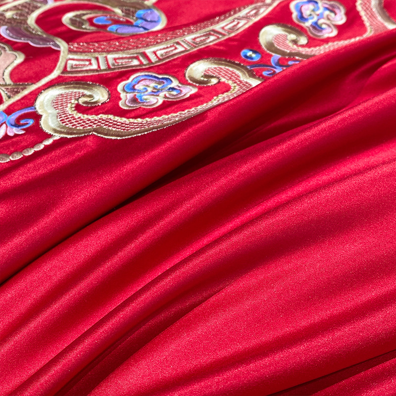 新中式婚庆四件套纯棉水洗真丝全棉刺绣大红结婚喜庆套件厂家批发
