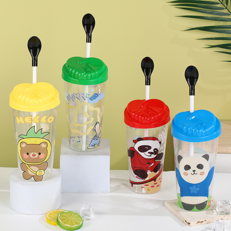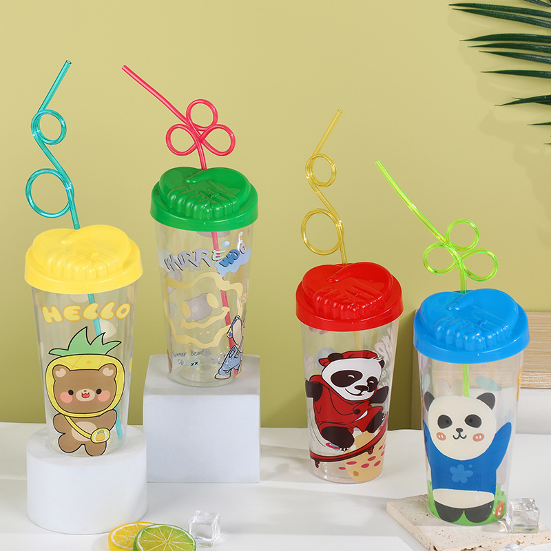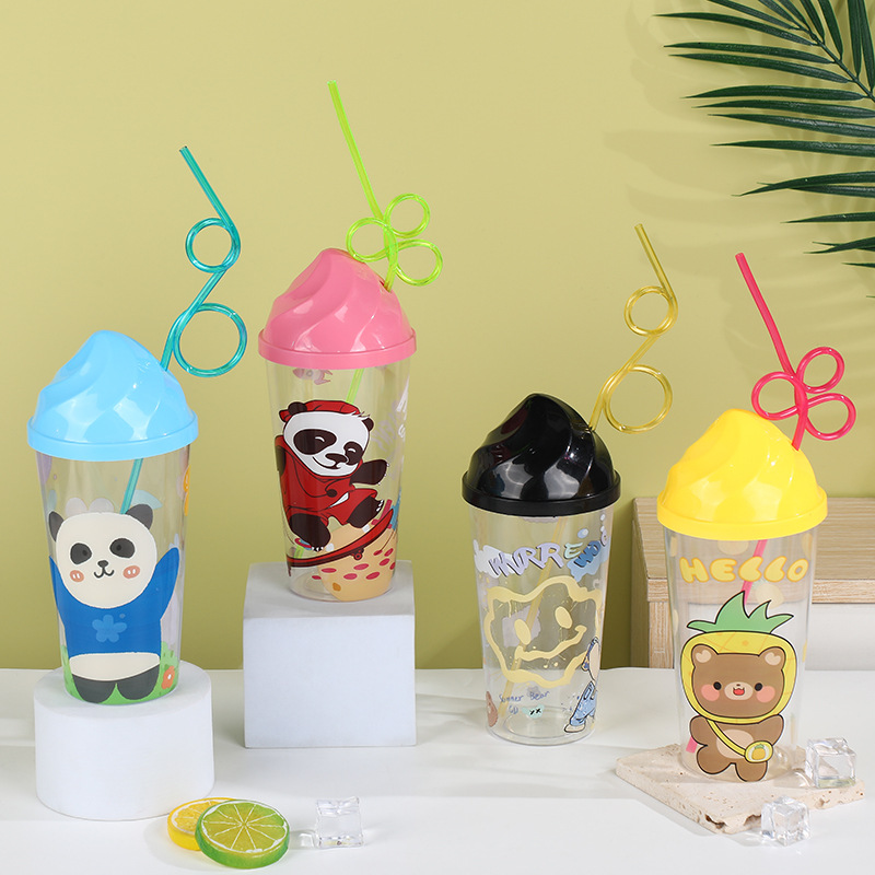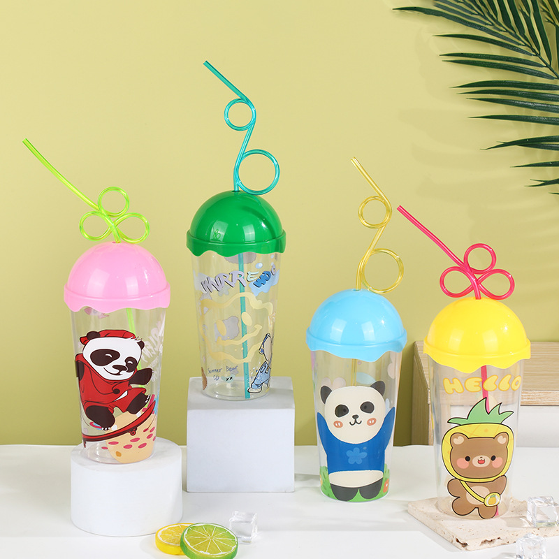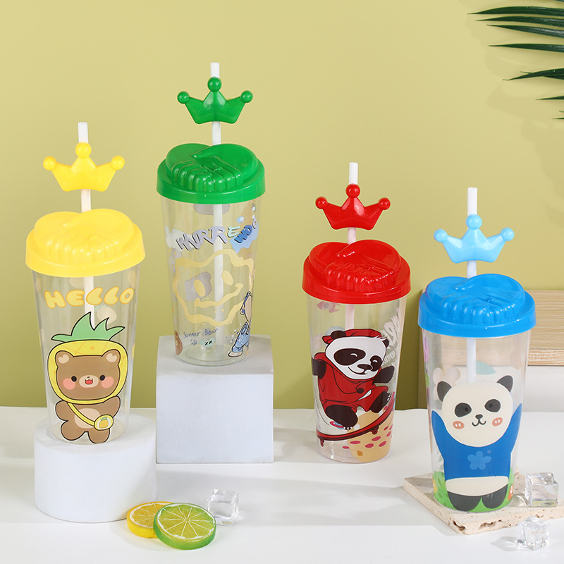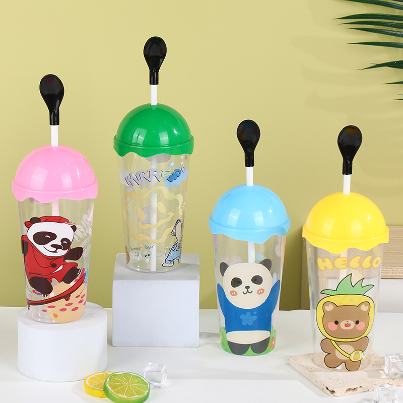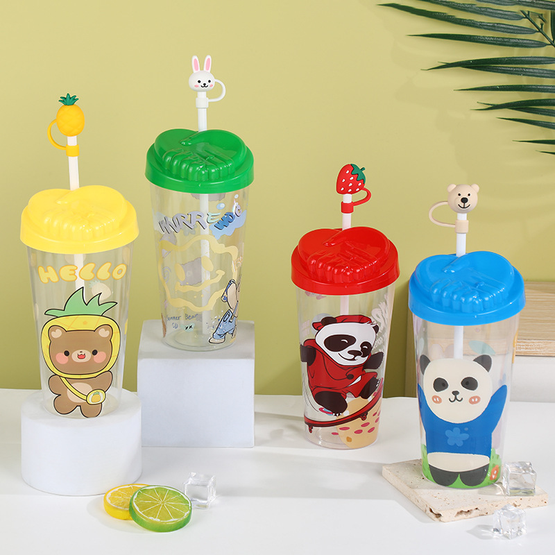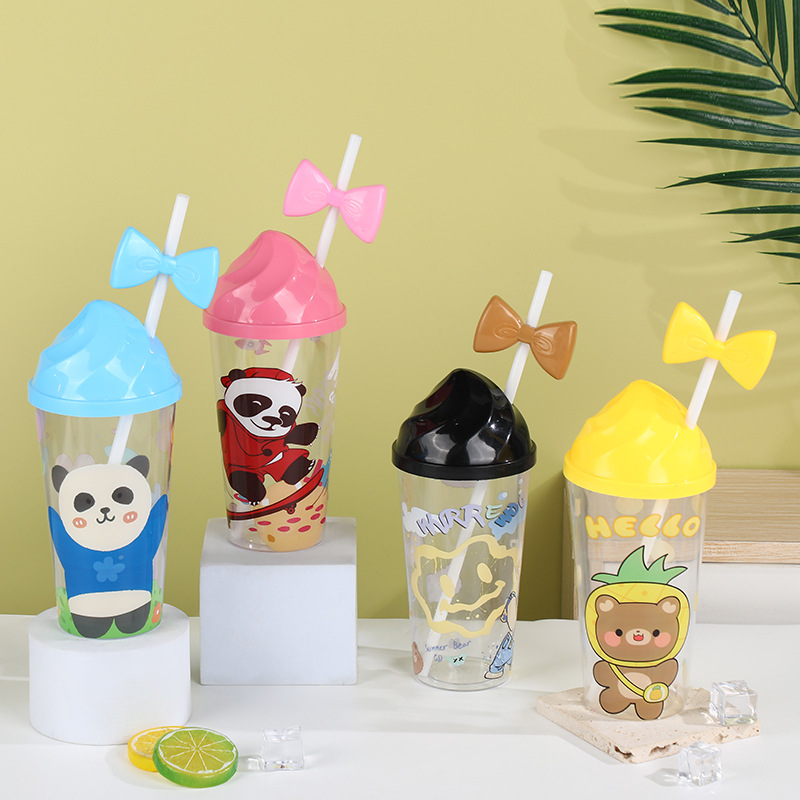 600ml儿童吸管杯批发 卡通熊猫PS塑料杯学生宝宝喝水果汁水杯