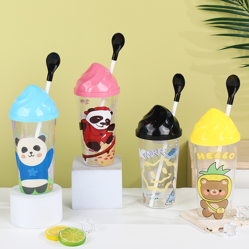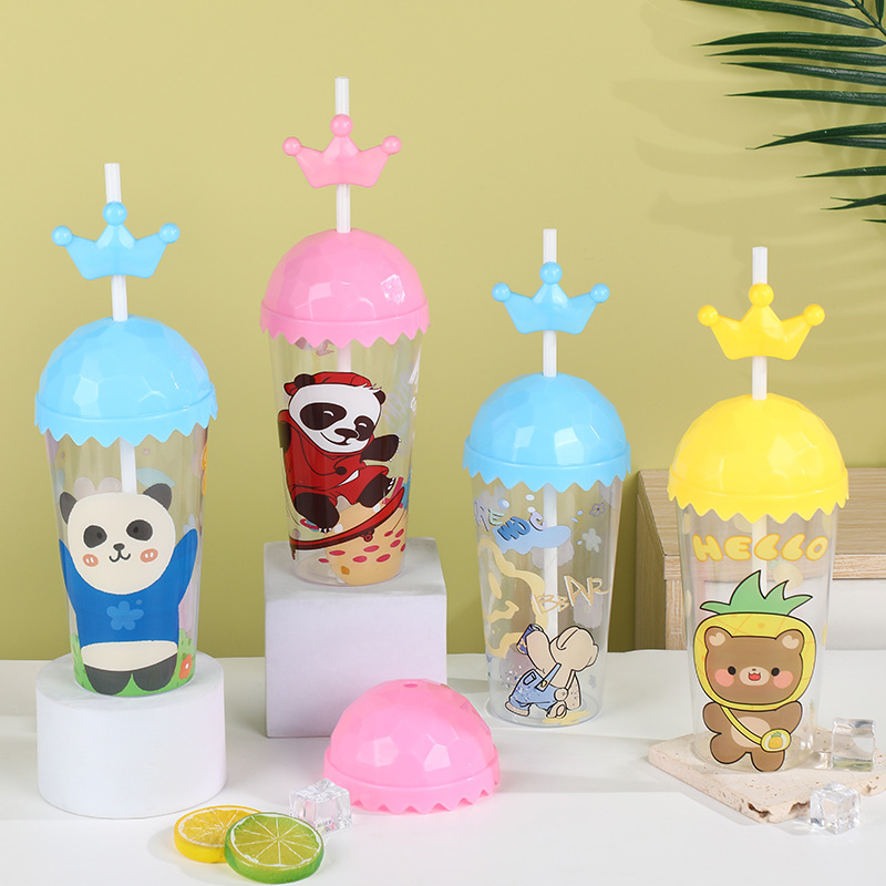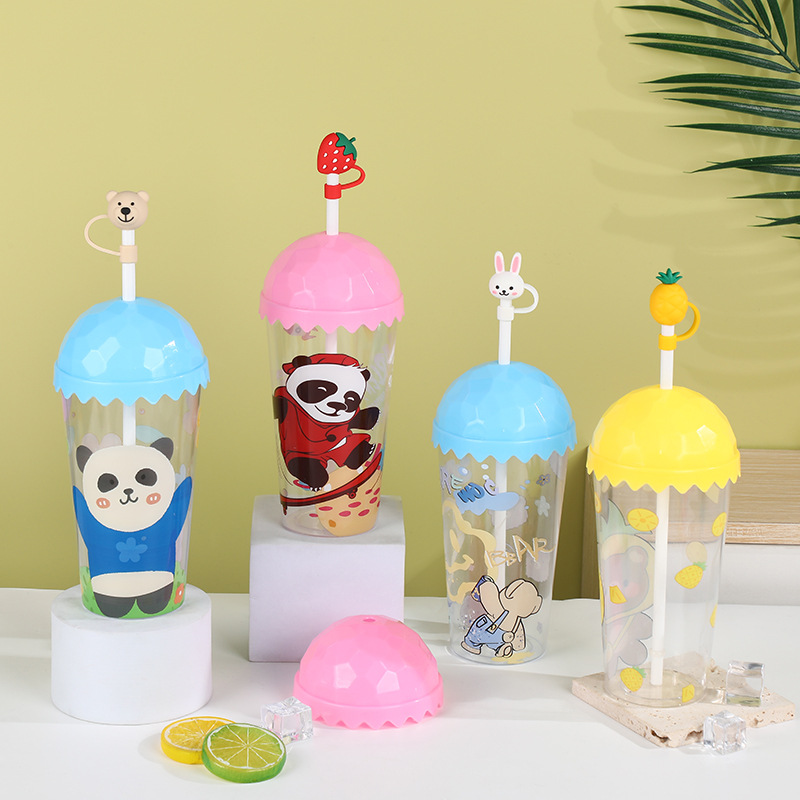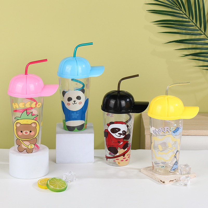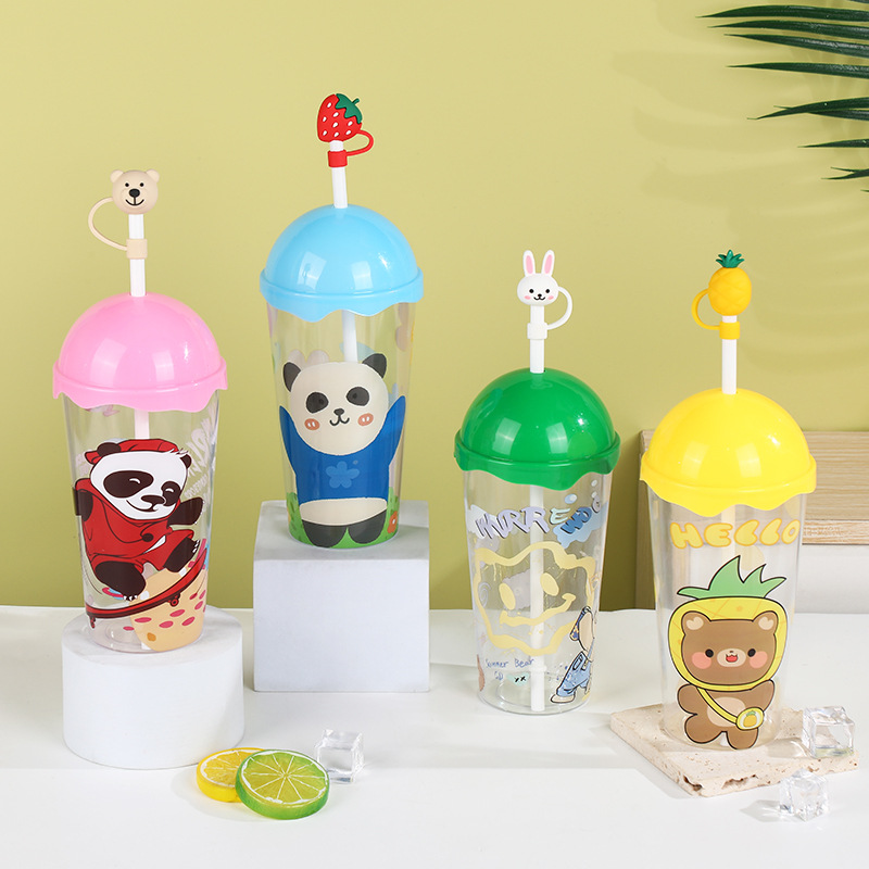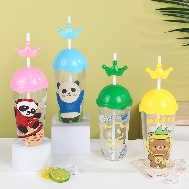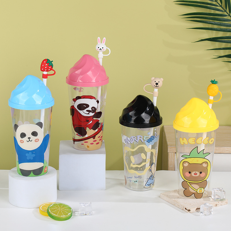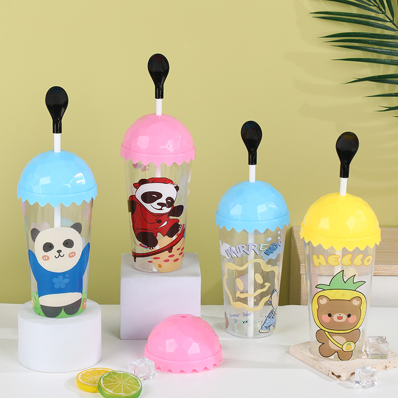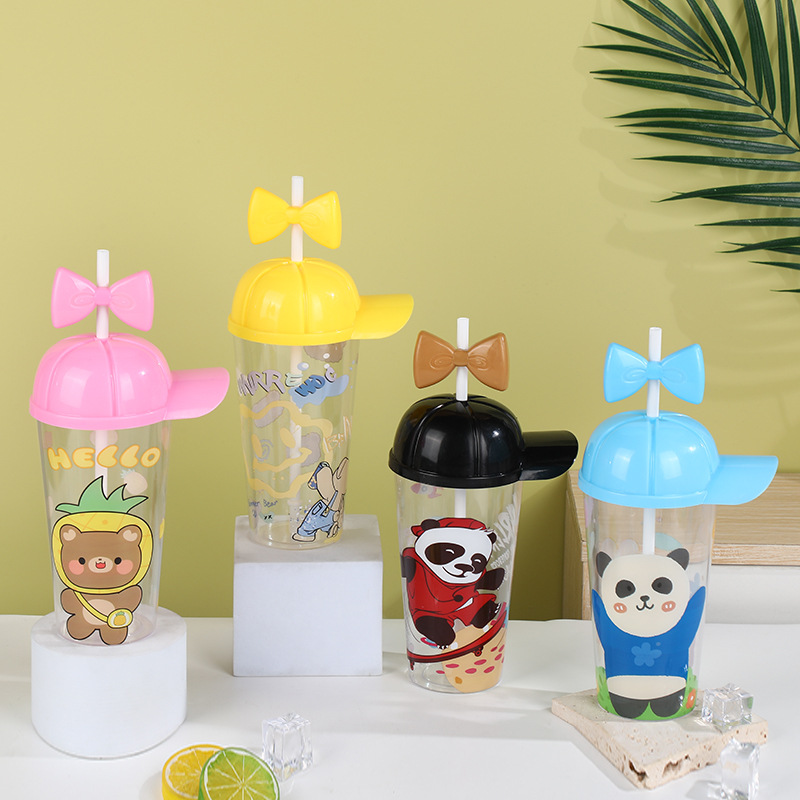 600ml儿童吸管杯批发 卡通熊猫PS塑料杯学生宝宝喝水果汁水杯