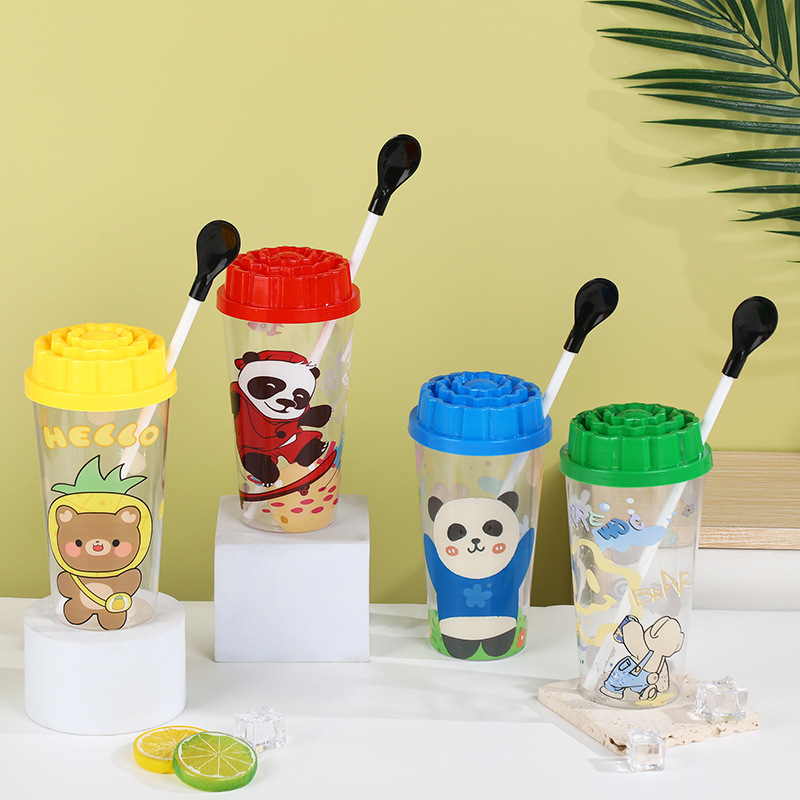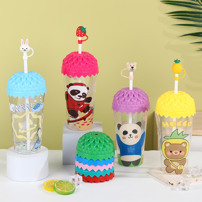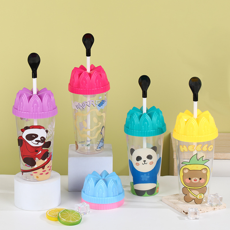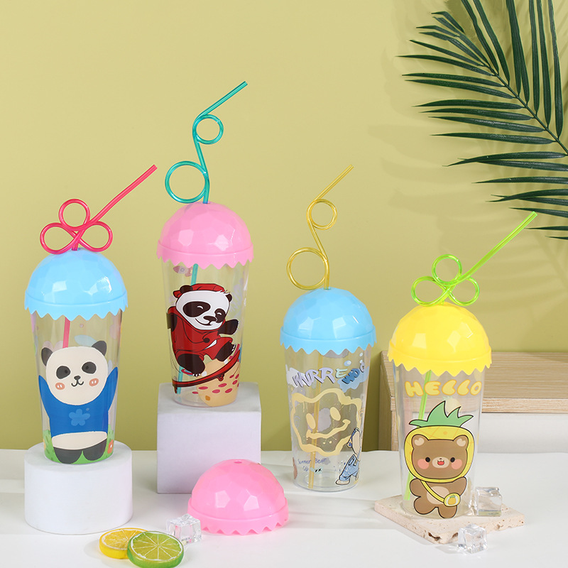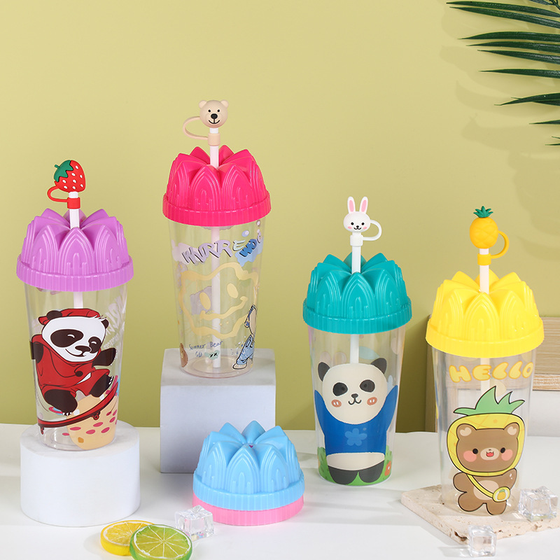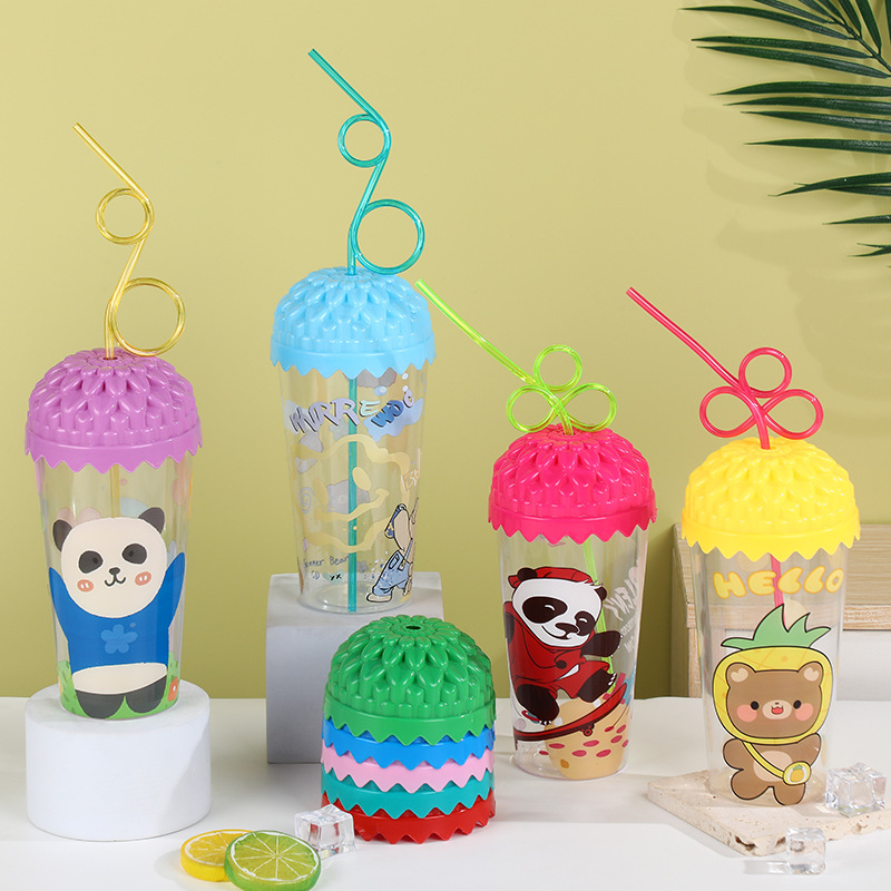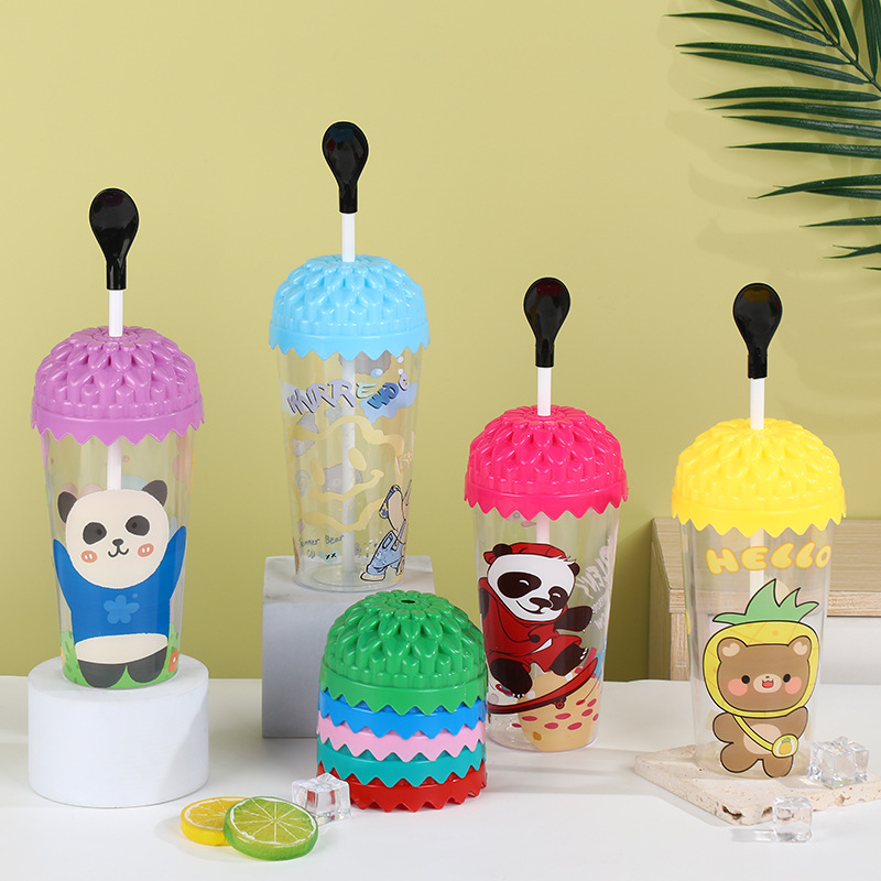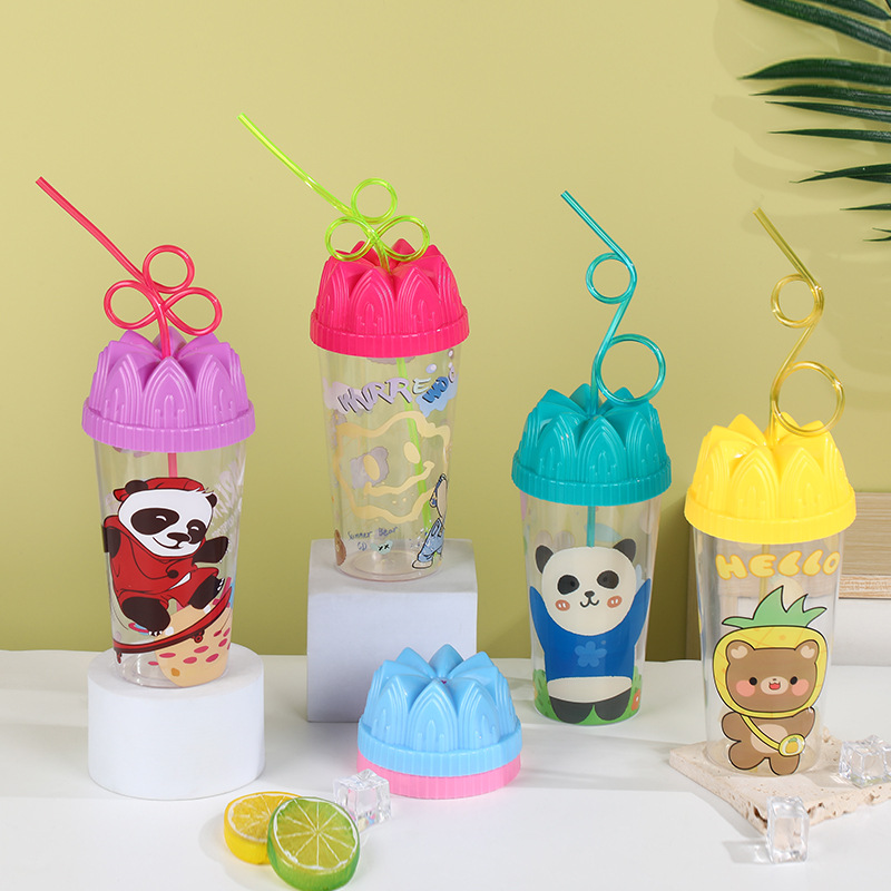600ml儿童吸管杯批发 卡通熊猫PS塑料杯学生宝宝喝水果汁水杯