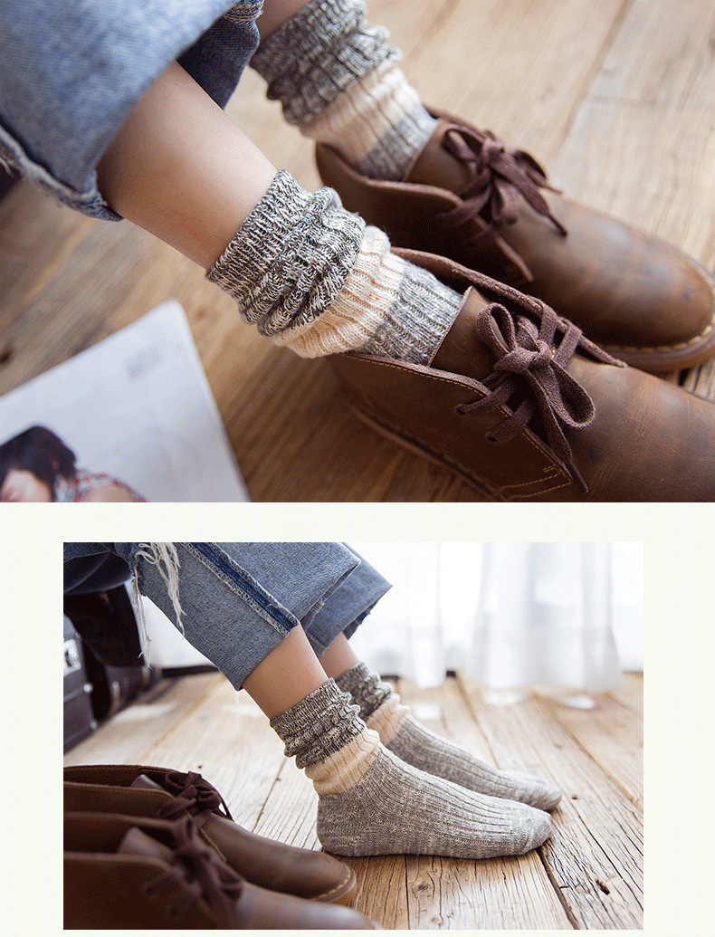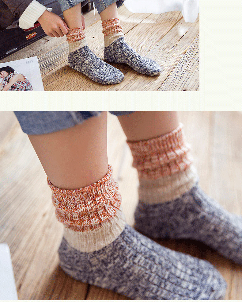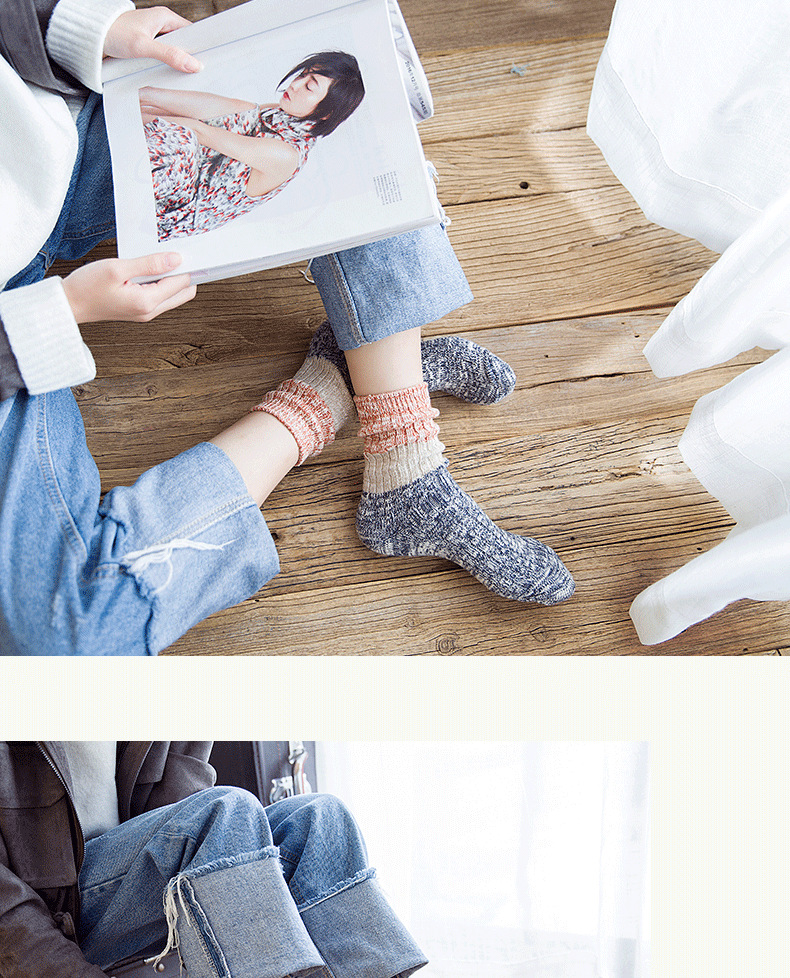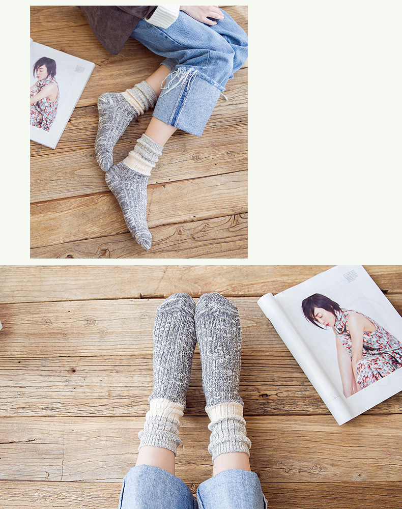 秋冬加厚毛线袜子女士高筒袜复古拼色堆堆袜长筒个性袜子短靴棉袜