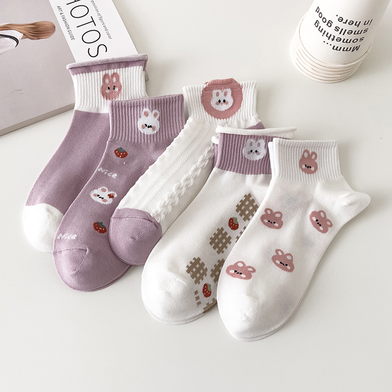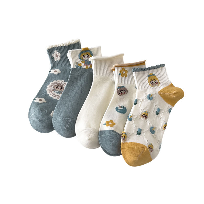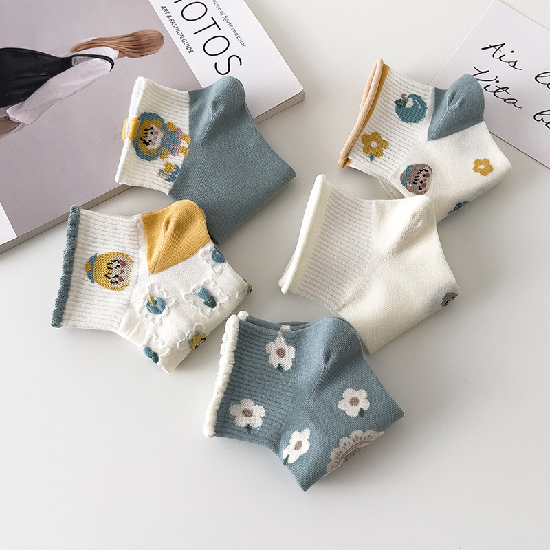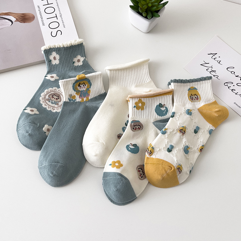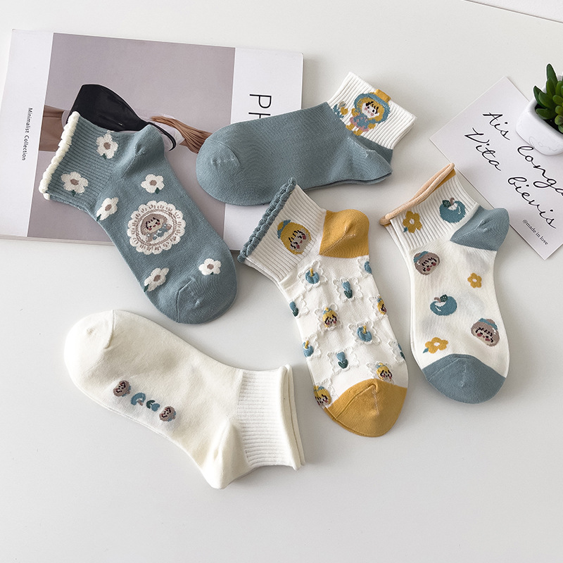 春夏新款薄棉袜女小清新蓝白小花卡通船袜低帮短款学院风短筒袜子
