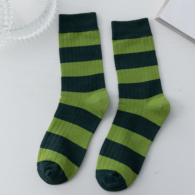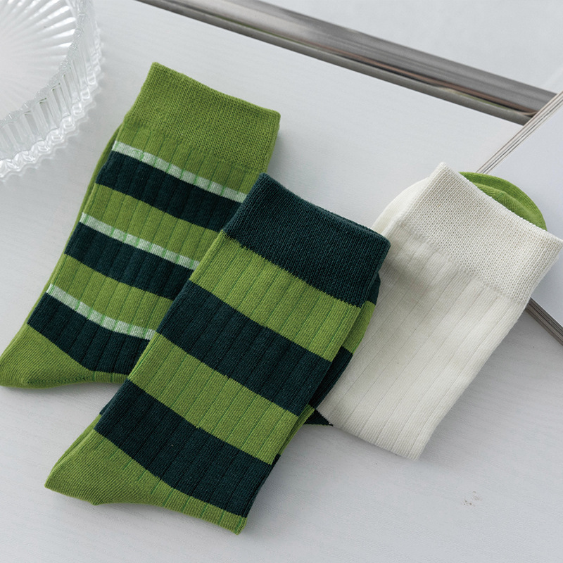 绿色条纹袜子女秋冬ins潮流拼色韩版外穿刺绣中筒袜小红书同款袜