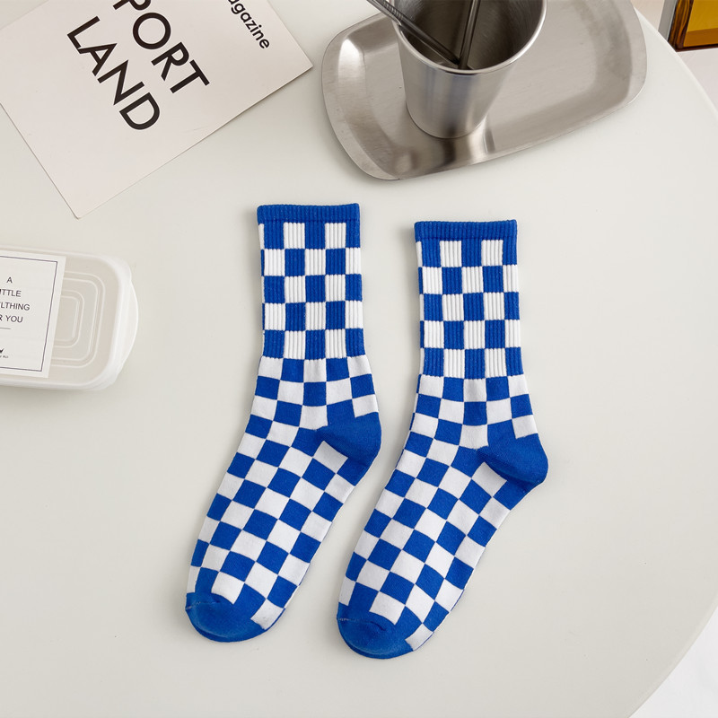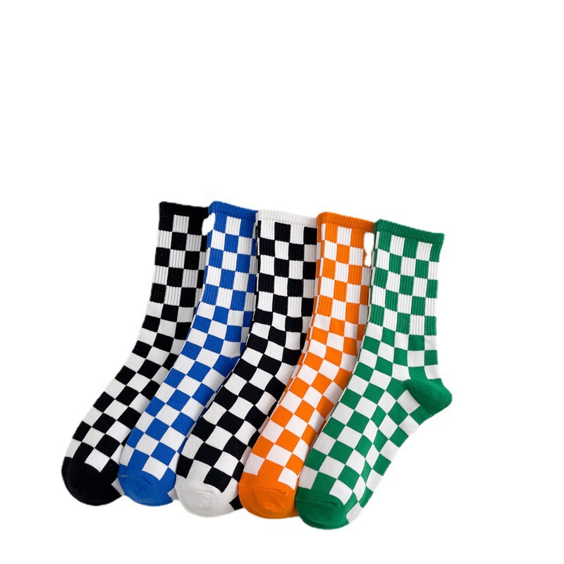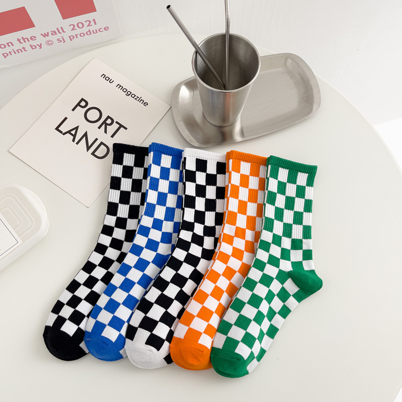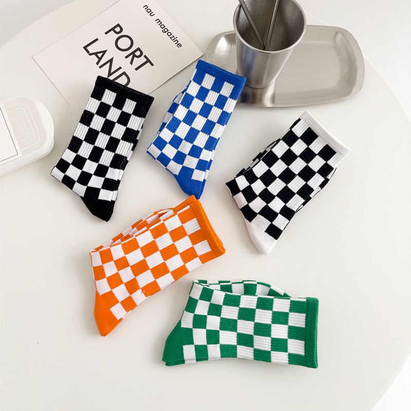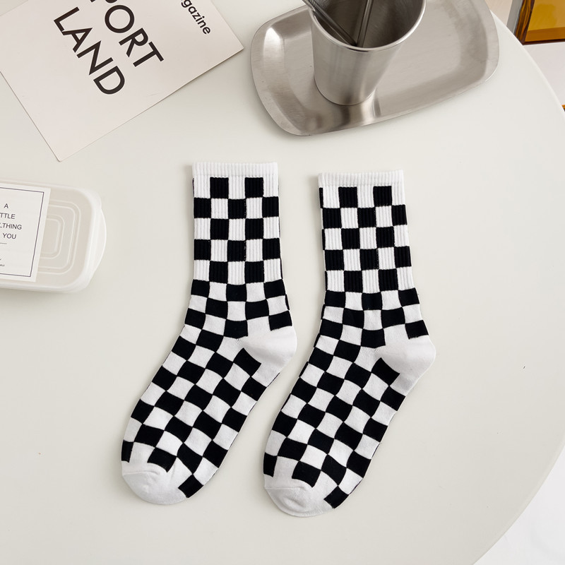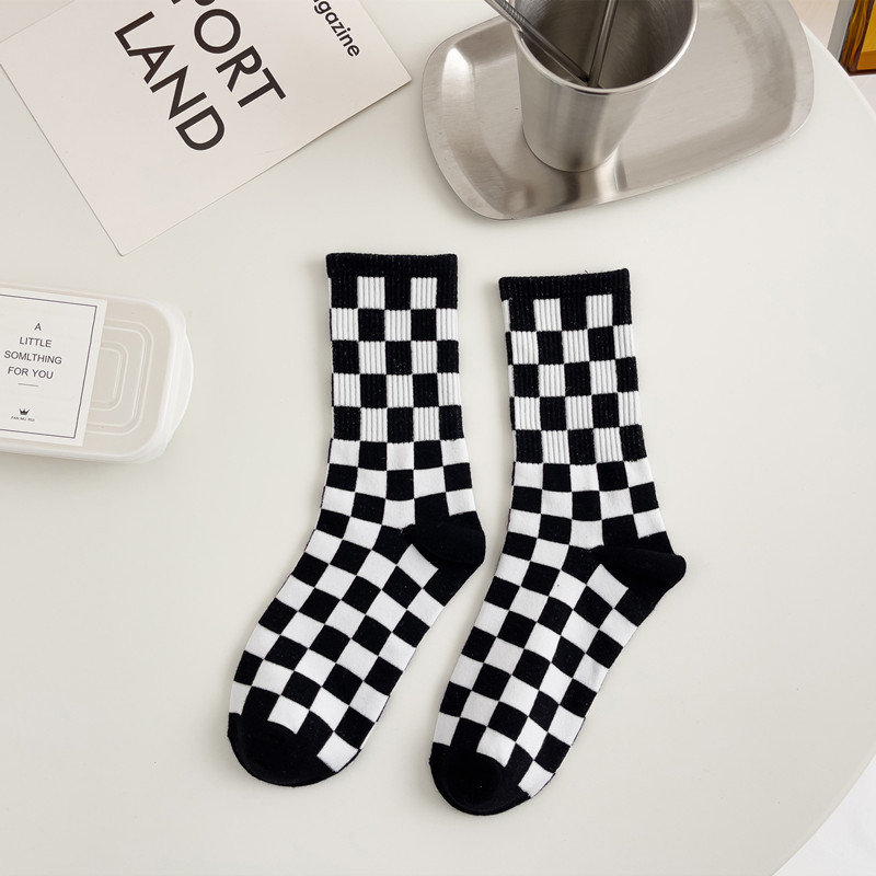 黑白棋盘格子长袜子女中筒袜韩国ins潮百搭时尚外穿纯色棉袜长筒