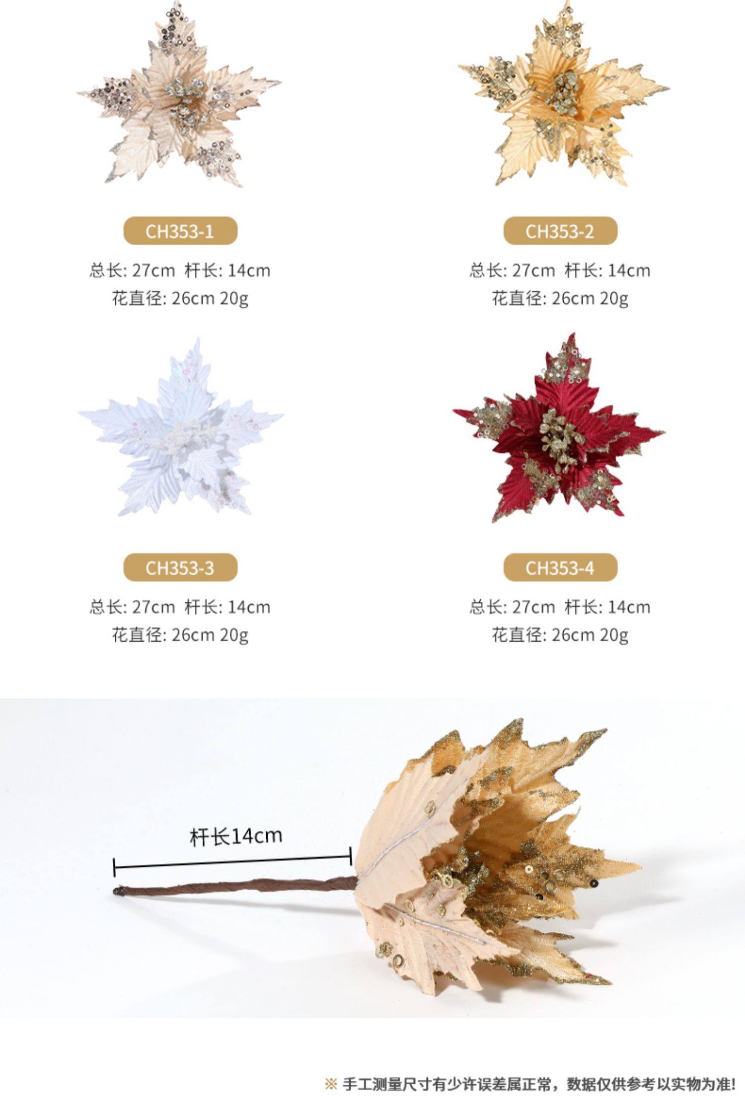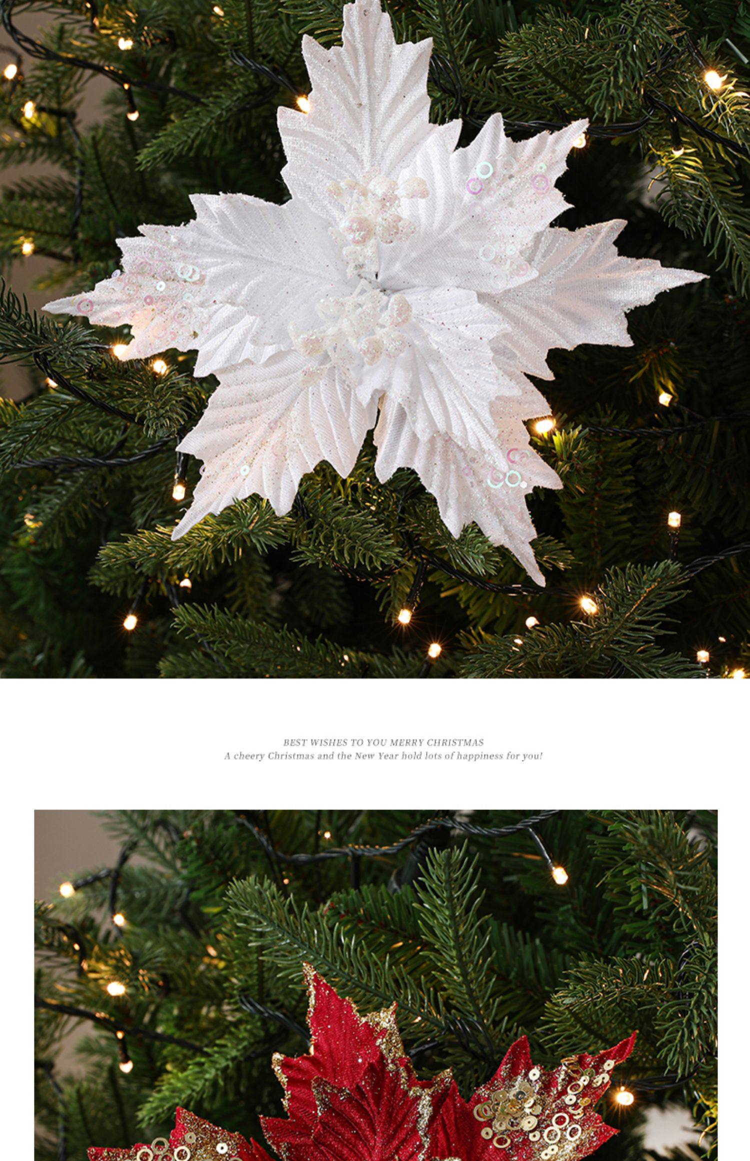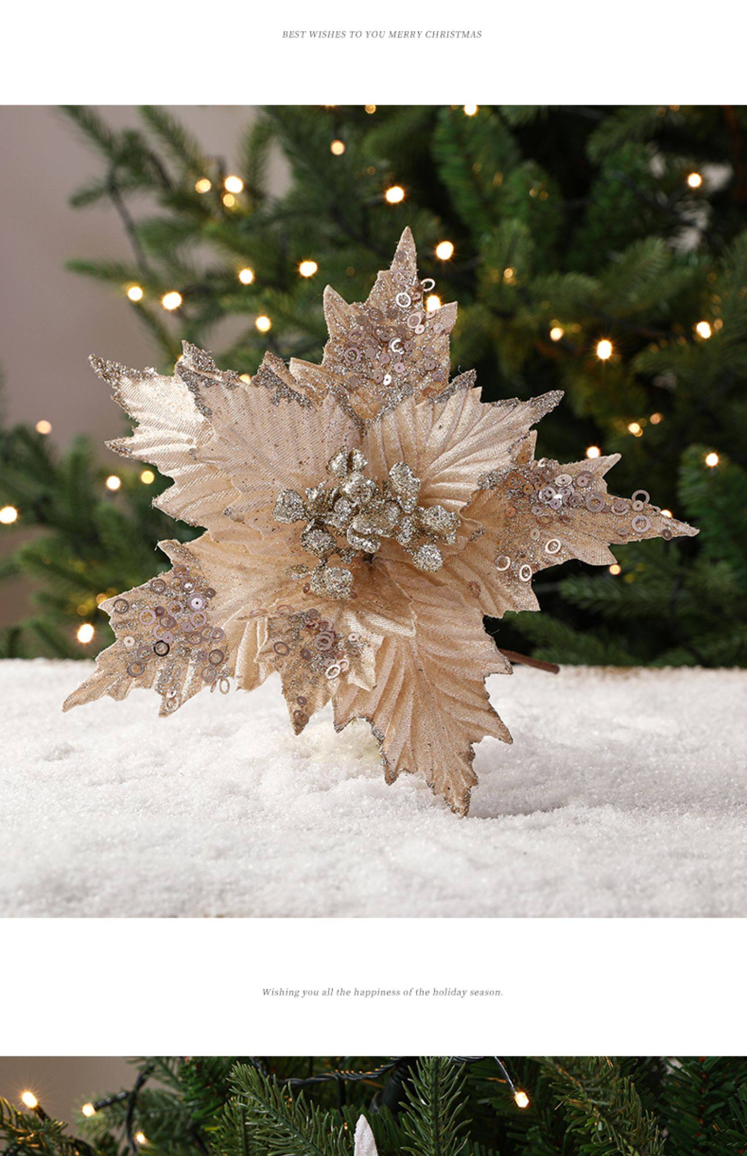 圣诞节26cm金色白色红色亮片绒布仿真圣诞花DIY插枝叶装饰品