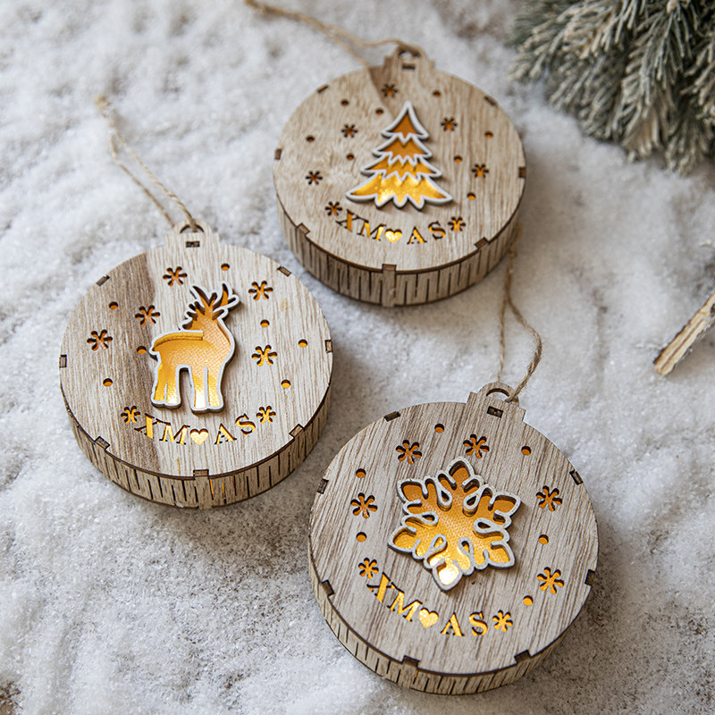 圣诞节装饰圆形带灯木质挂件创意圣诞树装饰品配饰挂饰吊饰