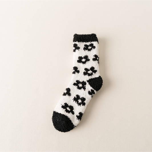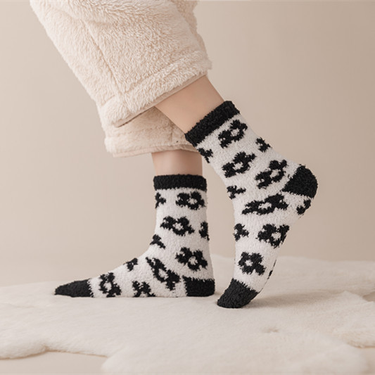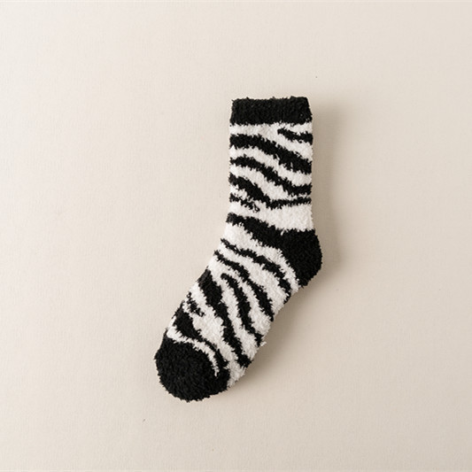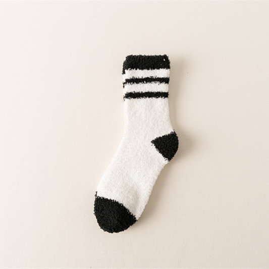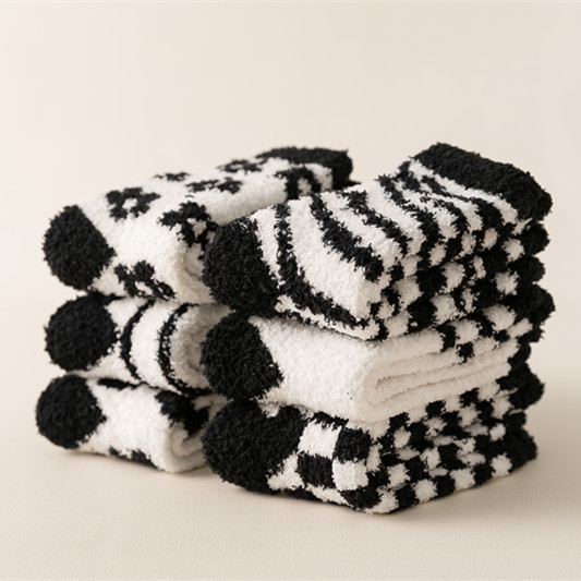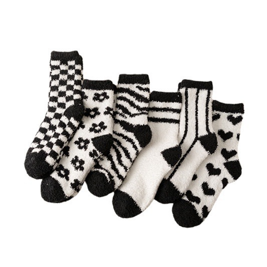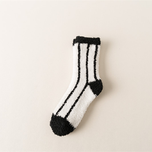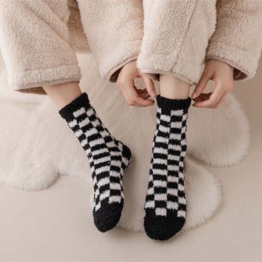 黑白系列珊瑚绒女袜不易掉毛条纹格子保暖地板袜家居睡眠袜批发