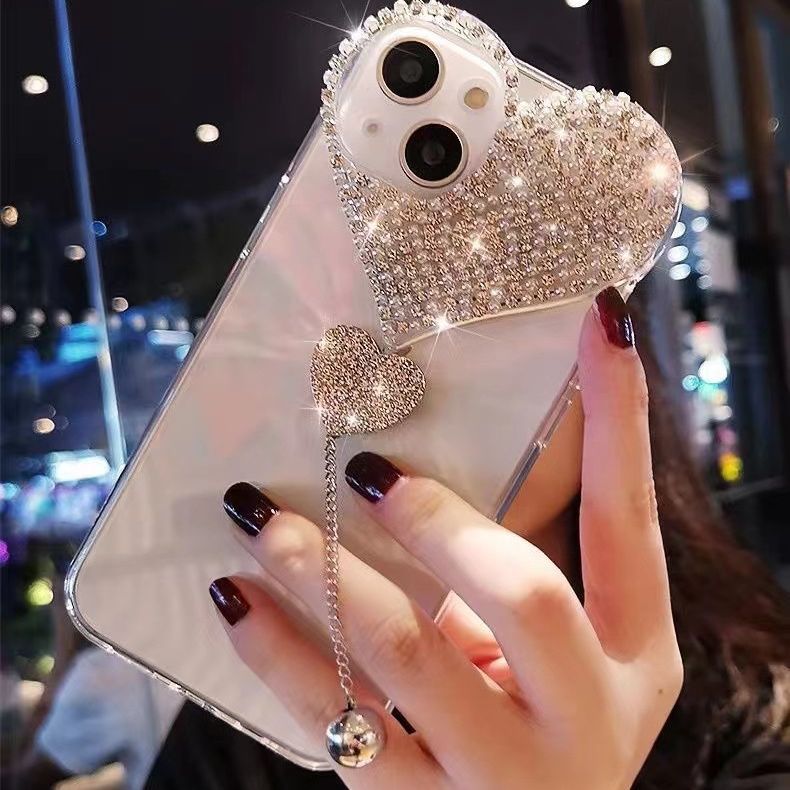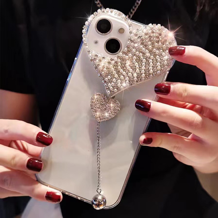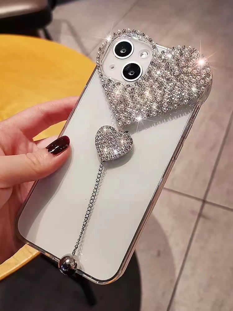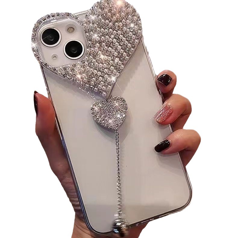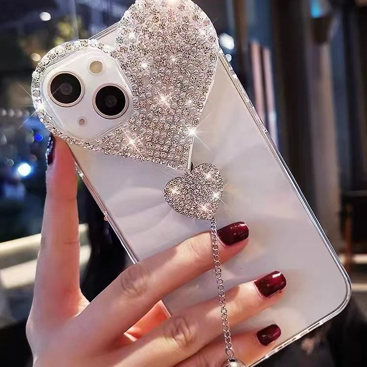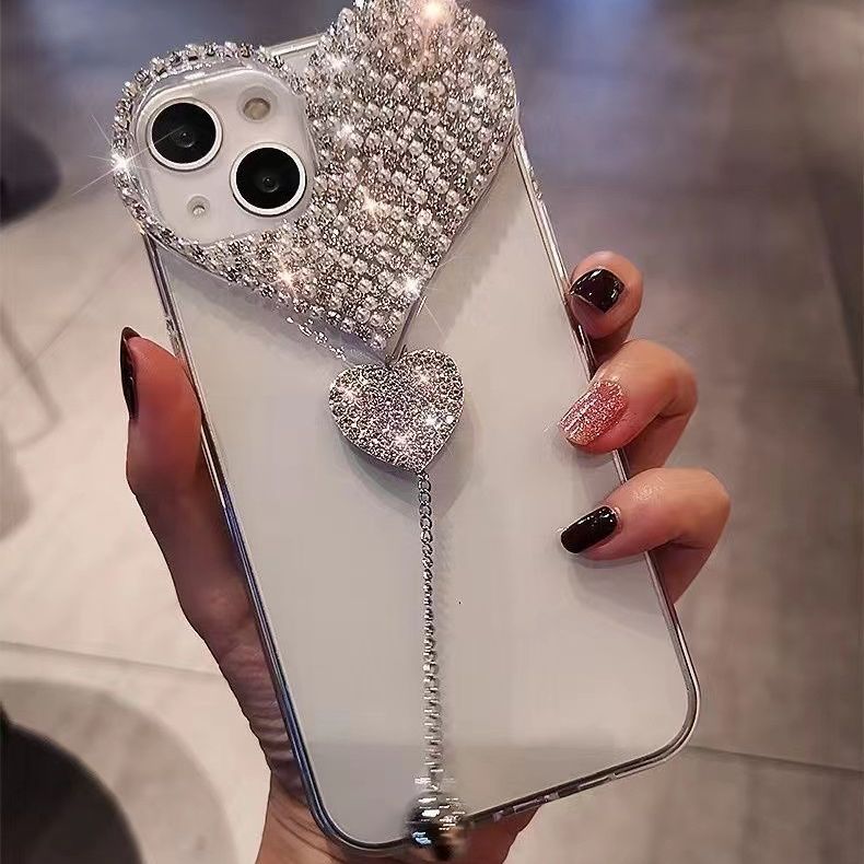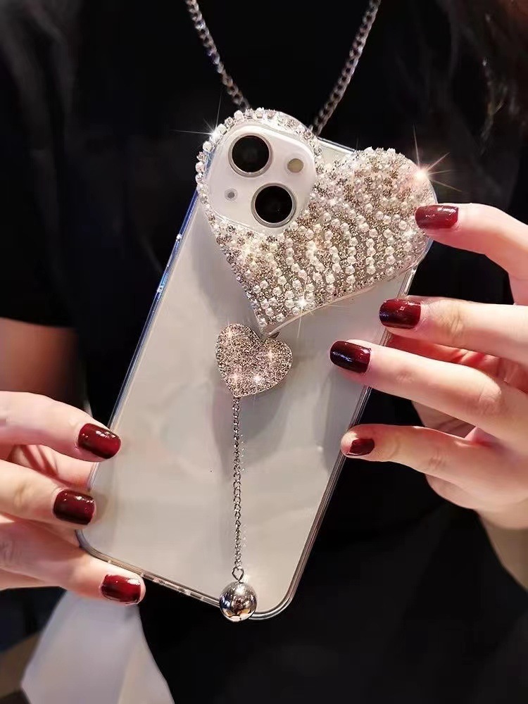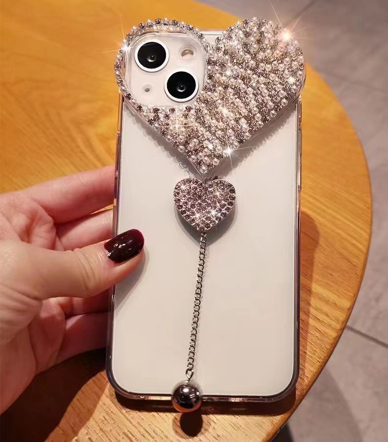 适用苹果14promax手机壳水钻爱心吊坠iPhone13pro全包奢华保护套